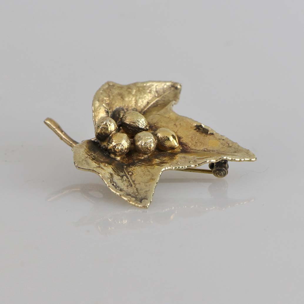 Broche i forgyldt sterling sølv formet som et trefingeret blad med fem bær