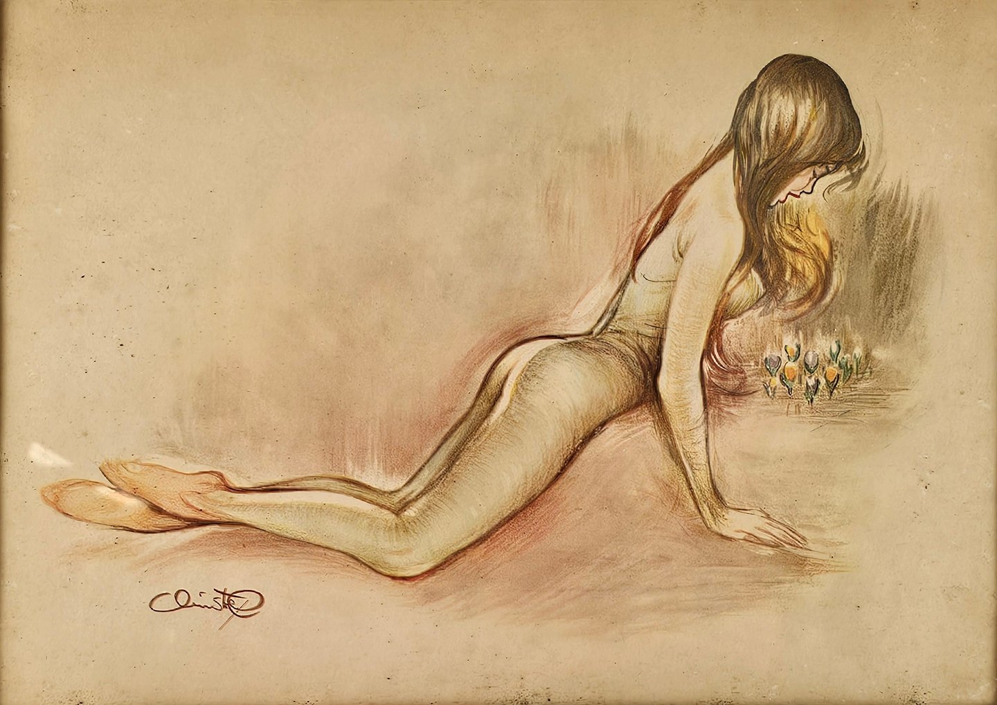 Tryk af en kvinde som ligger ved nogle blomster. Fra 1940'erne