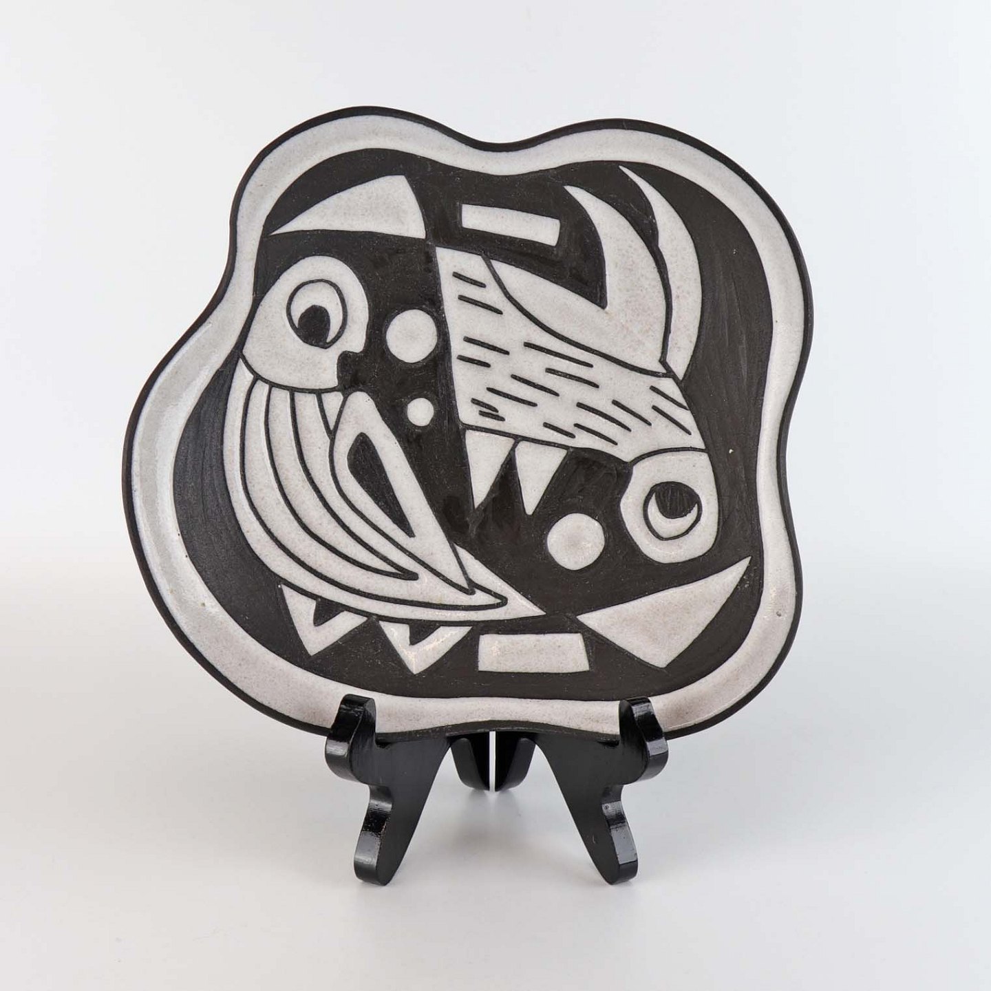 Fad i keramik fra Negro serien med abstrakt fugle motiv på mørk baggrund. Nr. 5608-1