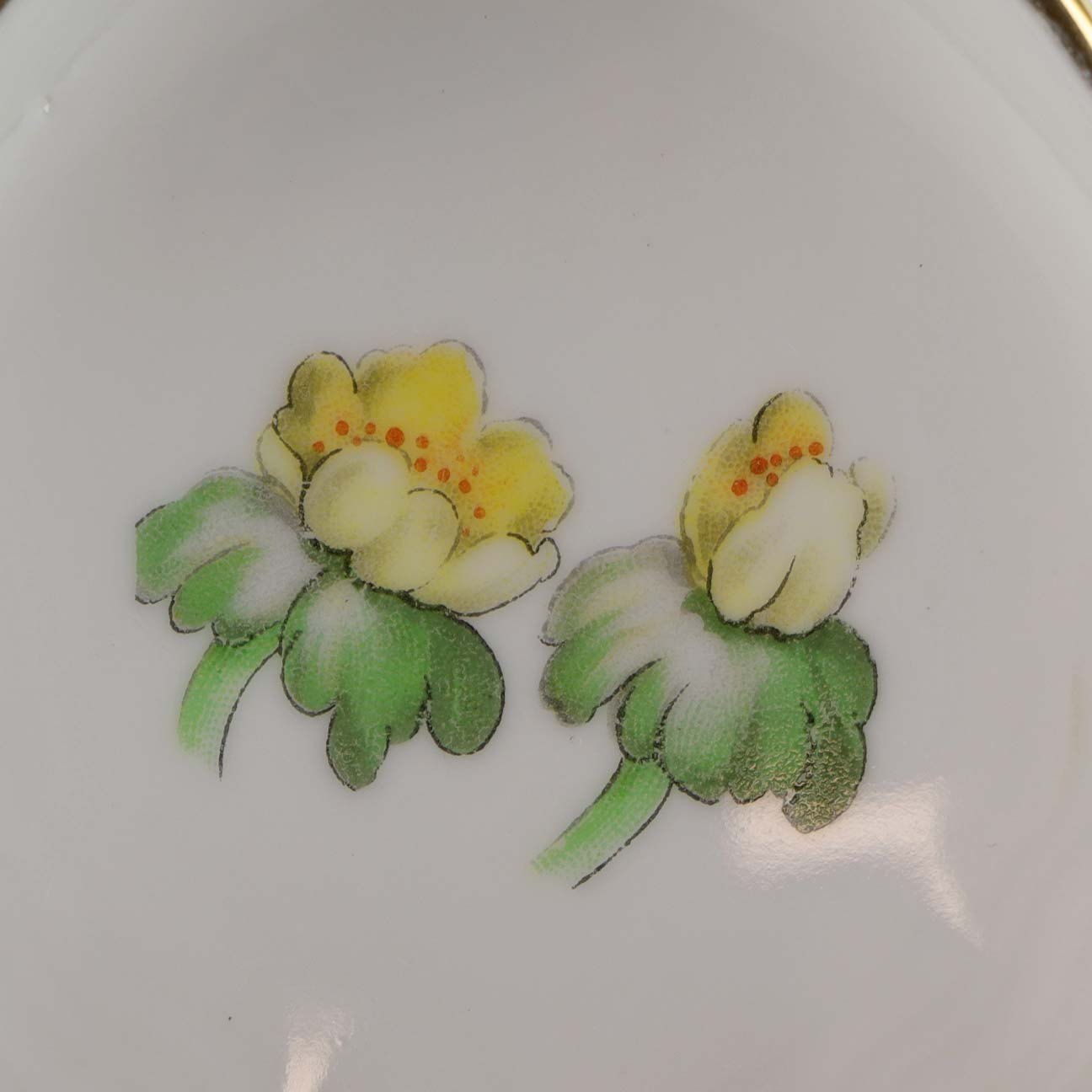 Hvidt porcelæn i skælform med dekoration af gule blomster og guldkant