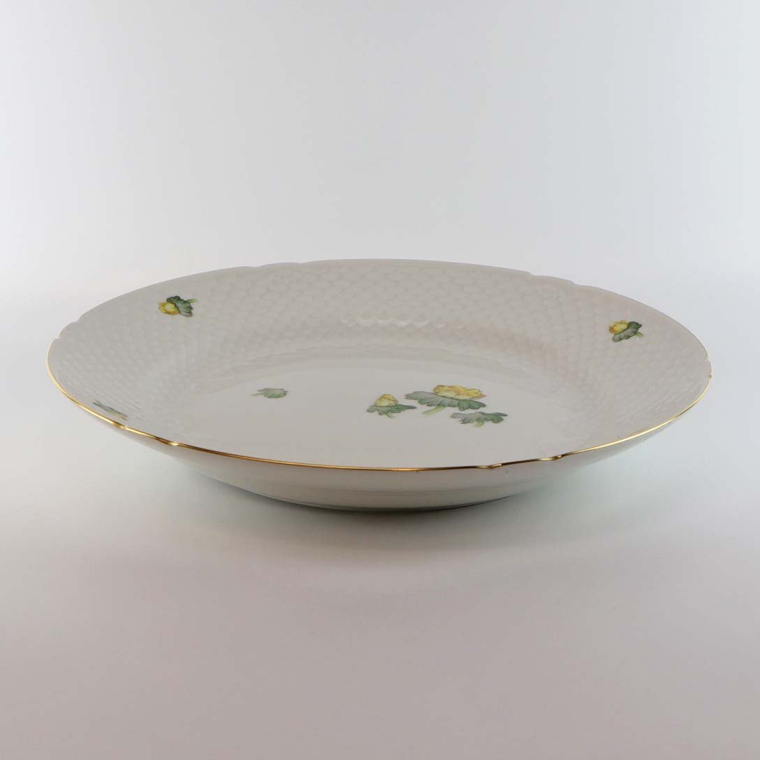 Hvidt porcelæn i skælform med dekoration af gule blomster og guldkant
