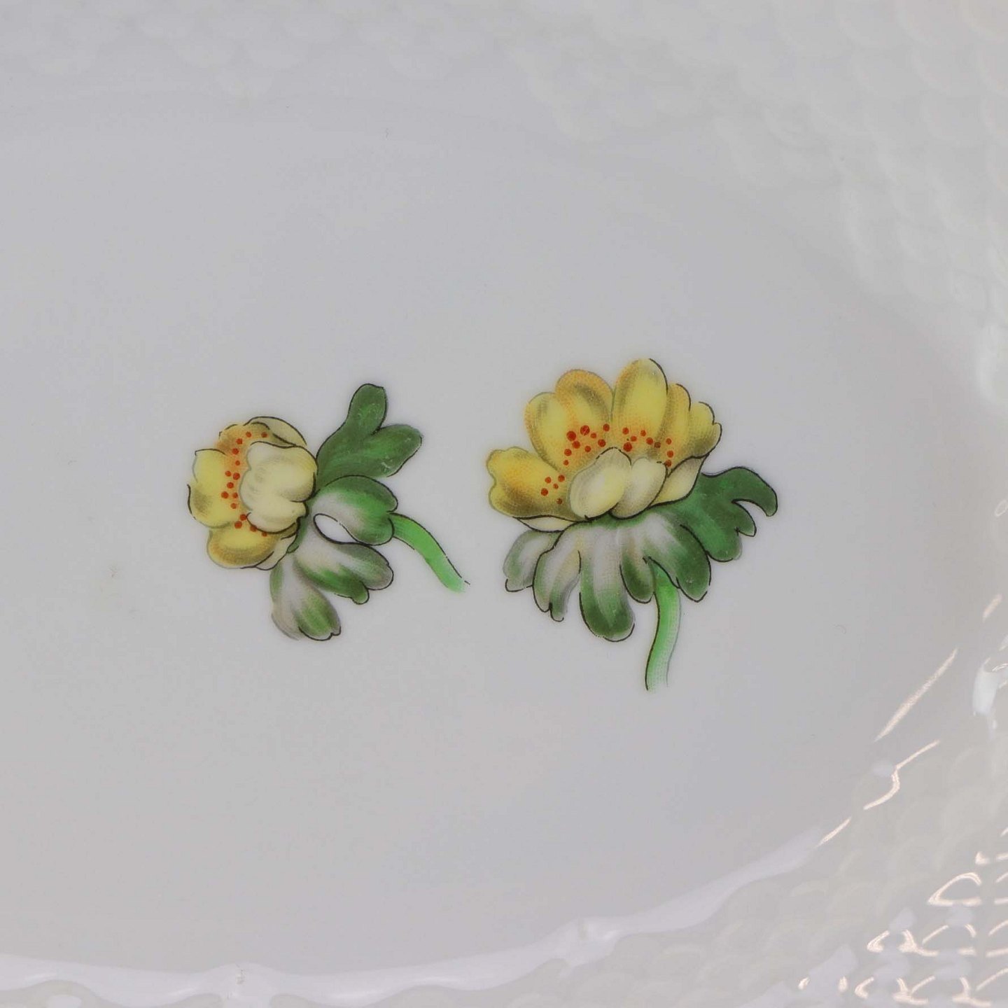 Hvidt porcelæn i skælform med dekoration af gule blomster og guldkant