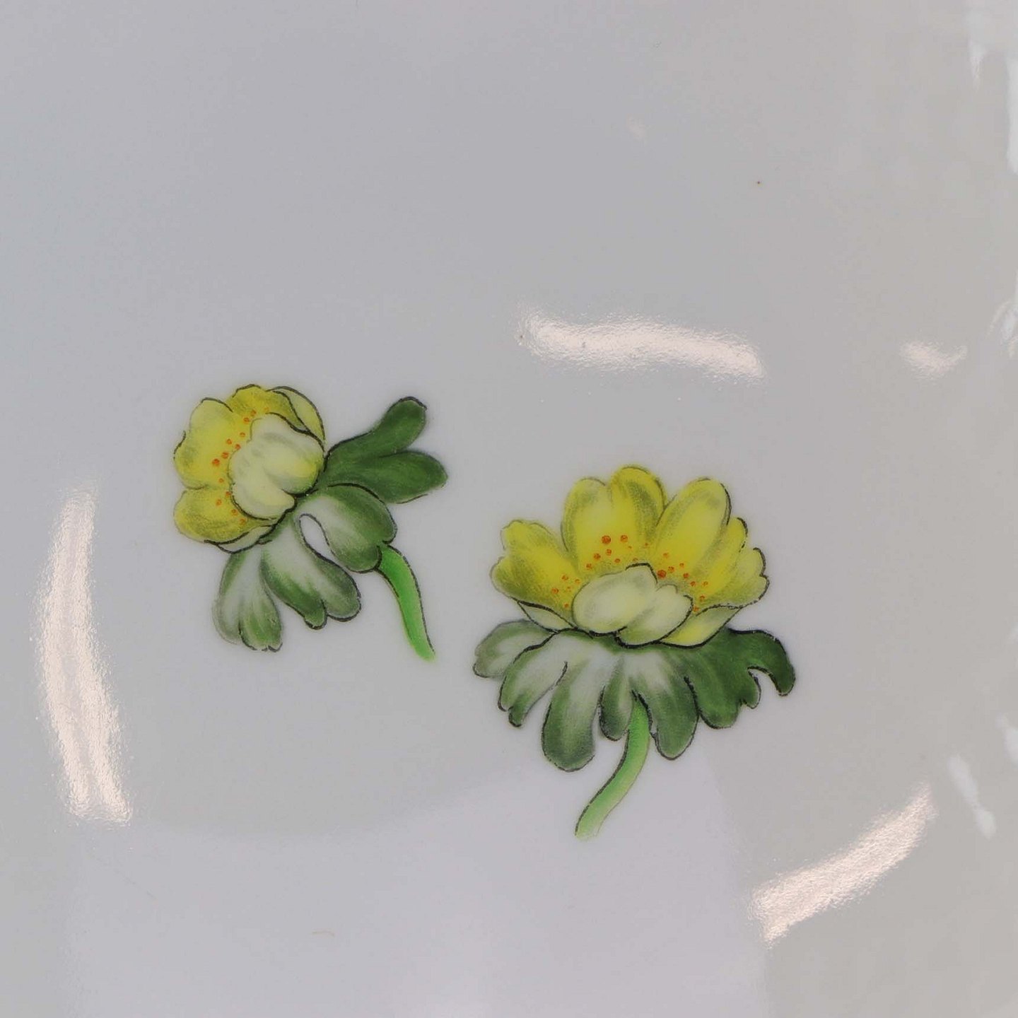 Hvidt porcelæn i skælform med dekoration af gule blomster og guldkant