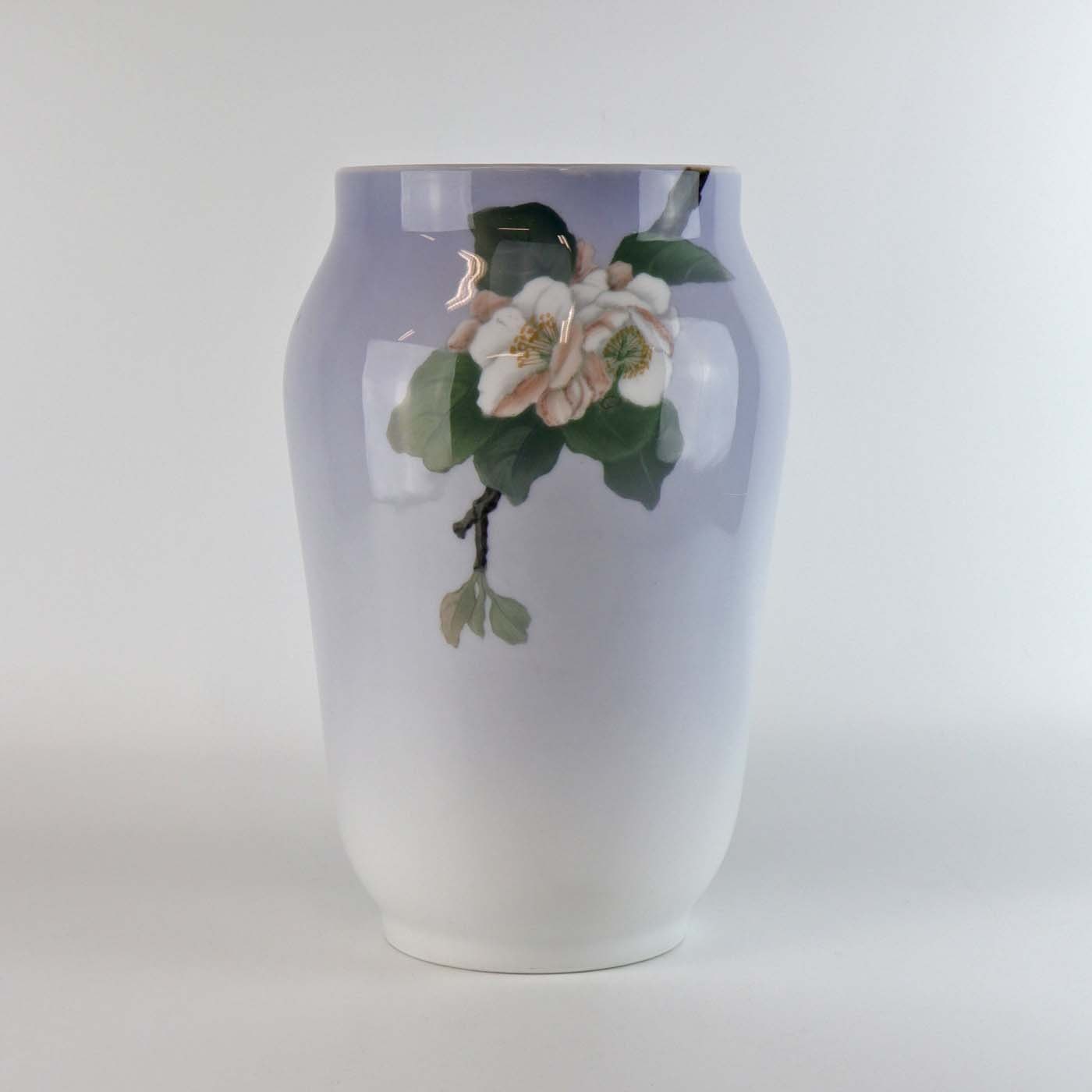 Kongelig vase i porcelæn med motiv af grene med æbleblomster på gradueret blå baggrund. Nr. 53/1217
