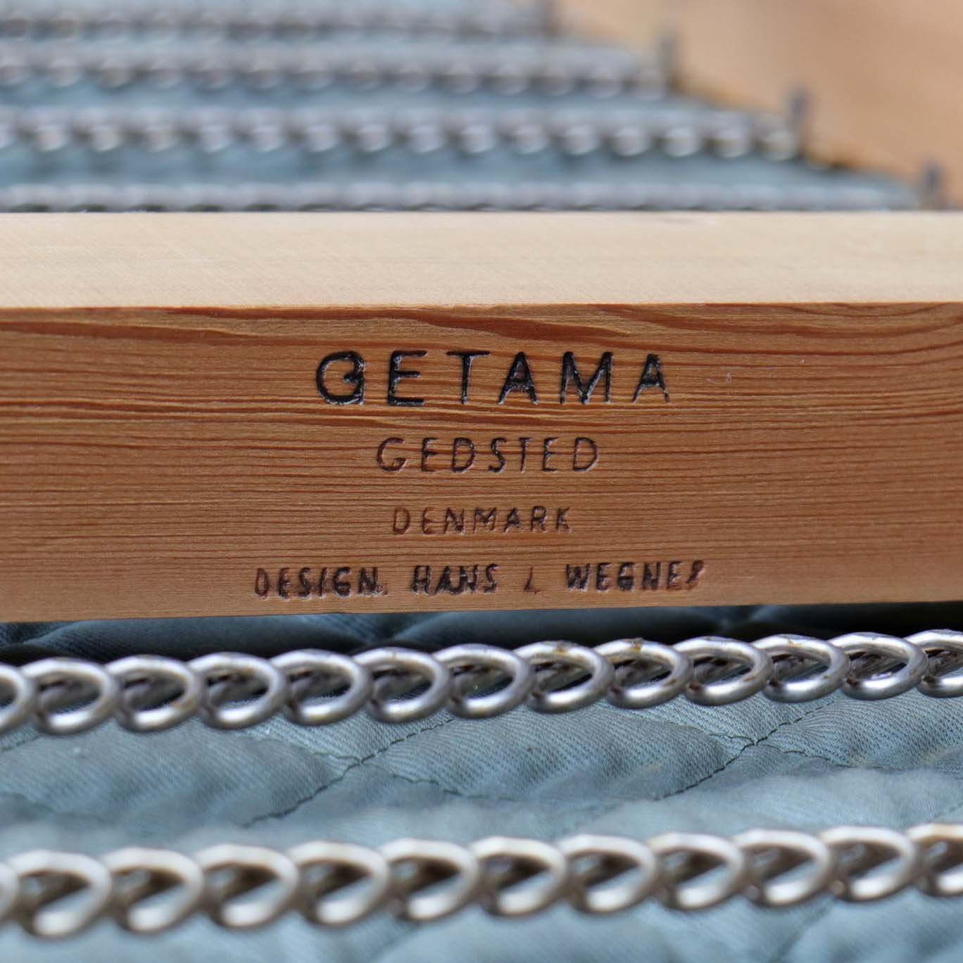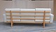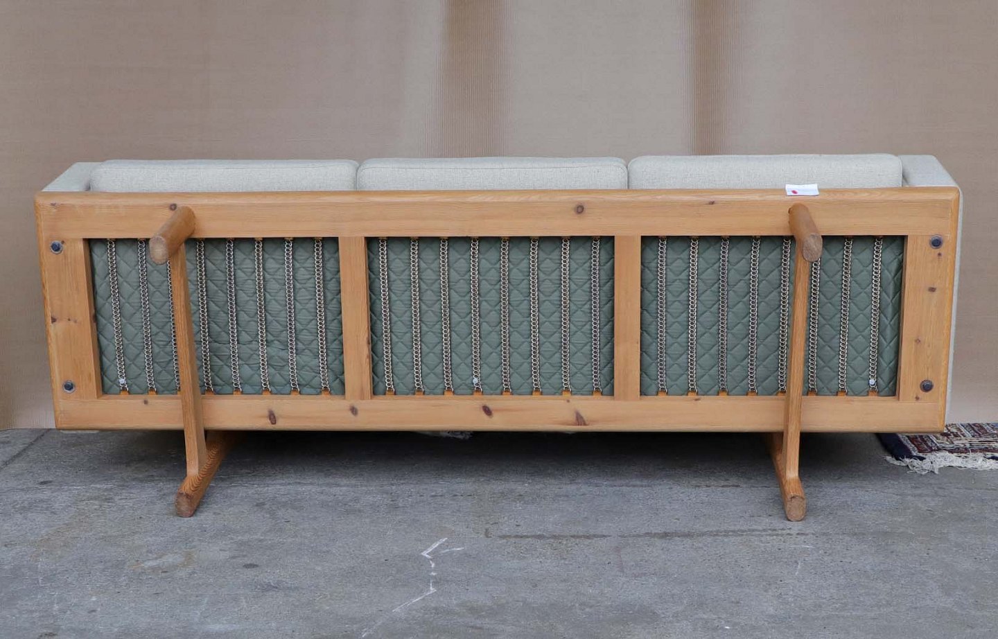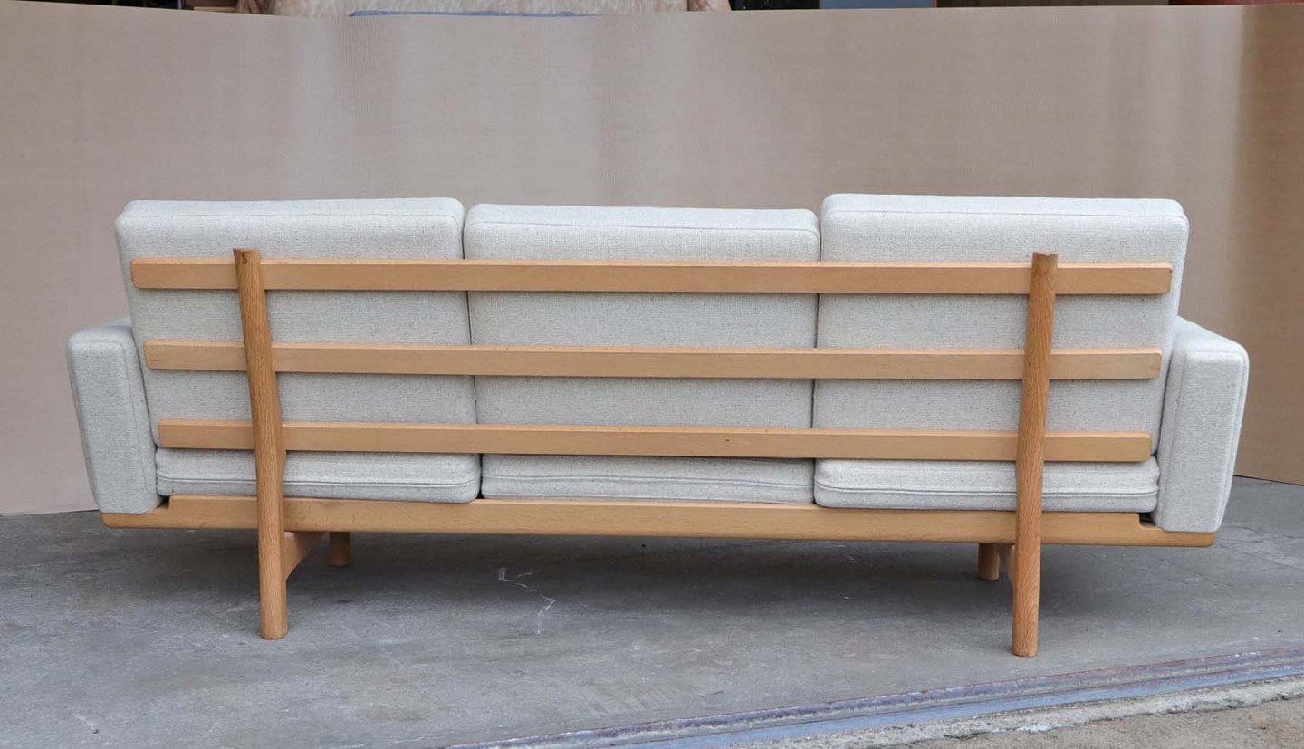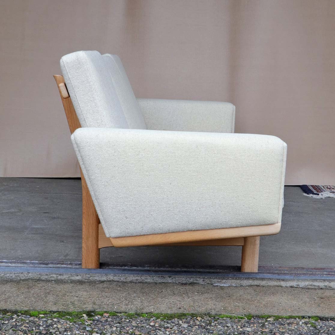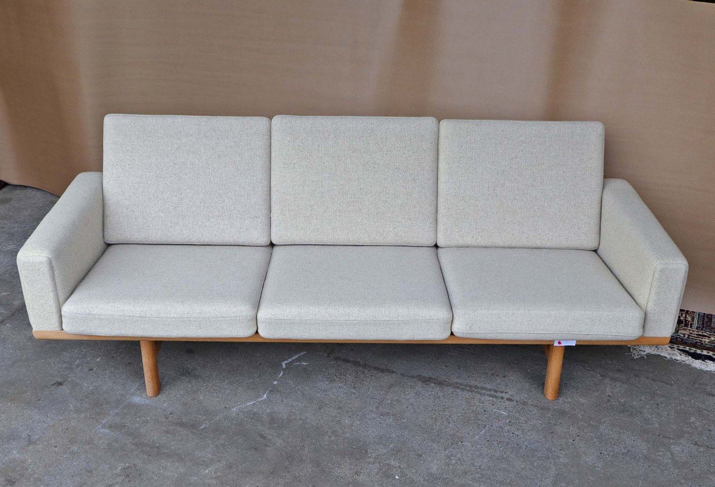 Tre personers sofa med stel i sæbebehandlet egetræ og hynder med springfjeder, som er betrukket med lyst uldstof. Model GE-236