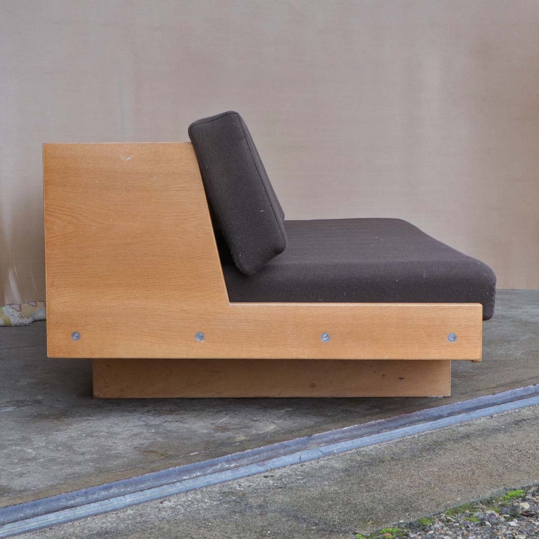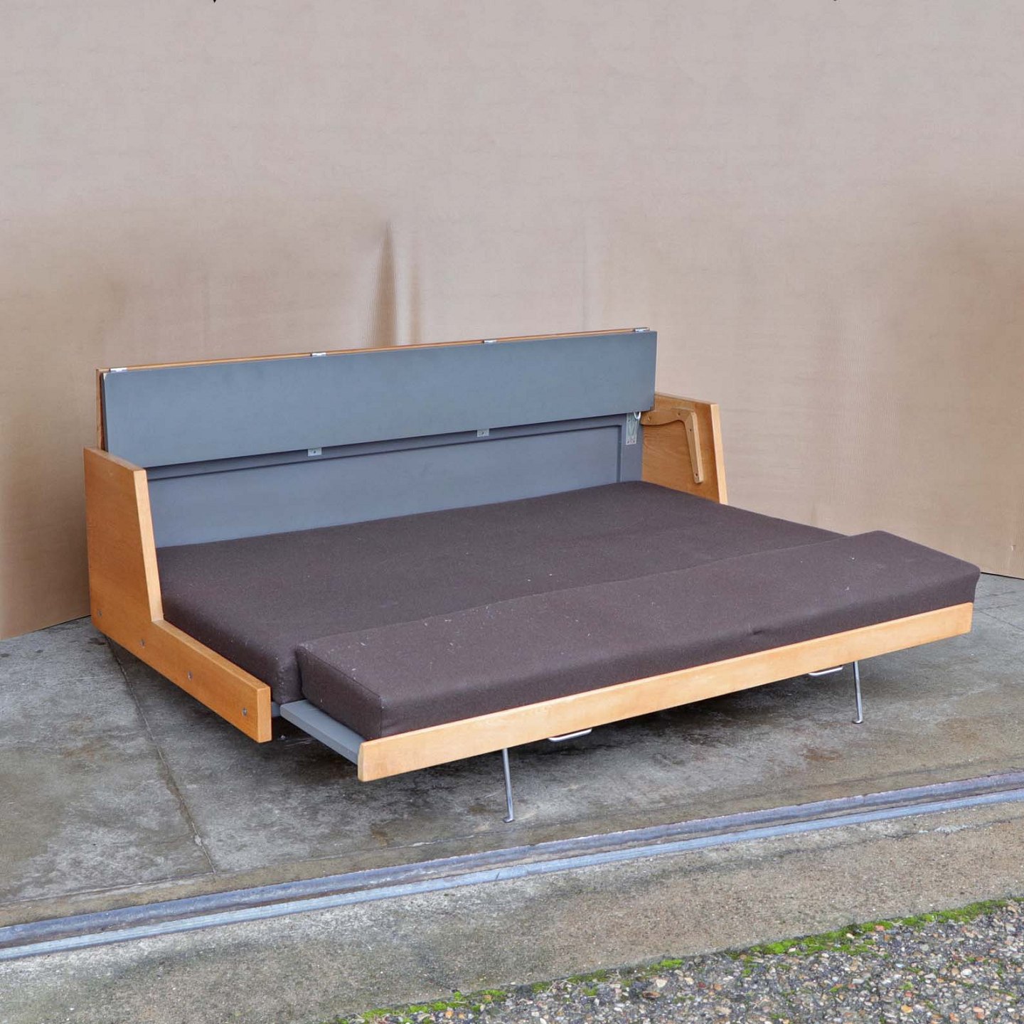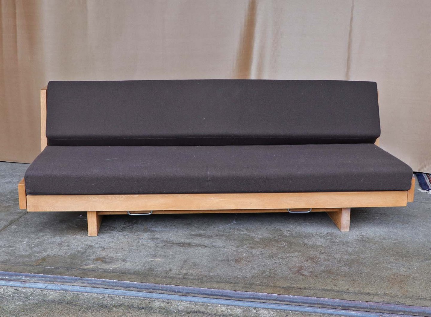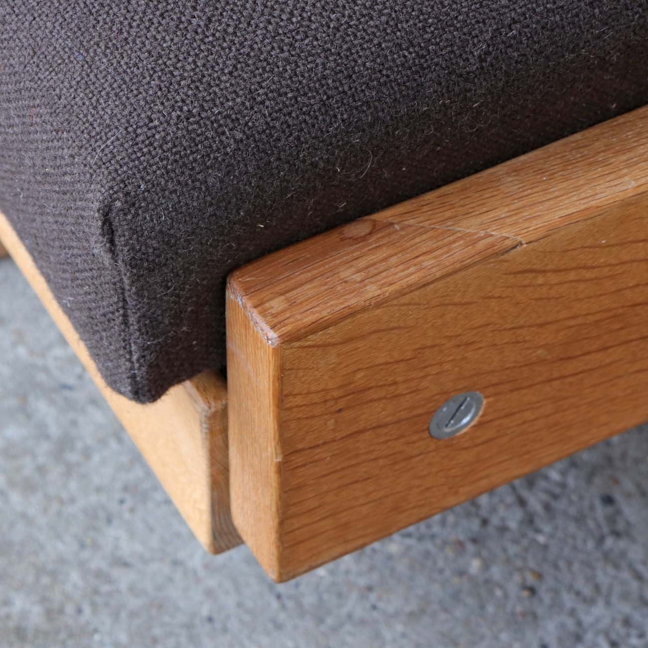 Tre personers sofa med sove-udtræk og stel i lakeret egetræ. Sæde og ryghynde er med springfjeder og betrukket med mørkebrunt uldstof . Møblet er en sovesofa, som udtrukket kan rumme to personer. Model GE-77