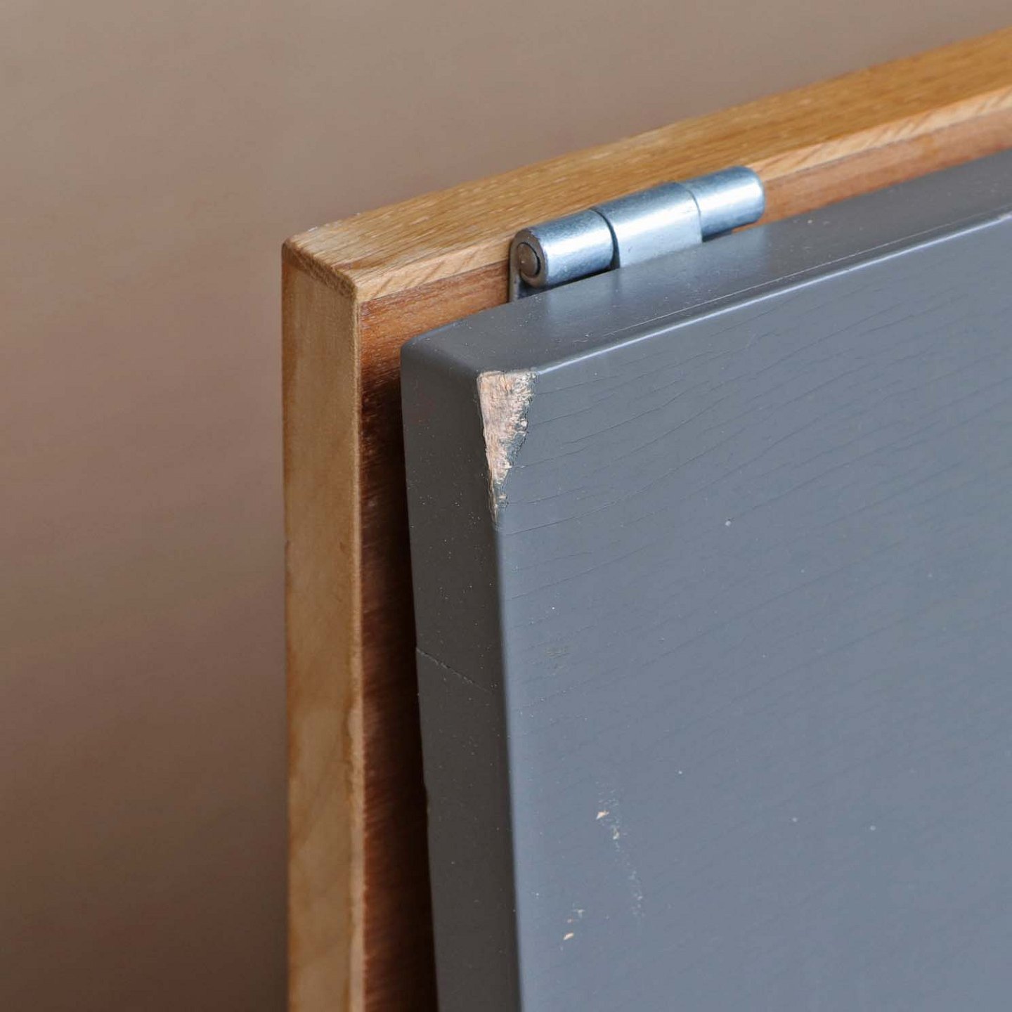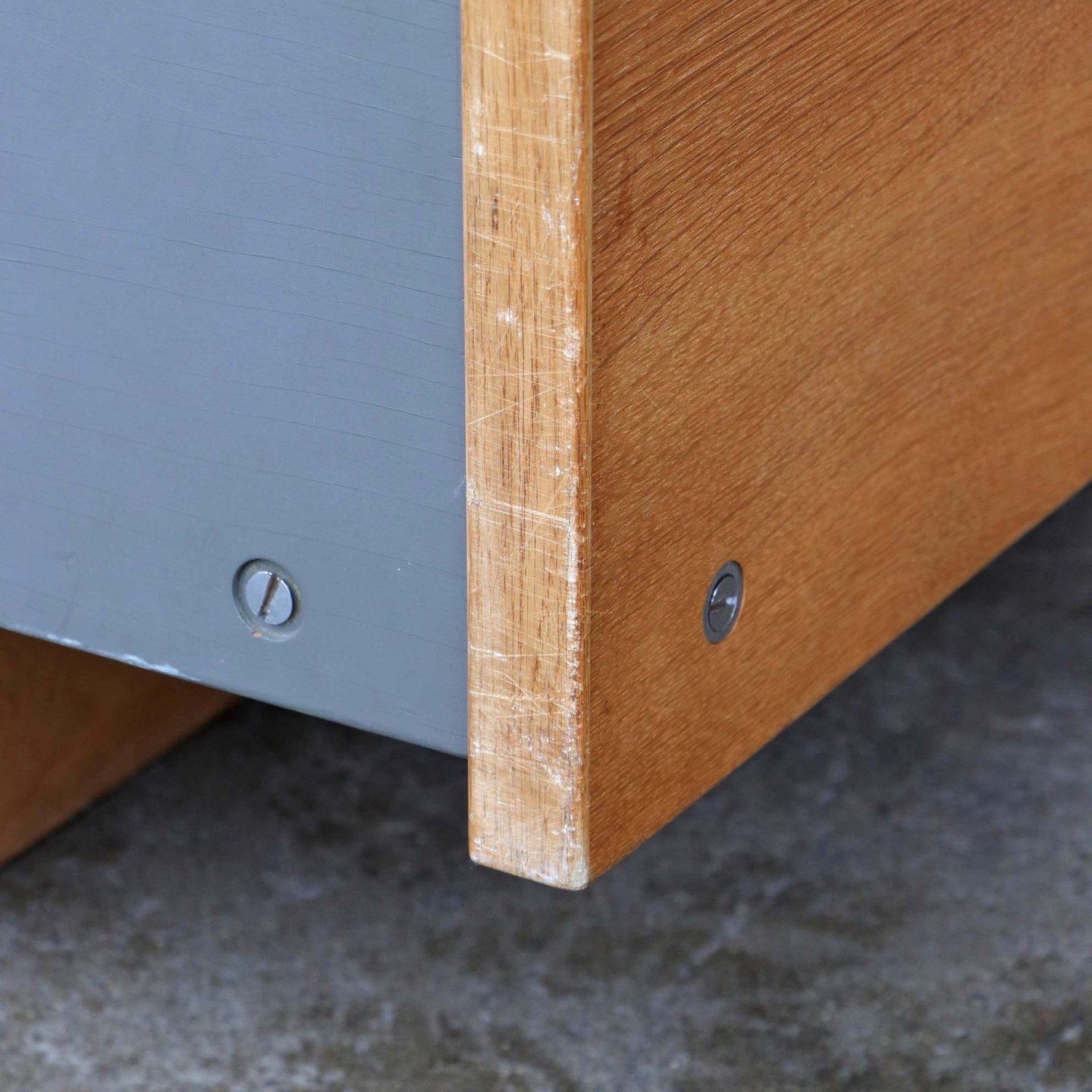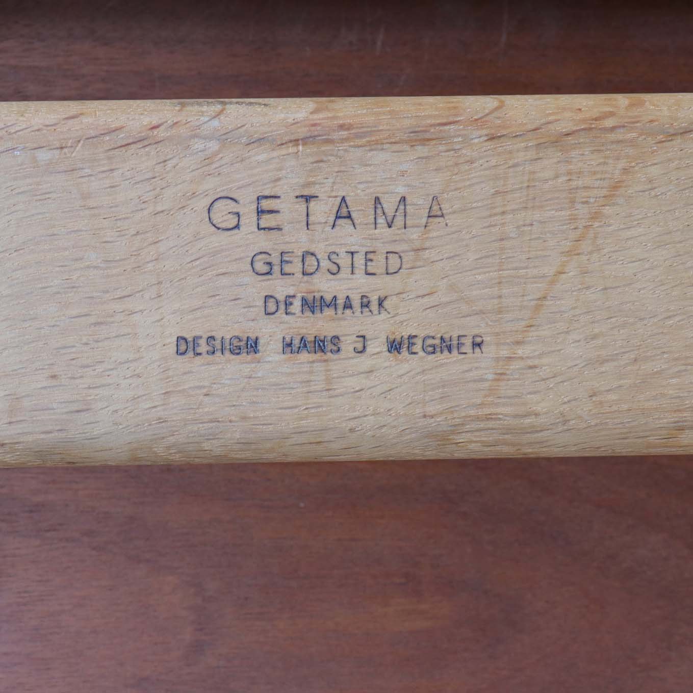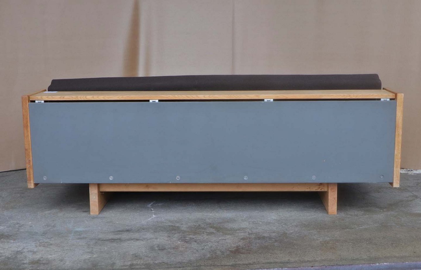 Tre personers sofa med sove-udtræk og stel i lakeret egetræ. Sæde og ryghynde er med springfjeder og betrukket med mørkebrunt uldstof . Møblet er en sovesofa, som udtrukket kan rumme to personer. Model GE-77