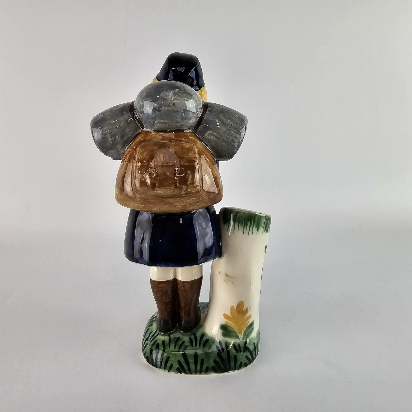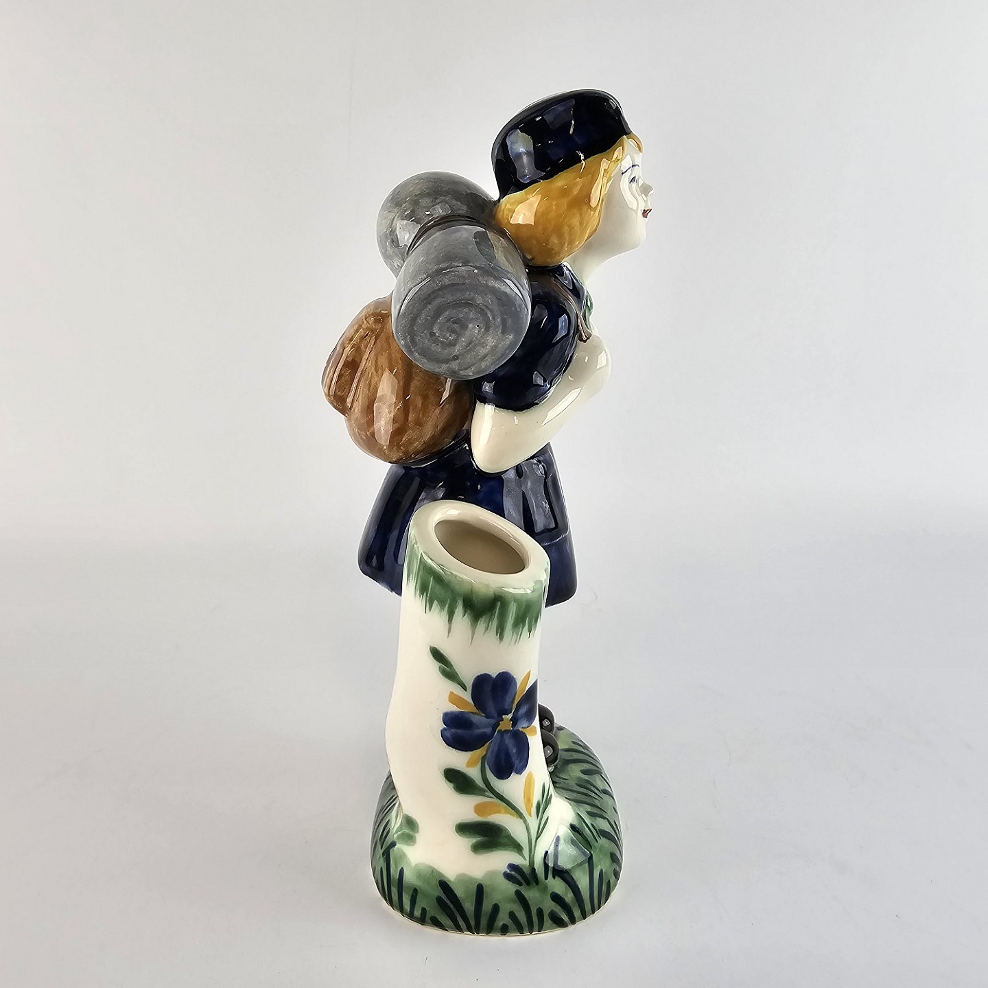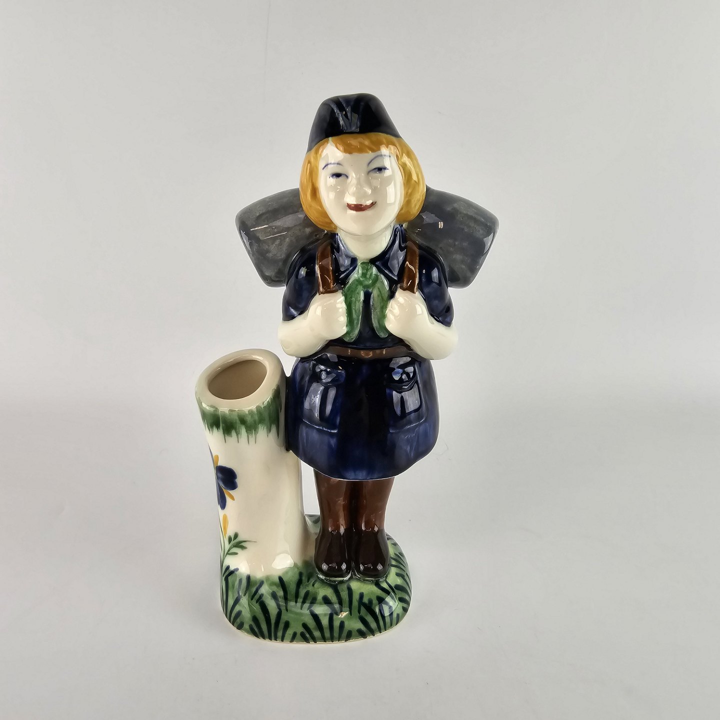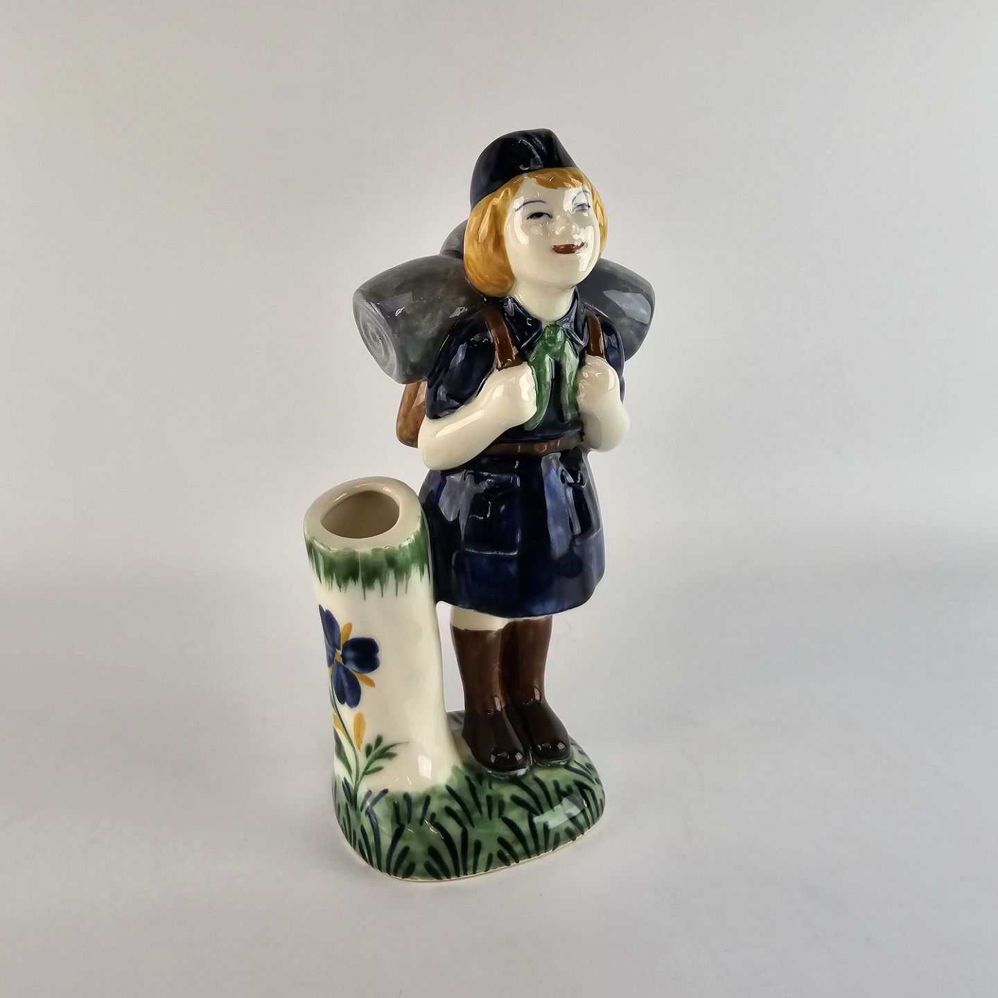 Børnehjælpsfigur i fajance med motiv af blå pigespejder med rygsæk. Figuren er en del af en serie, som blev lavet i forbindelse med børnehjælpsdagen