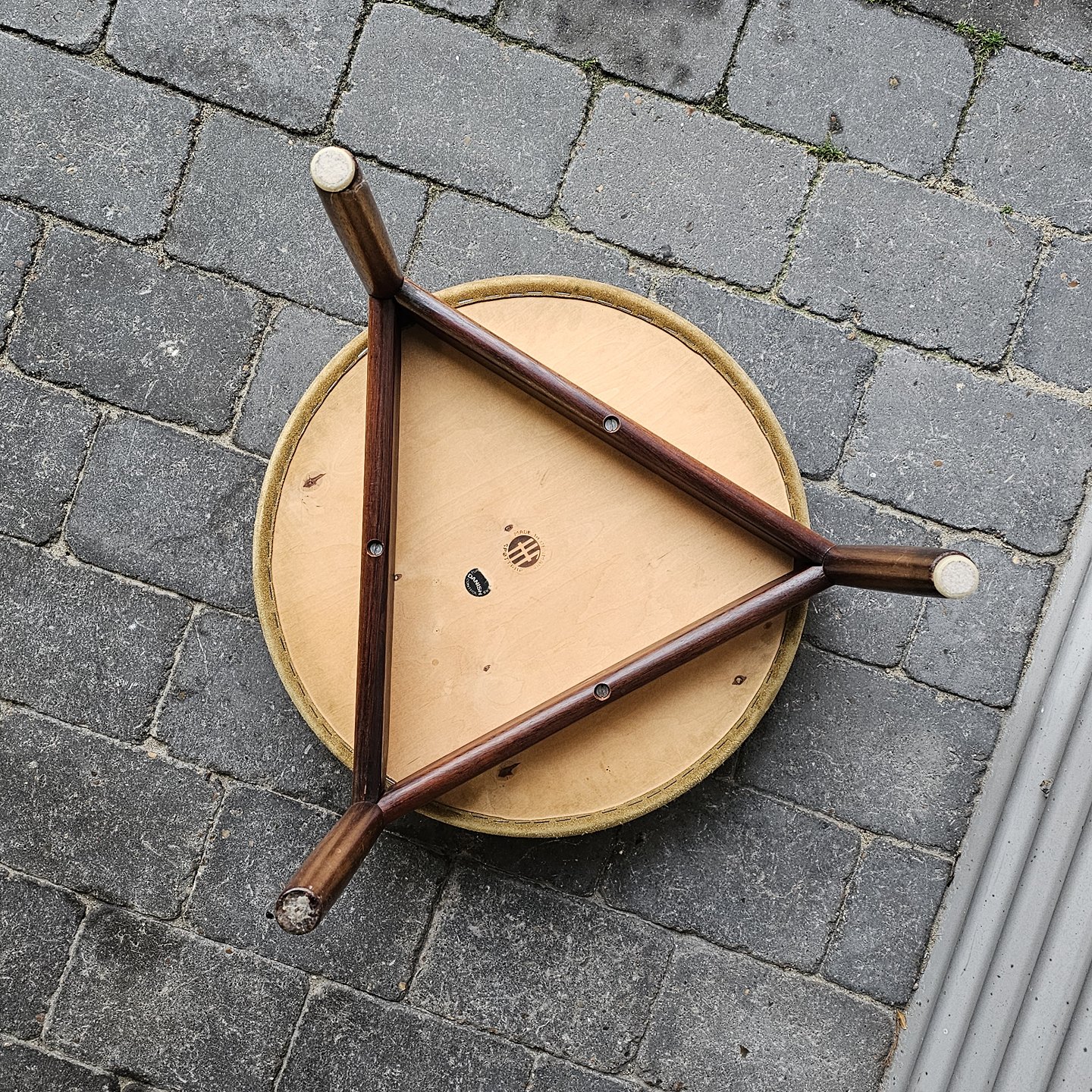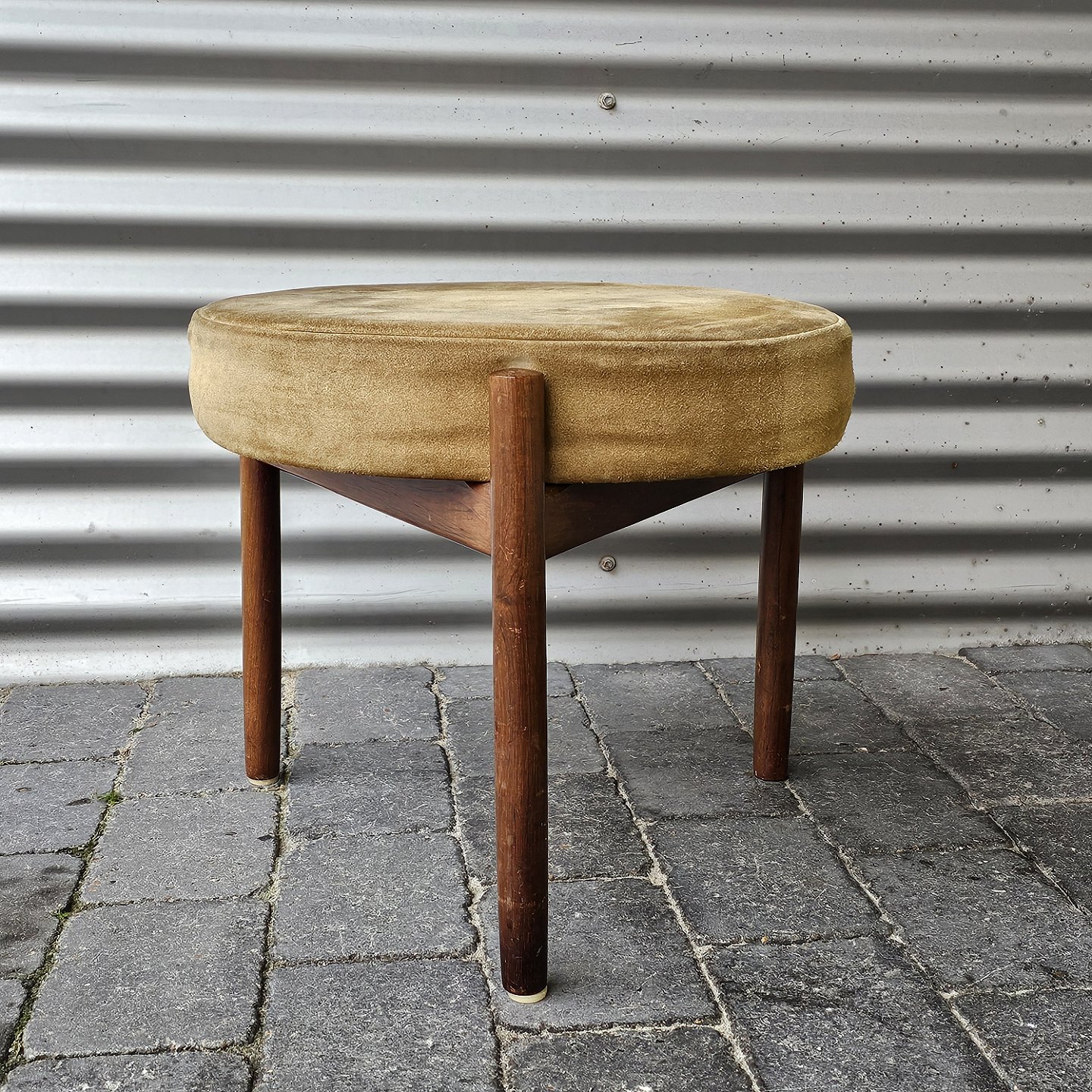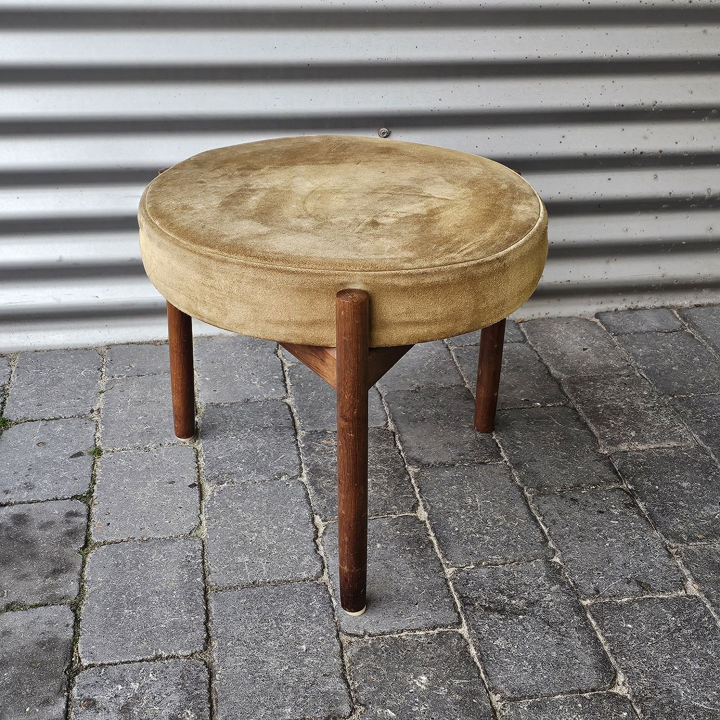 Skammel med rundt sæde af grønt ruskind og trebenet palisander stel.