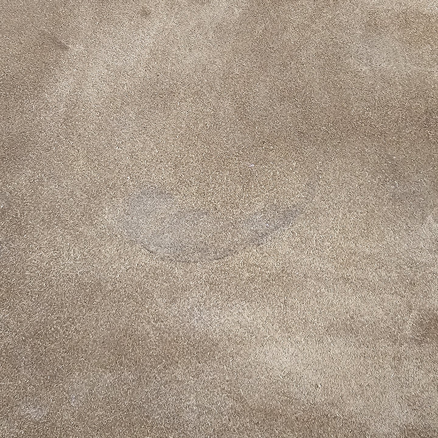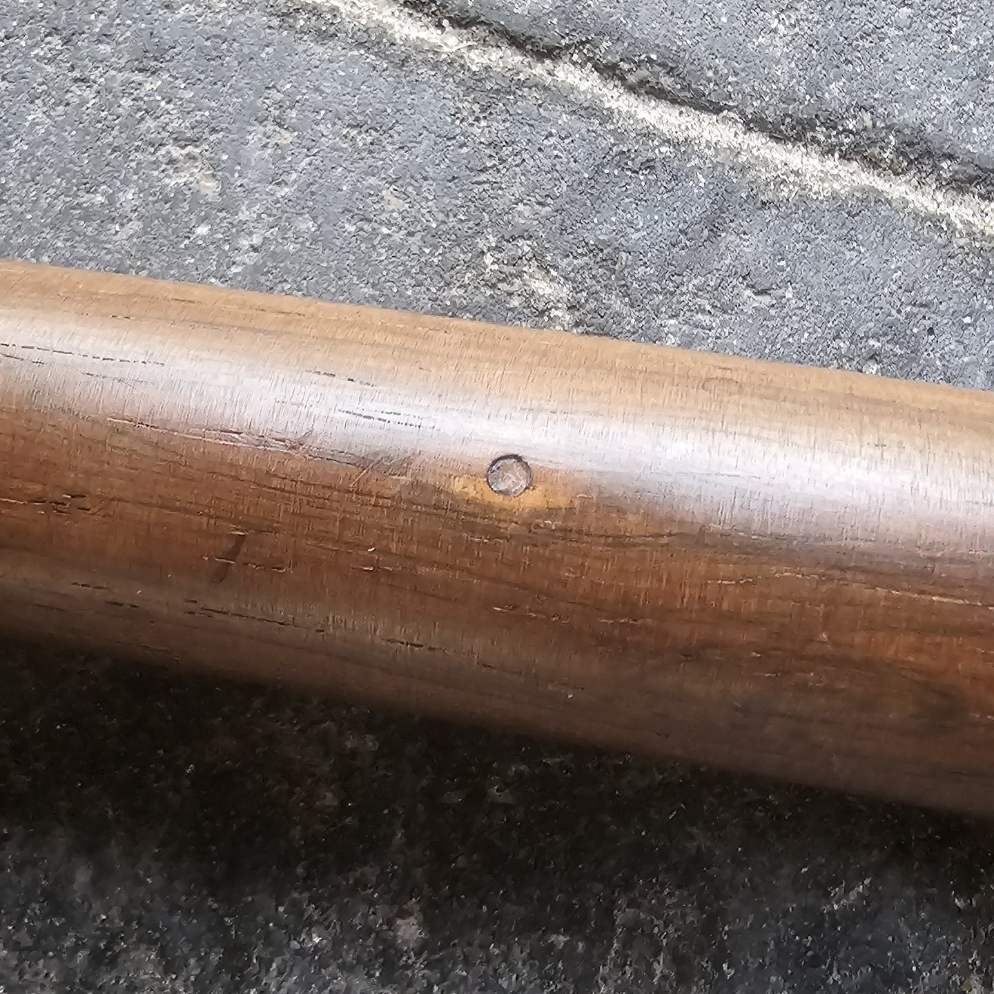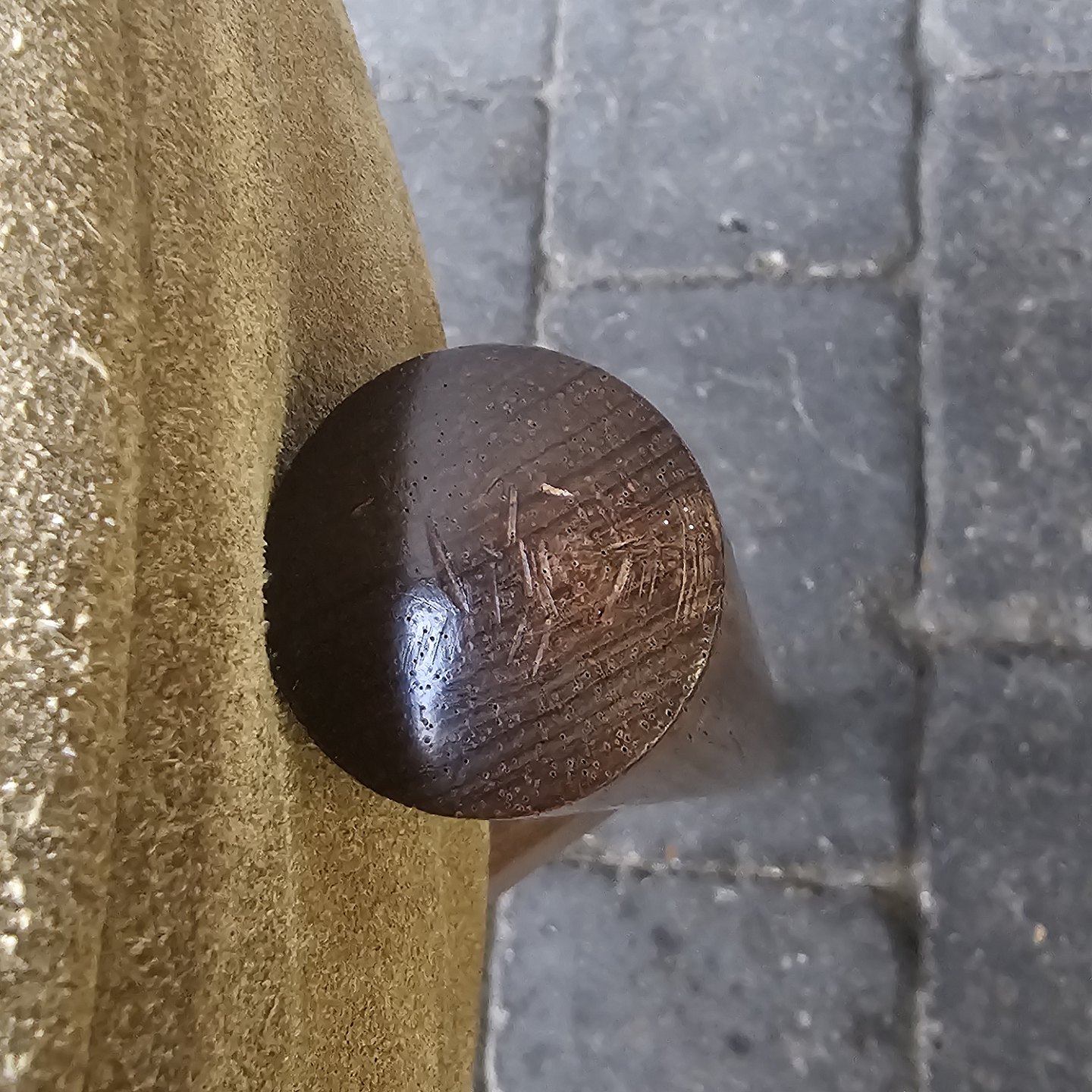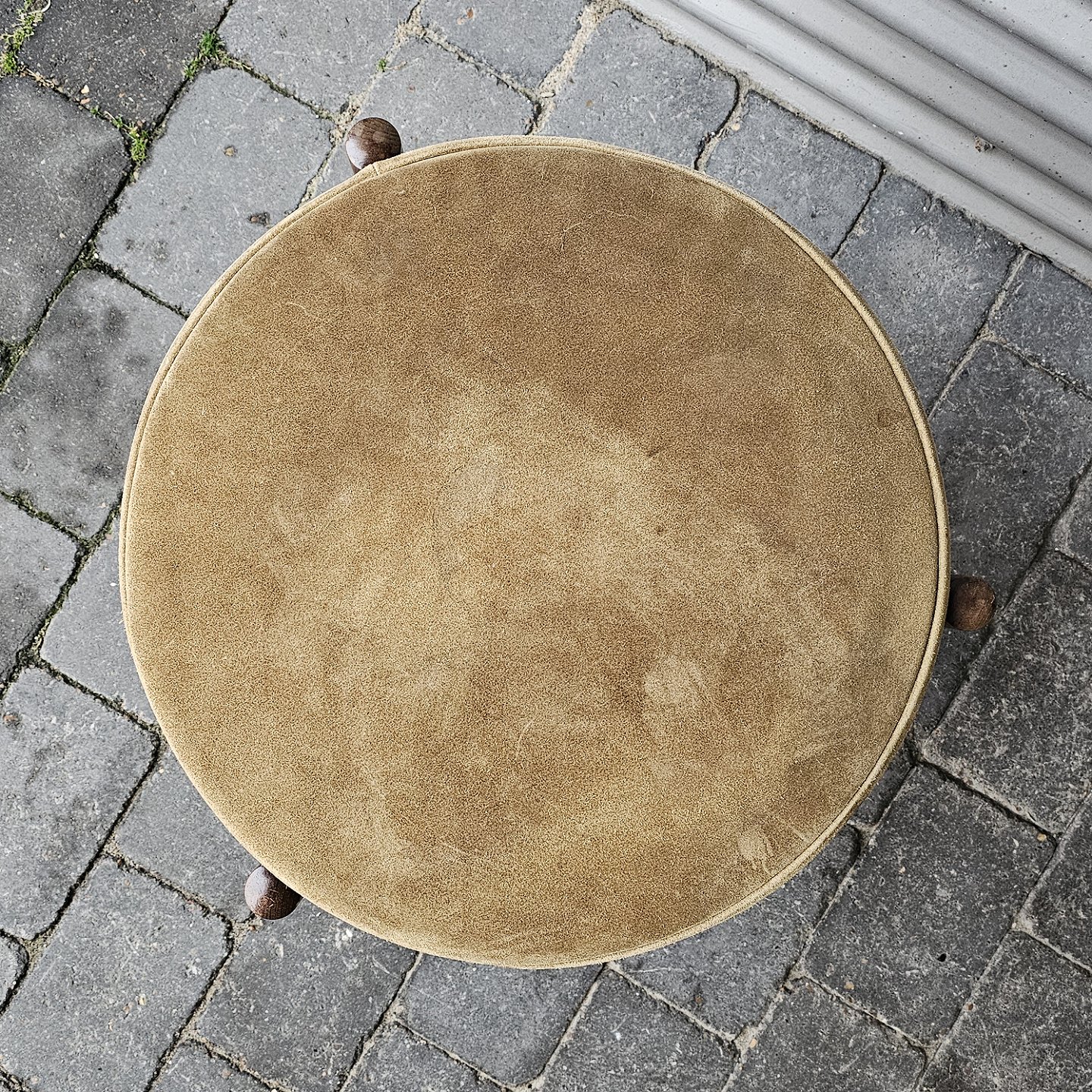 Skammel med rundt sæde af grønt ruskind og trebenet palisander stel.