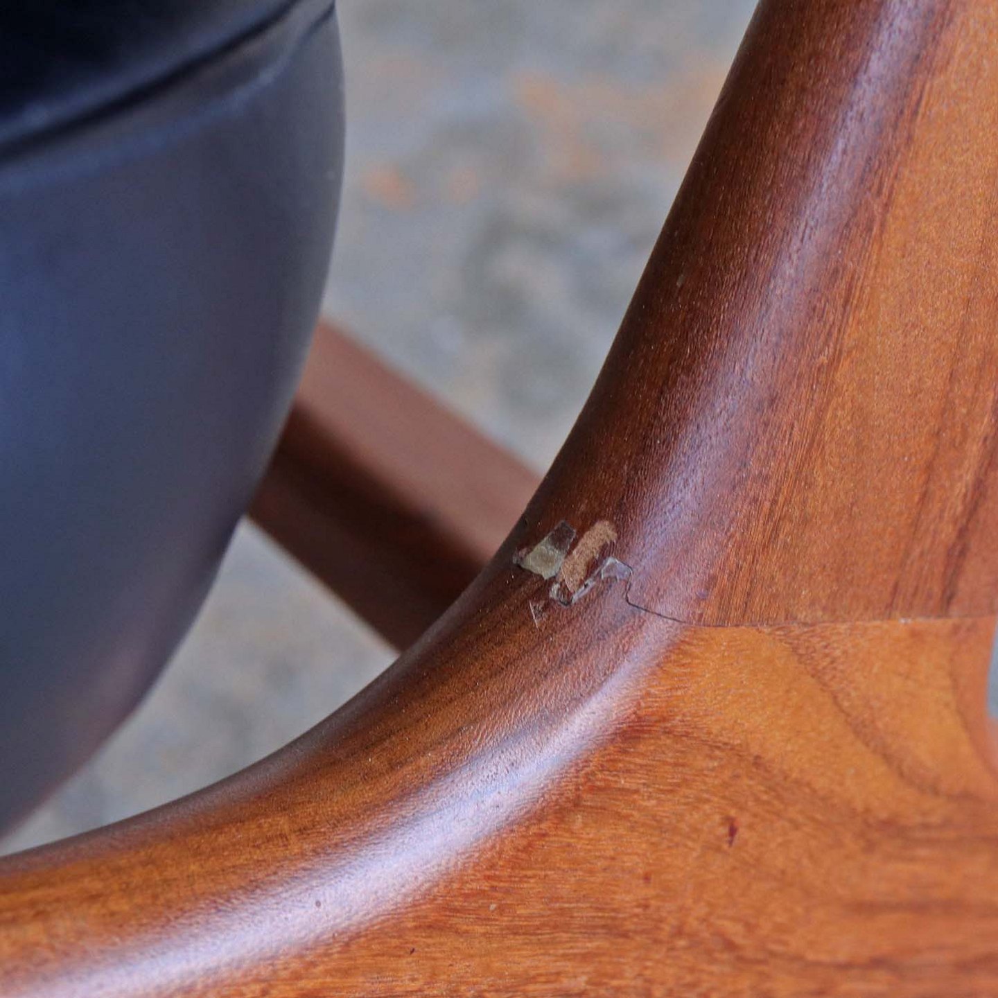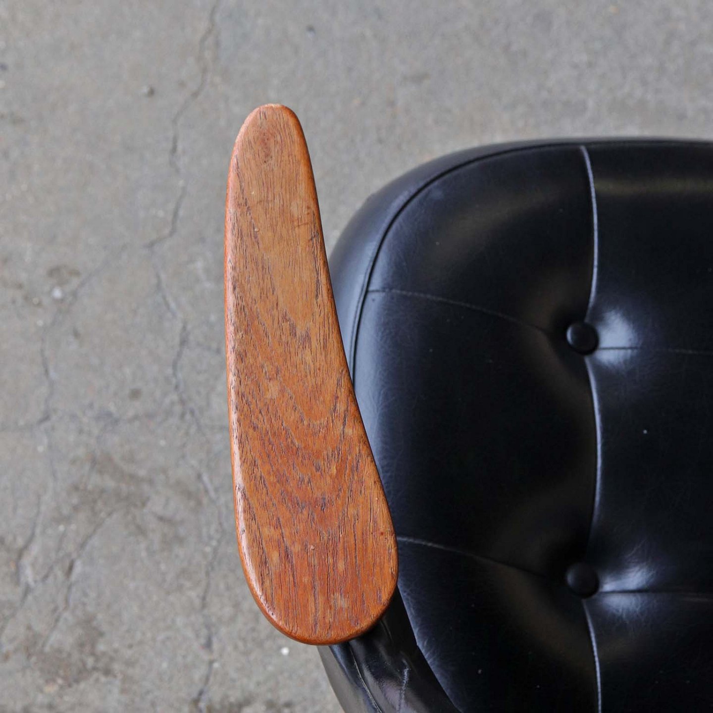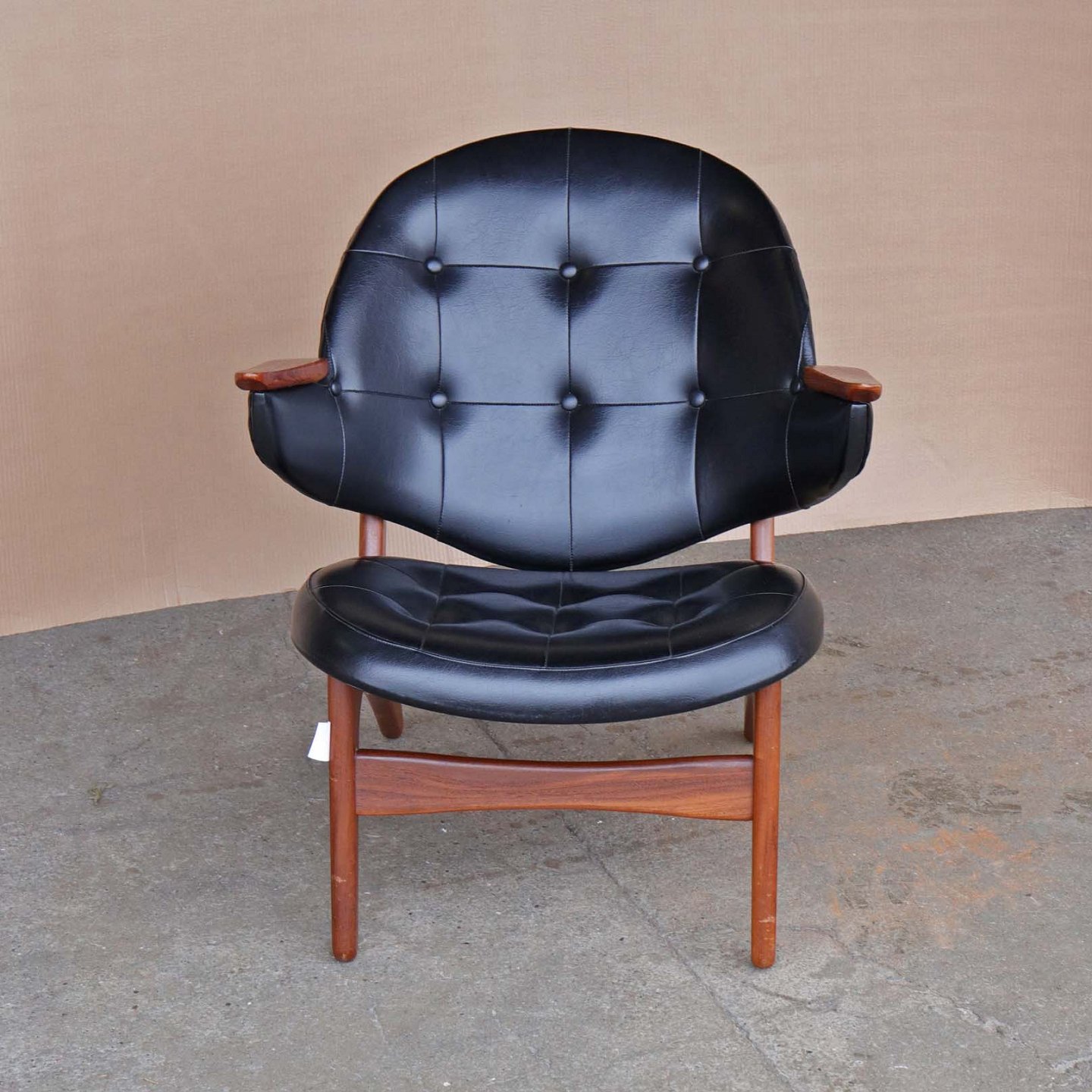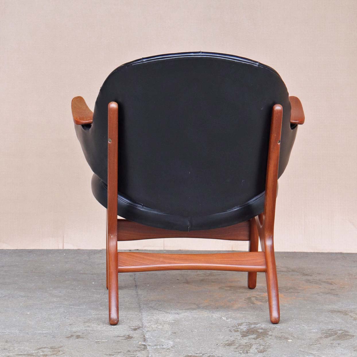 Lænestol fra 1960'erne med stel i lakeret teaktræ og armlæn i egetræ. Stolen betrukket med sort imiteret læder. Model 33