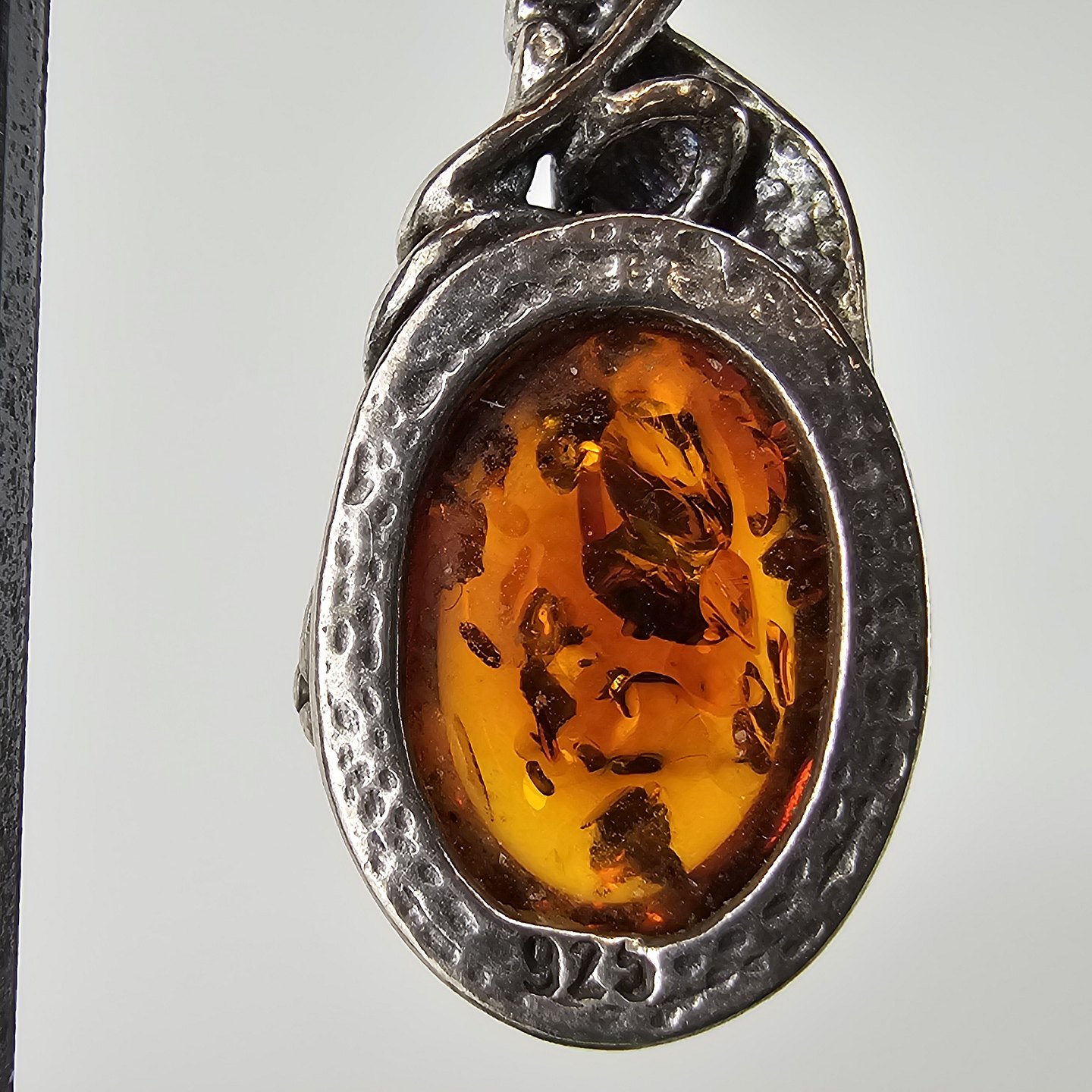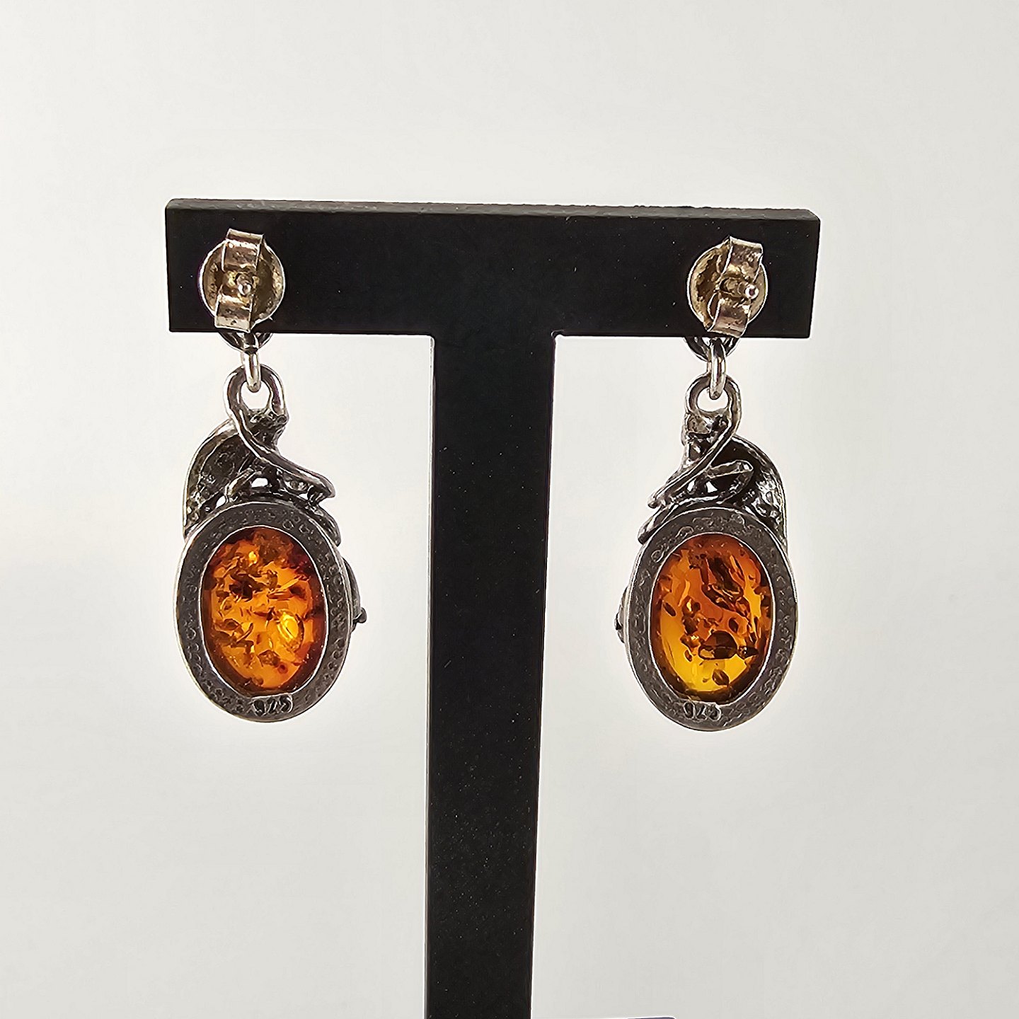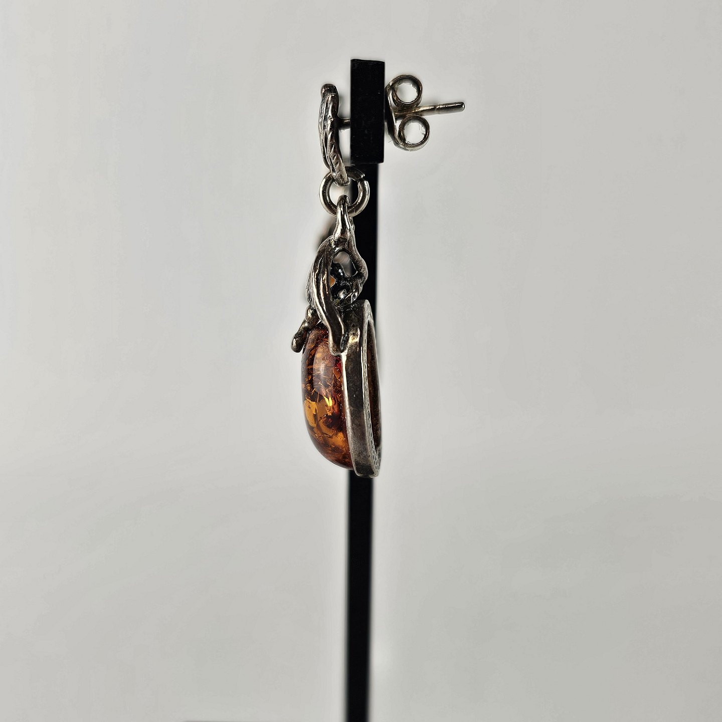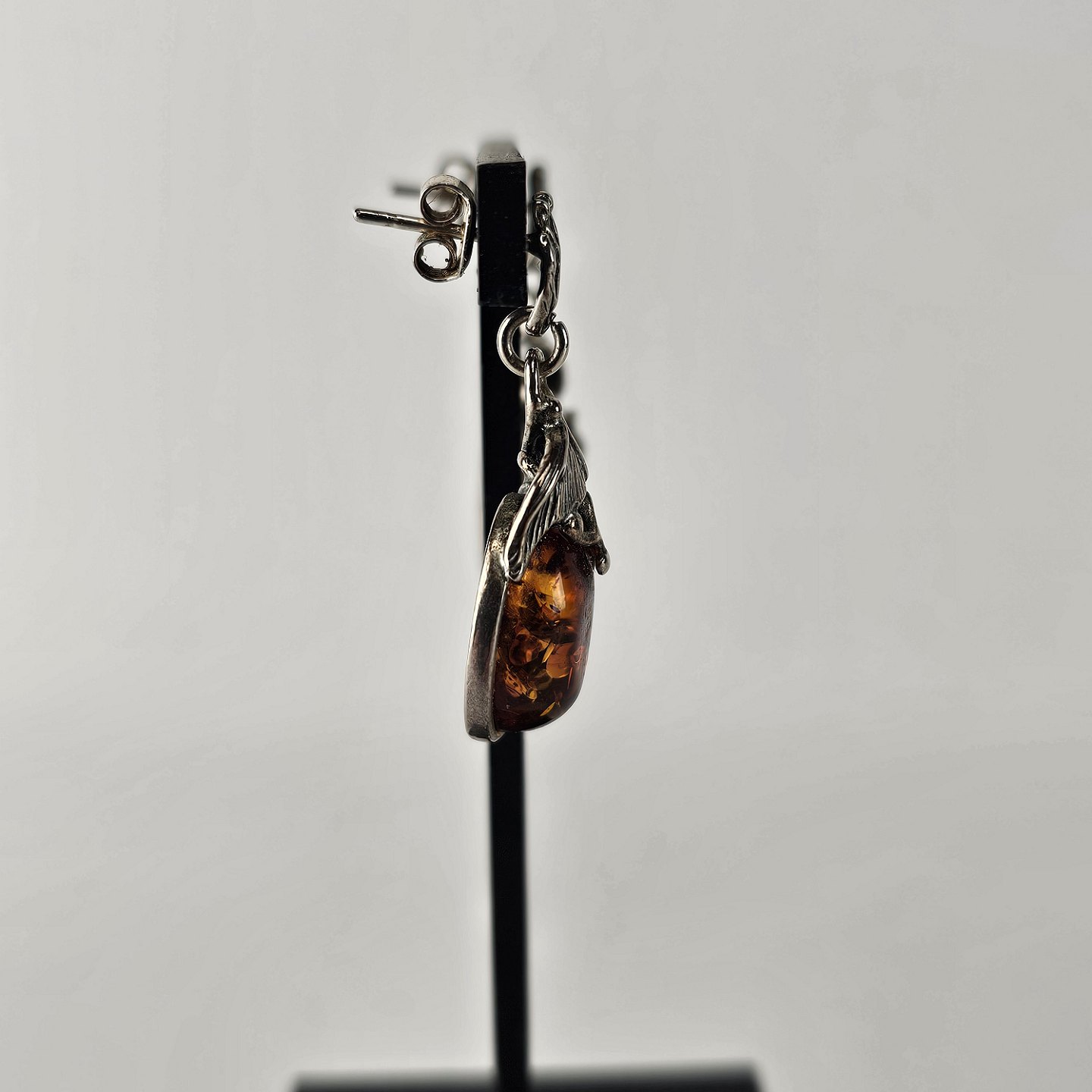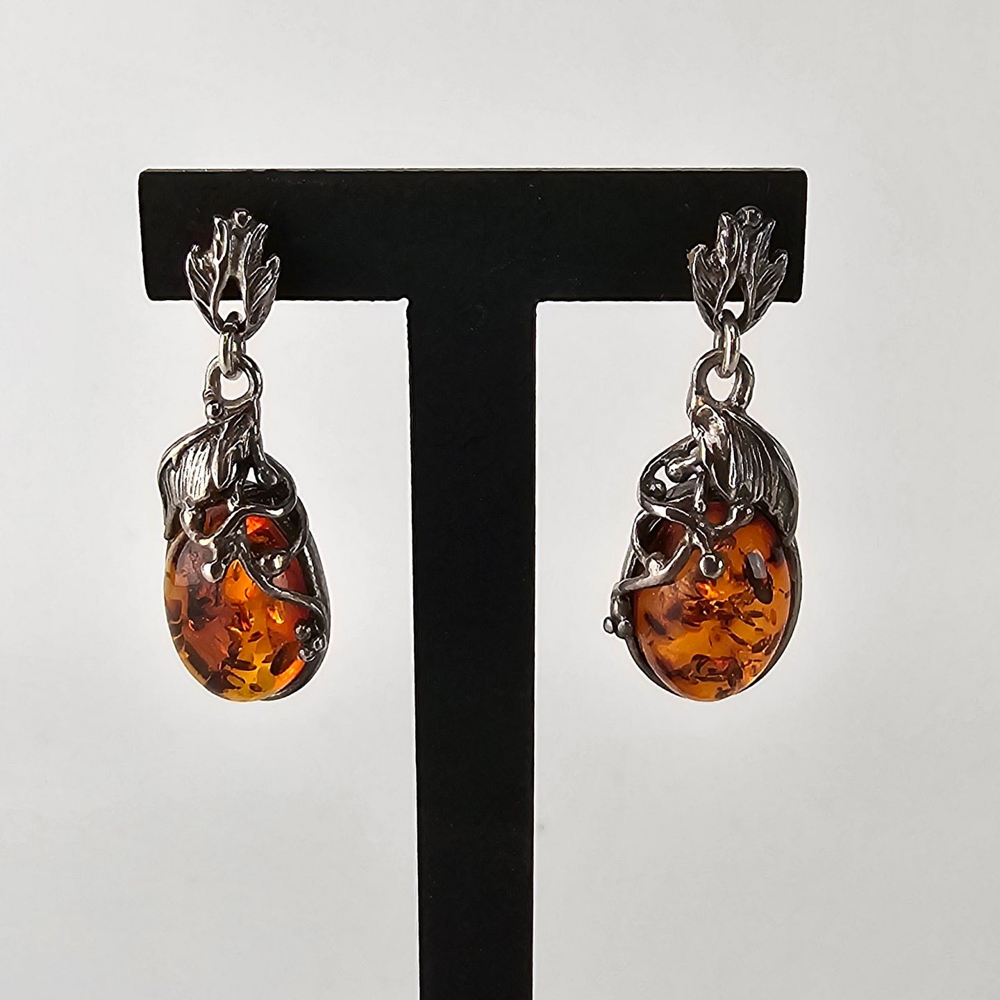 Dråbeformede ørestikker i sterlingsølv med Rav pyntet med Blad detaljer.