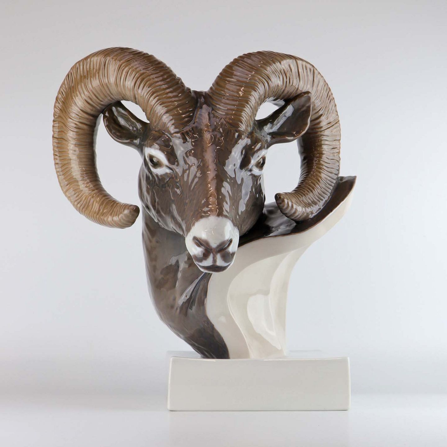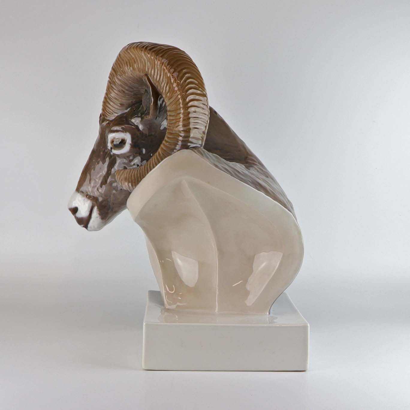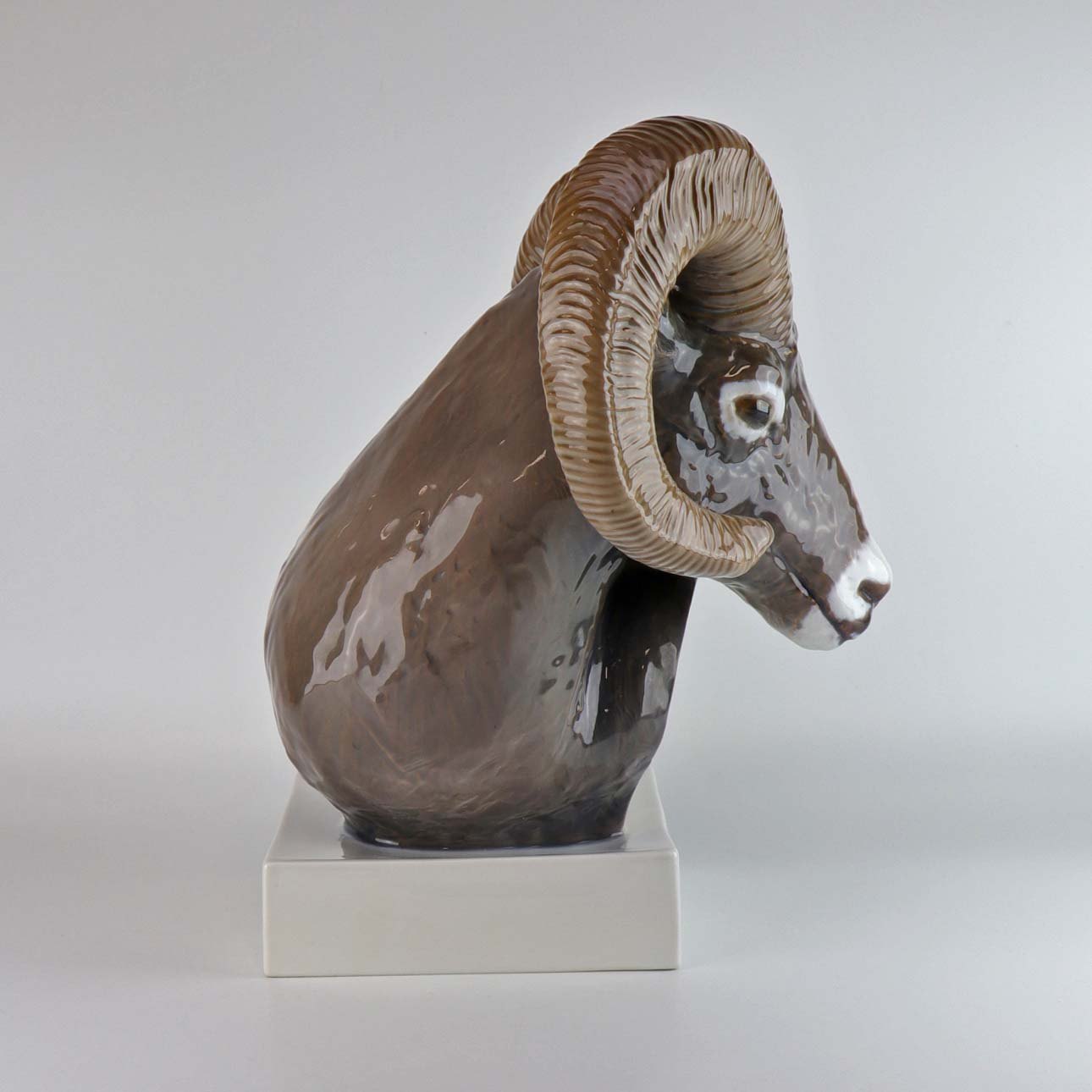 Stor figur i porcelæn med motiv af vædderhoved. Figuren er fremstillet i et begrænset antal. Denne er nr. 18 ud af 750 eksemplarer. Nr. 7055