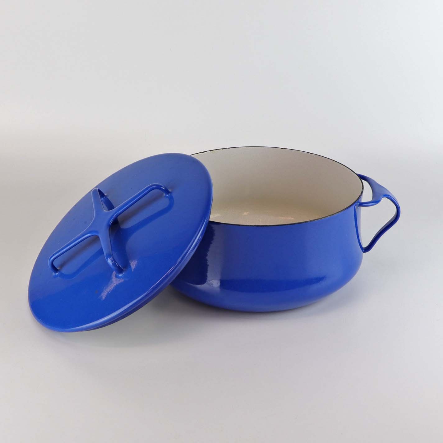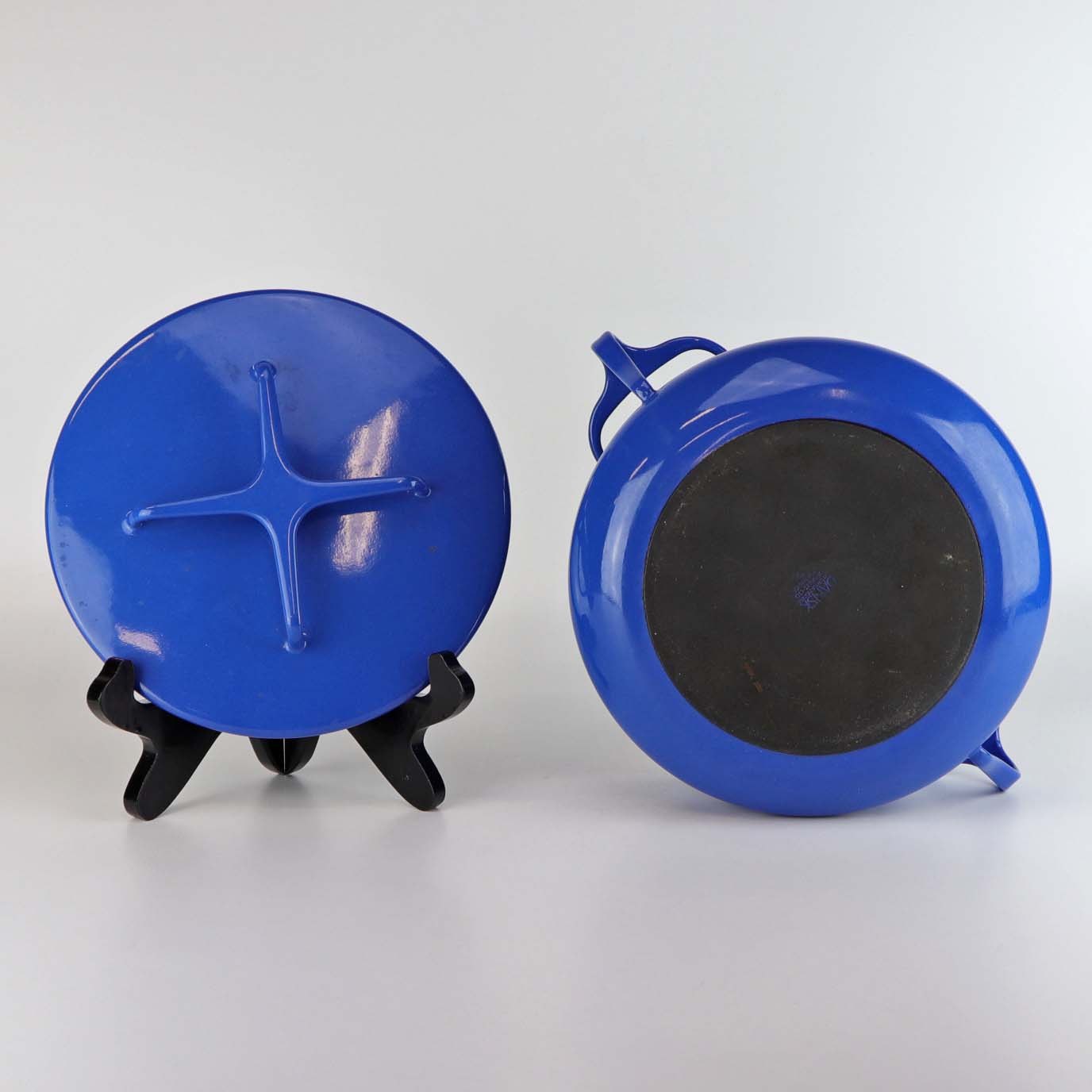 Kasserolle med låg fra serien Kobenstyle fremstillet i metal og belagt i blå og hvid emalje. Model France