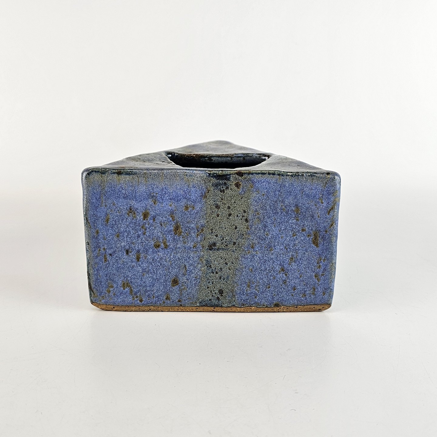 Trekantet blå krukke i keramik.
