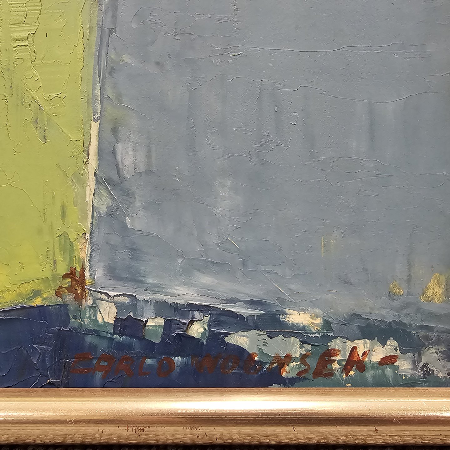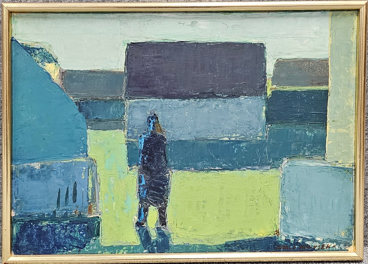 Maleri af Carlo Wognsen, med motiv af en mand der går imellem huse.
