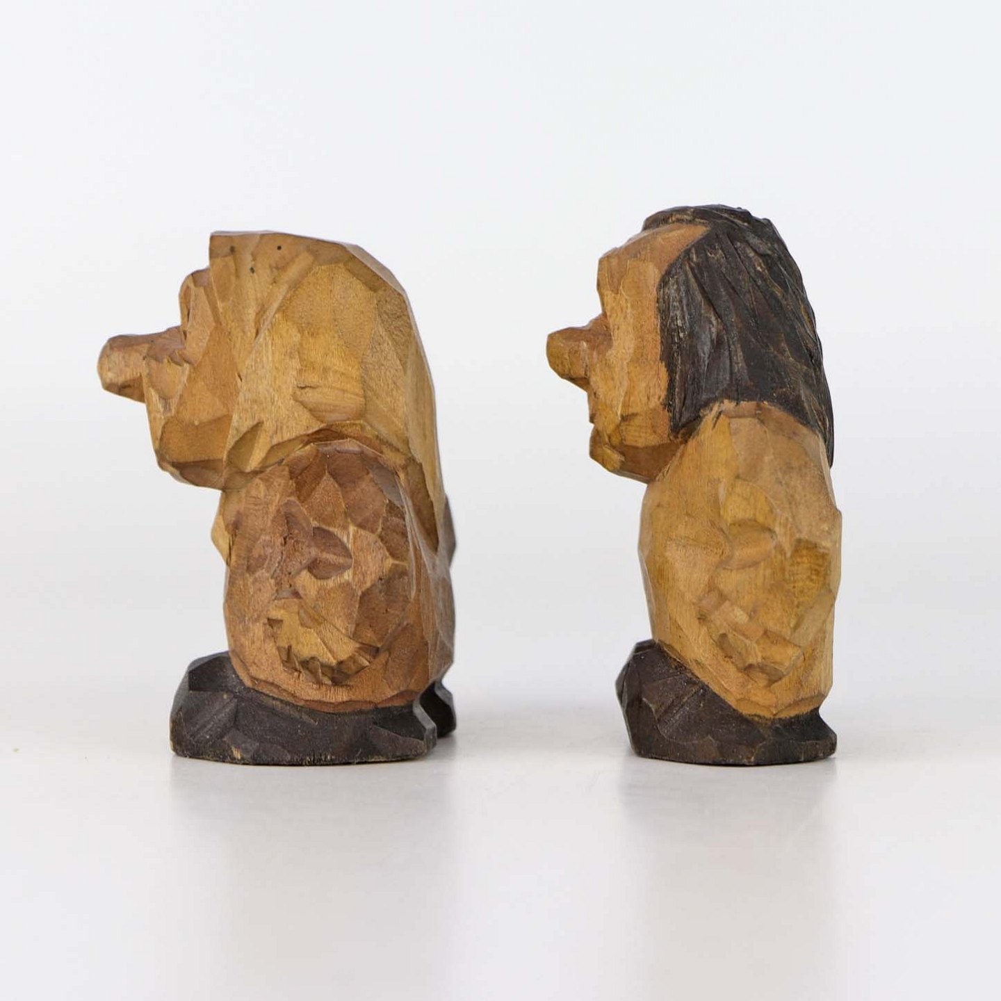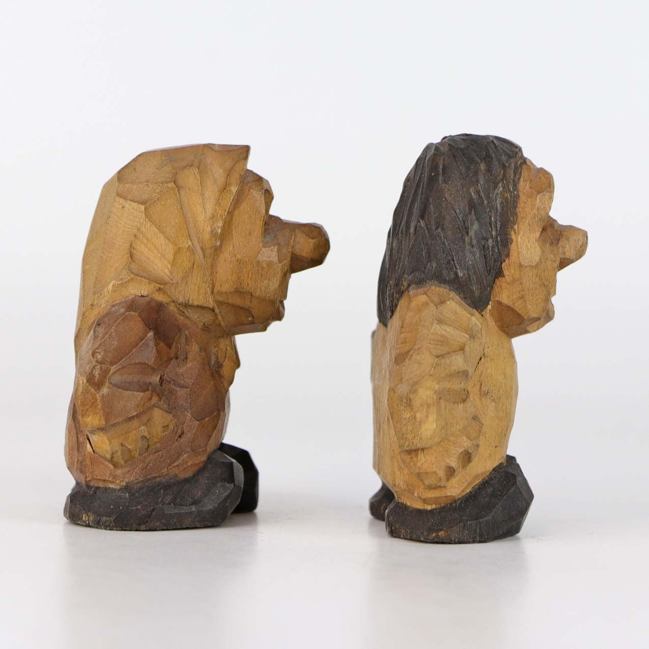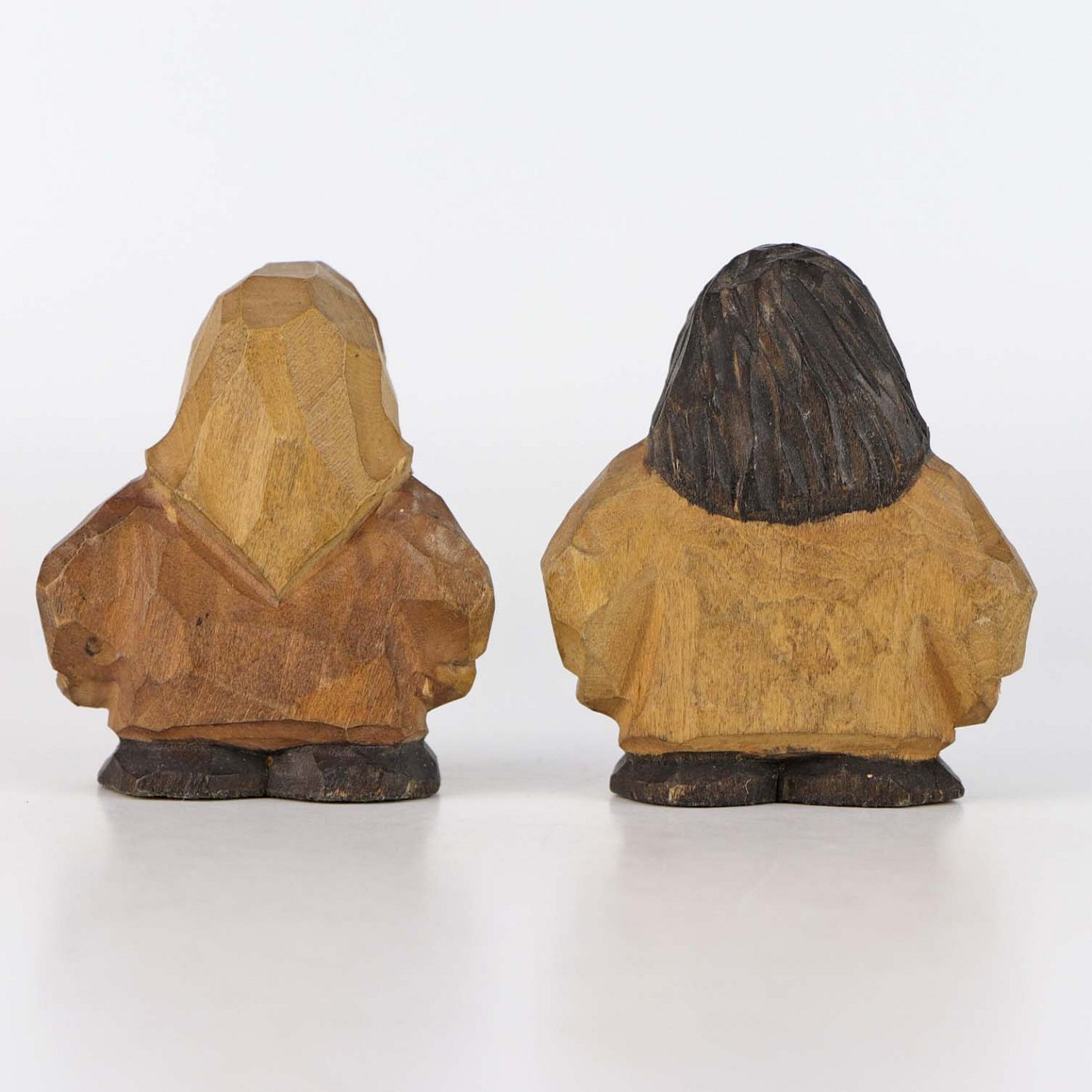 Et sæt håndsnittet figurer i træ med motiv af ældre mand og ældre kvinde
