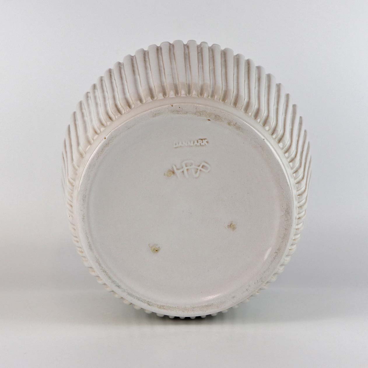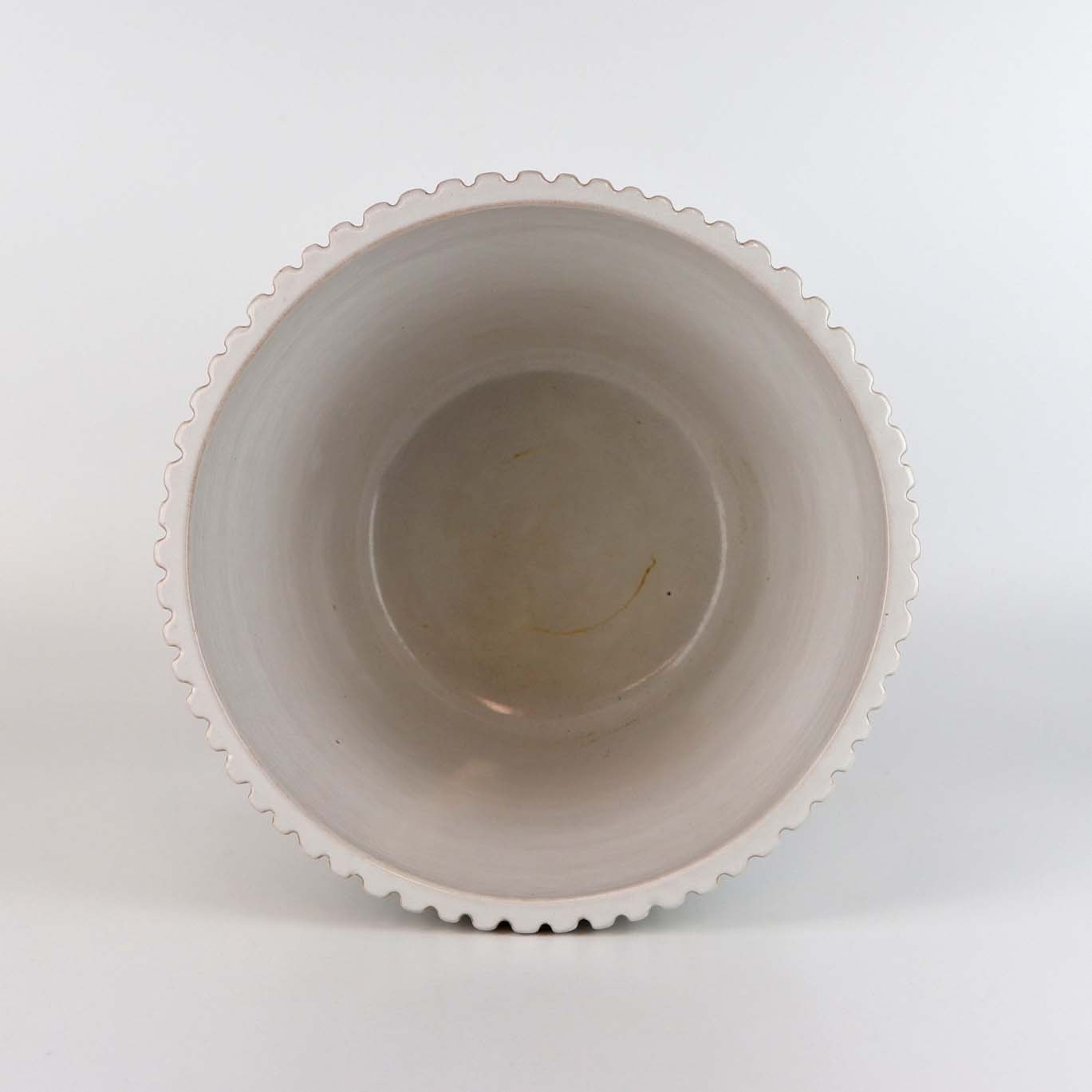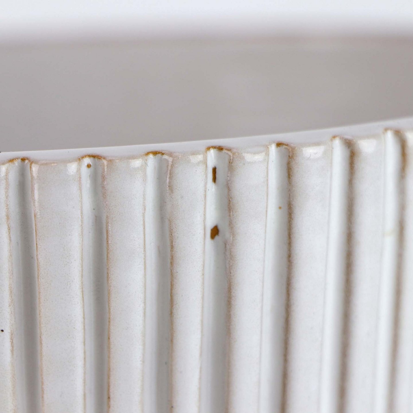 Urtepotteskjuler i keramik med råhvid glasering og rillet mønster