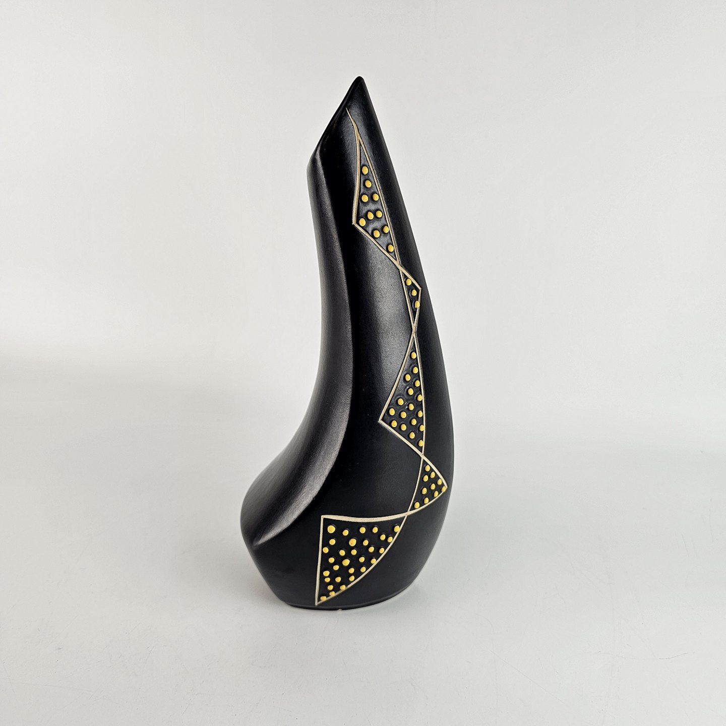 Sortglaseret vase med mønster af gule prikker, placeret i trekanter.