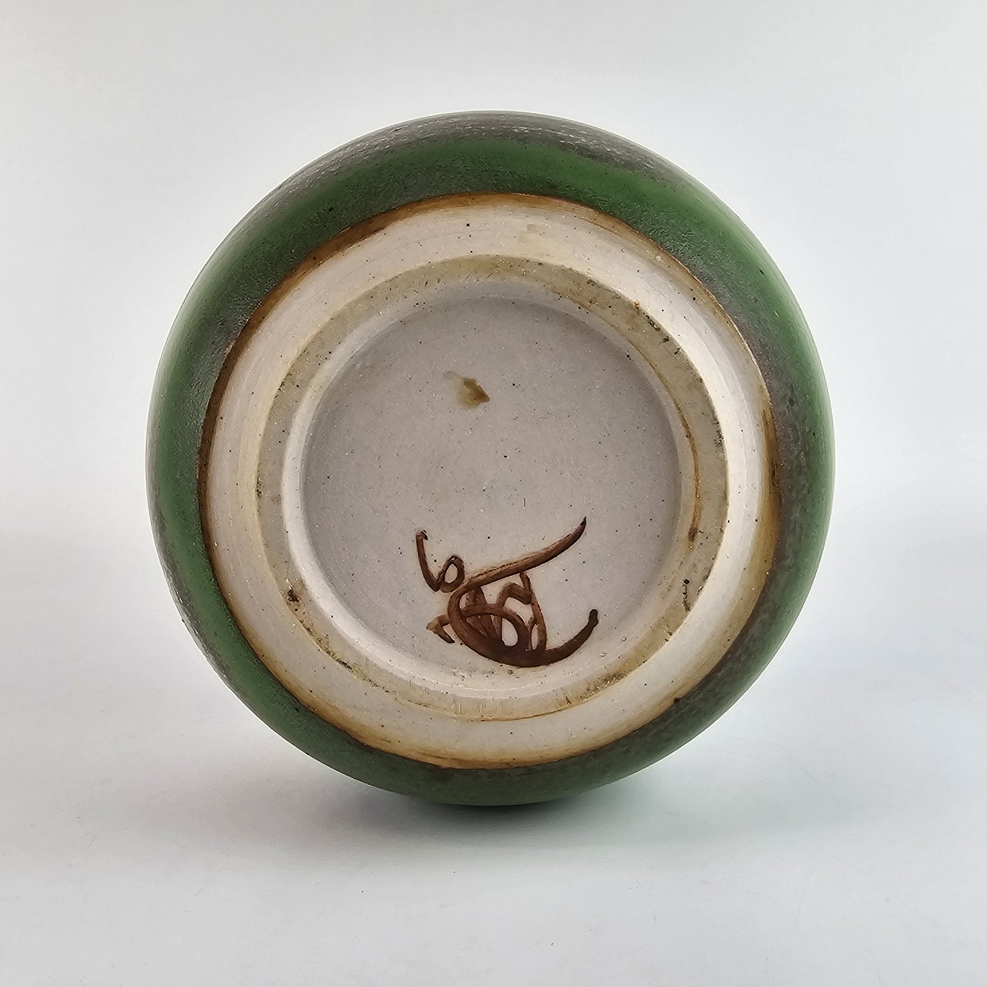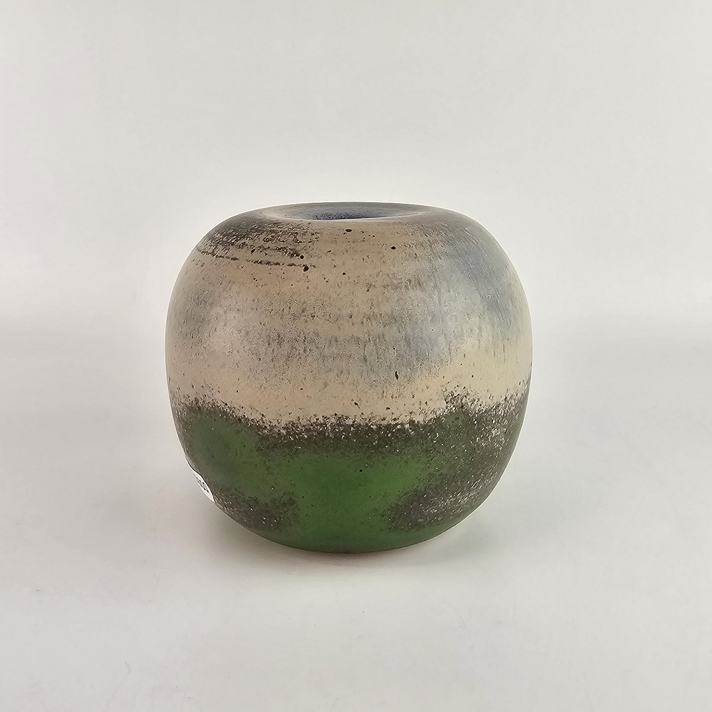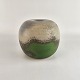 Rund vase af keramik med grønne og grå nuancer.