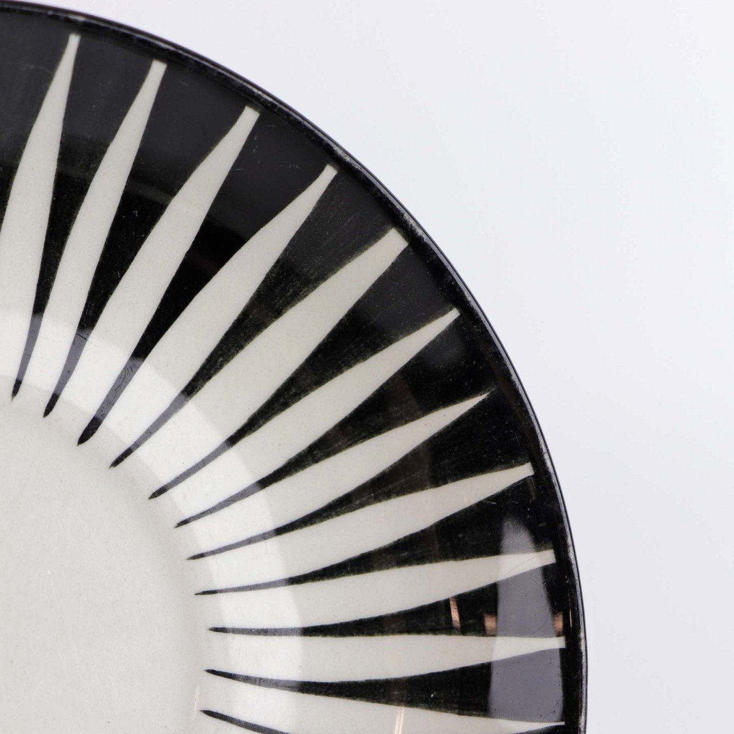 Håndmalet kaffekop med underkop i fajance fra stellet Zebra med mønster i sorte og hvide striber. Nr. 159/32 og 659/6