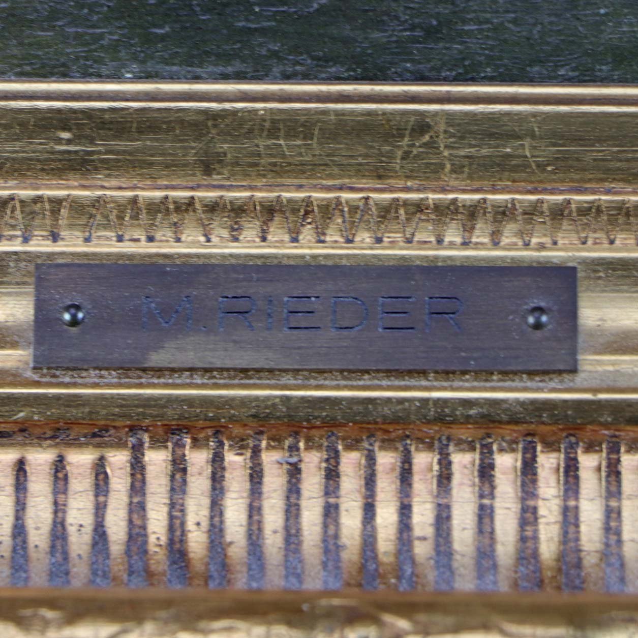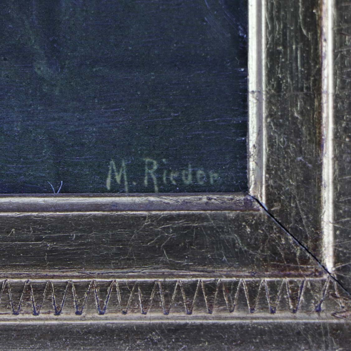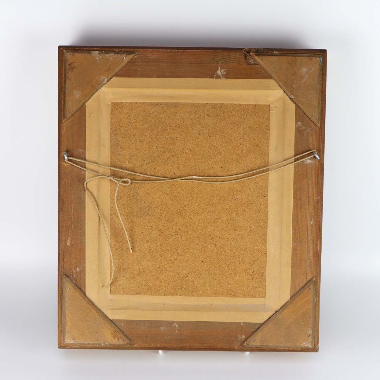 Ældre oliemaleri på plade i guldmalet træramme med motiv af et par siddende ved bord i et lysthus.