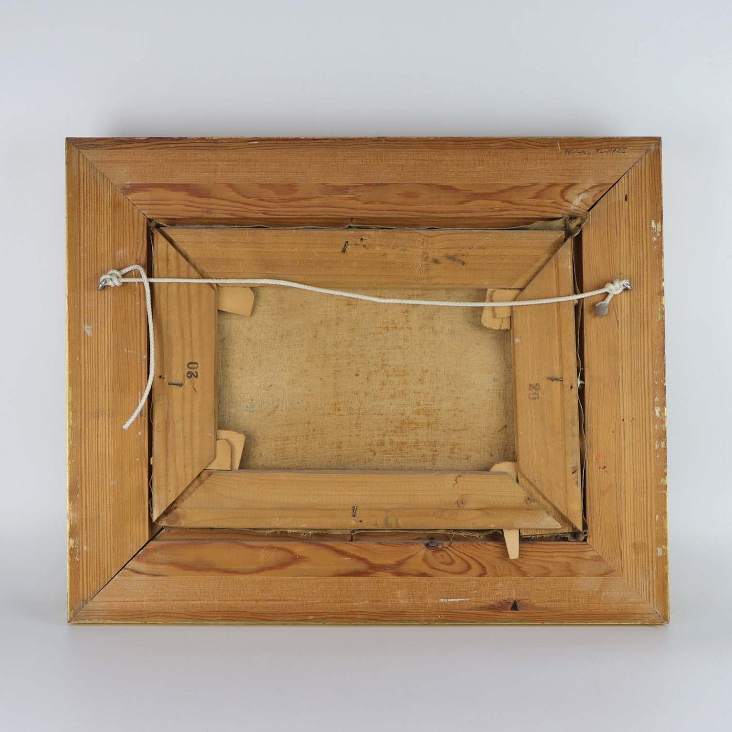 Oliemaleri på lærred i guldmalet træramme med havnemotiv af slæbebåd som trækker skib i havn.