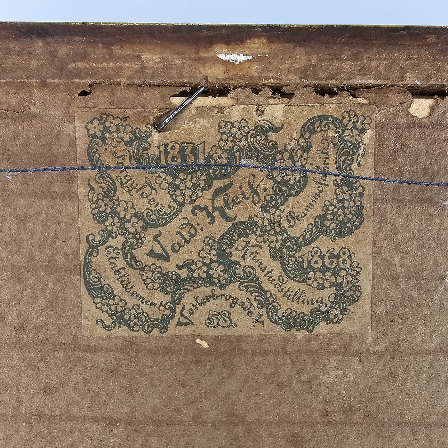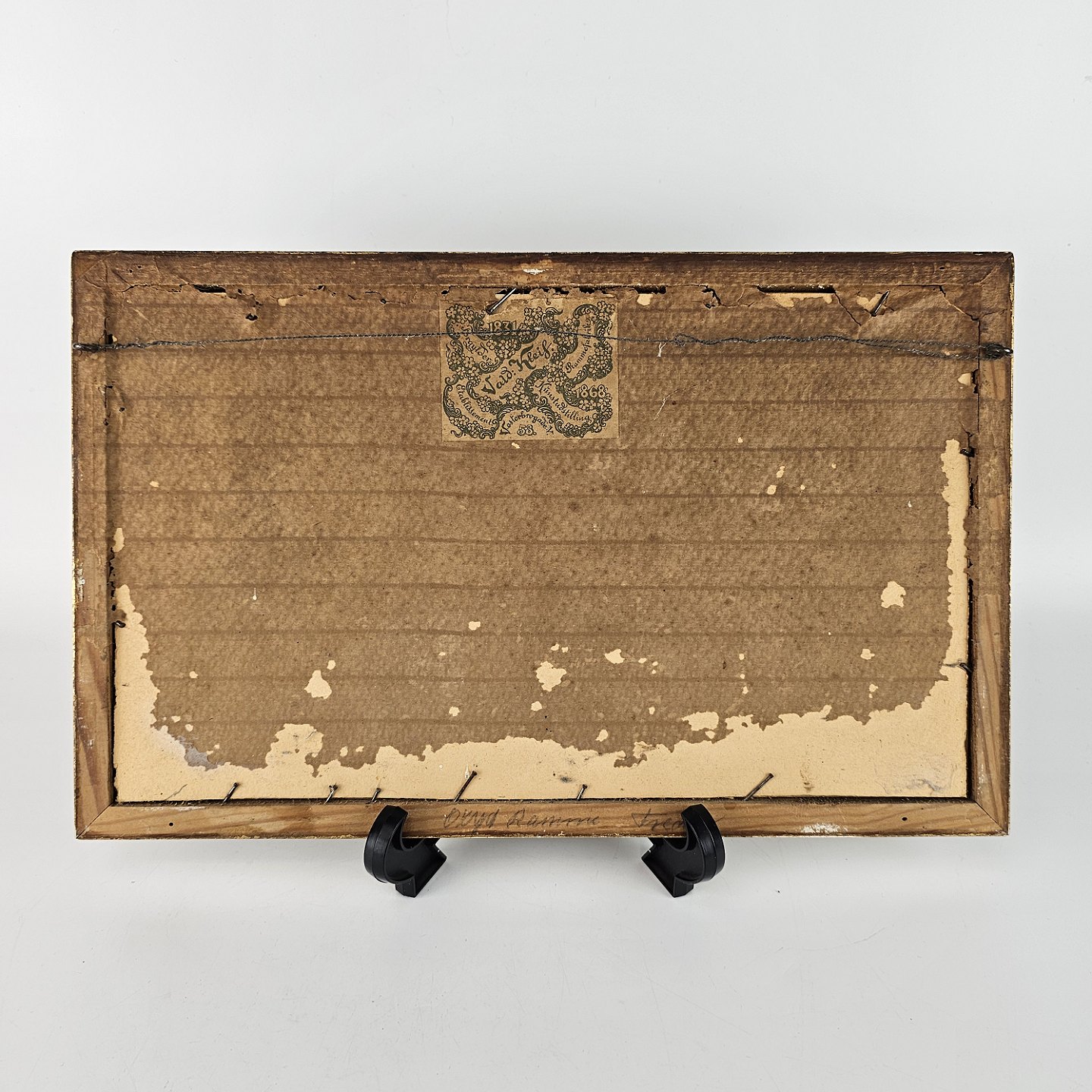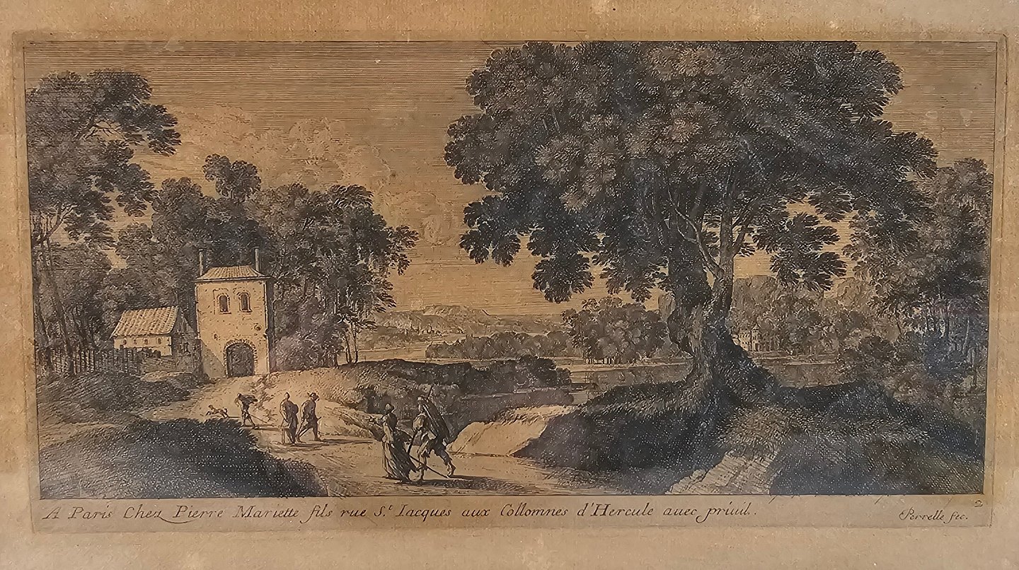 Bogtryk med motiv af landskab med et hus, en bro og mennesker der går.