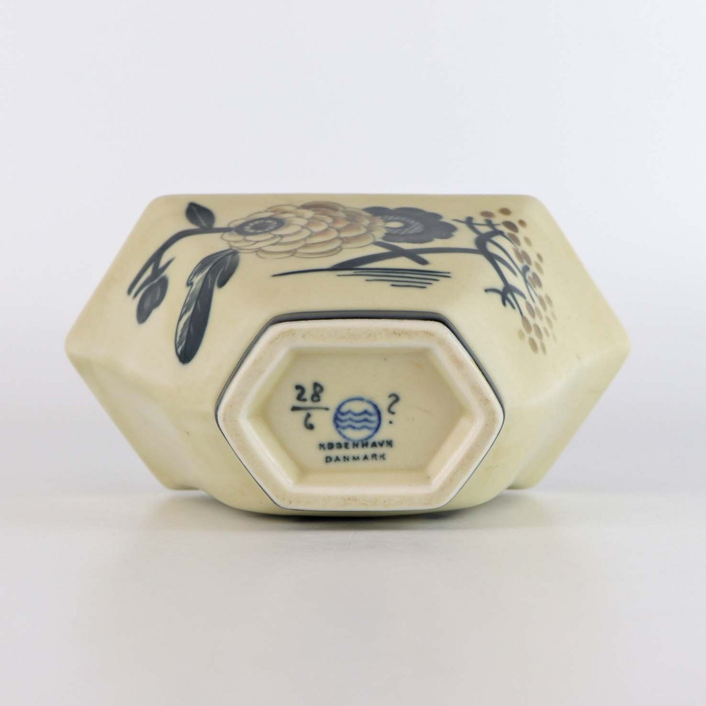 Kongelig sekskantet vase i mat porcelæn med motiv af blomster med blå streg på cremefarvet baggrund. Nr. 28/6