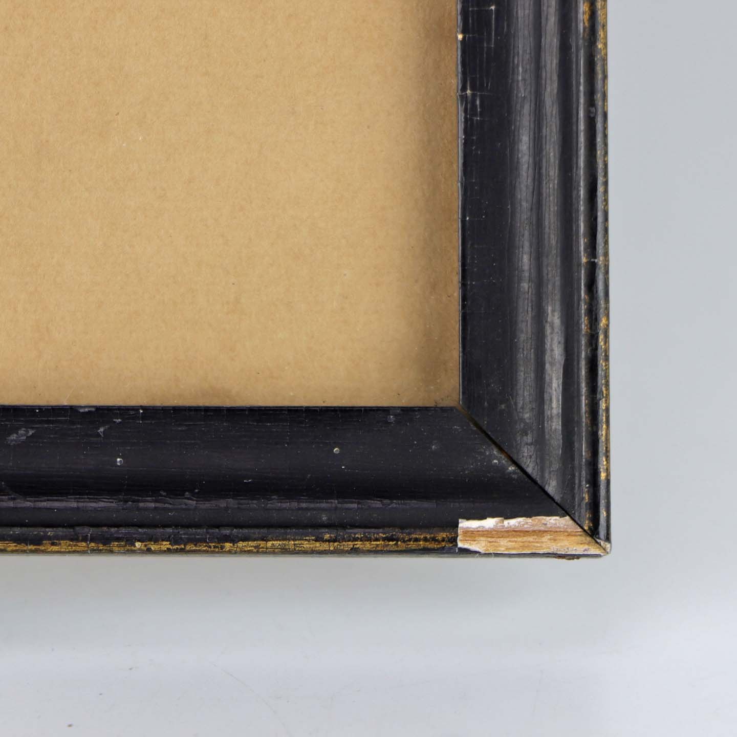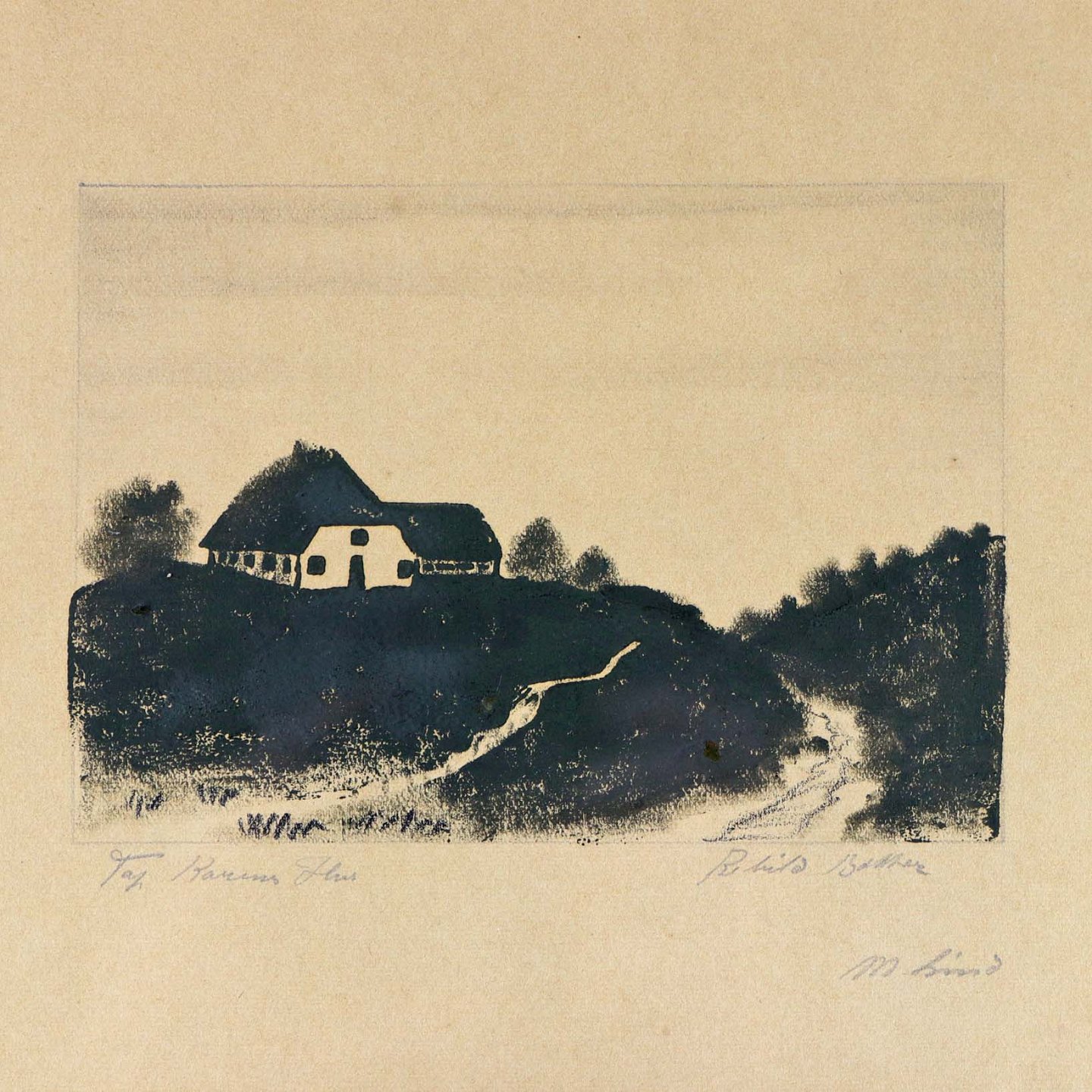 Indrammmet tryk i sortmalet træramme med motiv af Top Karens hus i Rebild Bakker