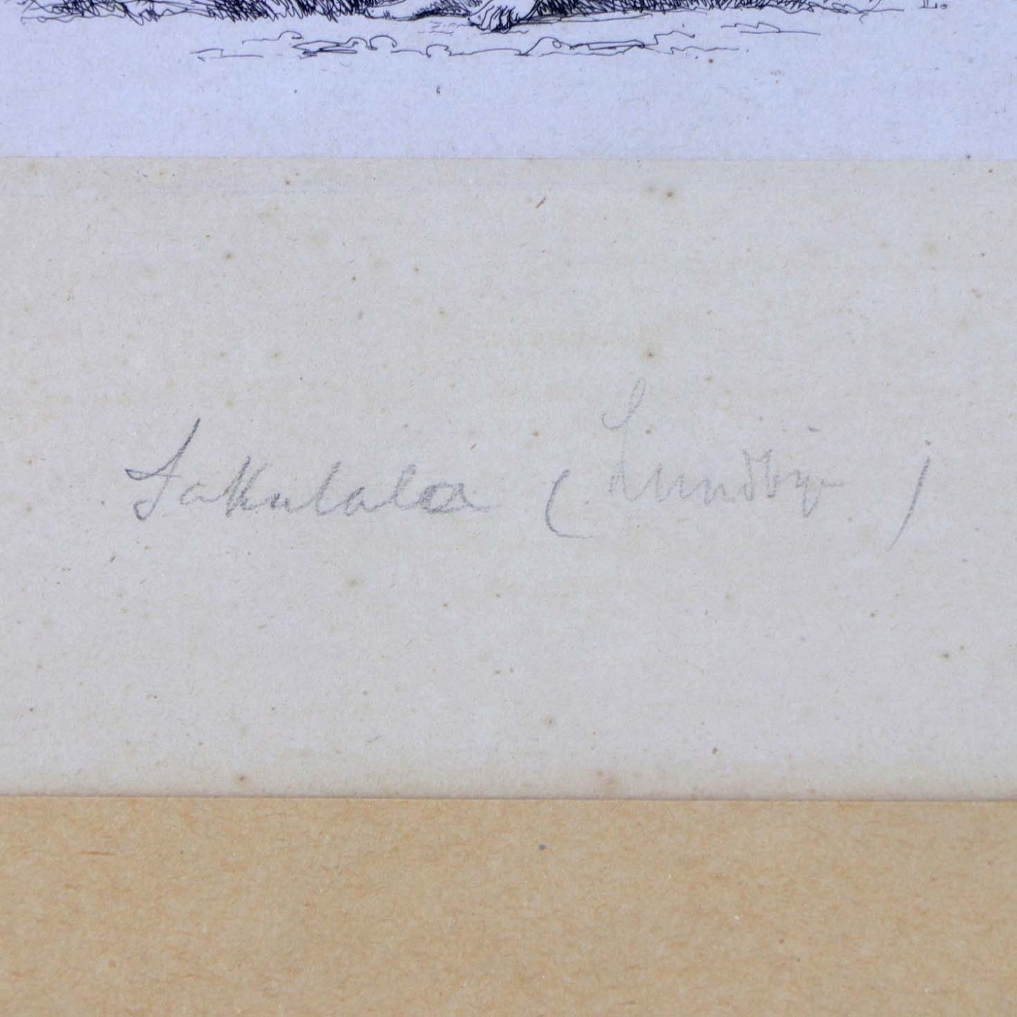 Indrammet ældre radering med passepartout i guldmalet træramme med motiv af ryggen af en kvinde med blomster i favnen og teksten Sakunfala, Skuespil af Kalidasos.