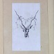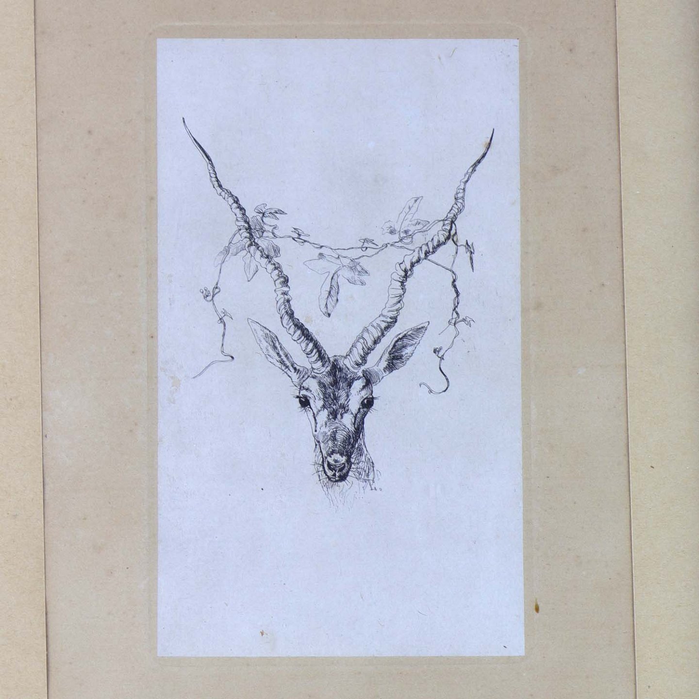 Indrammet antik radering med passepartout i guldmalet træramme med motiv af antilope med slyngplante omviklet geviret. Dateret til 1855