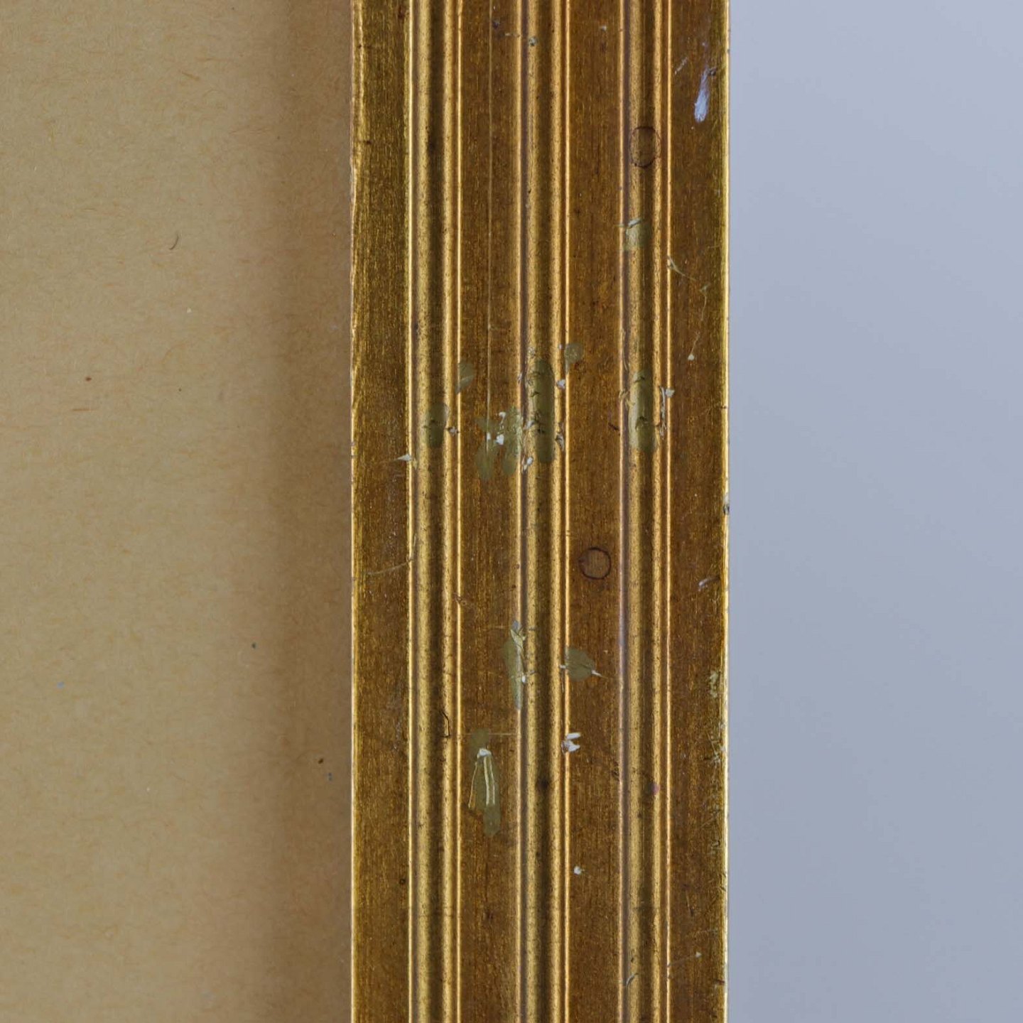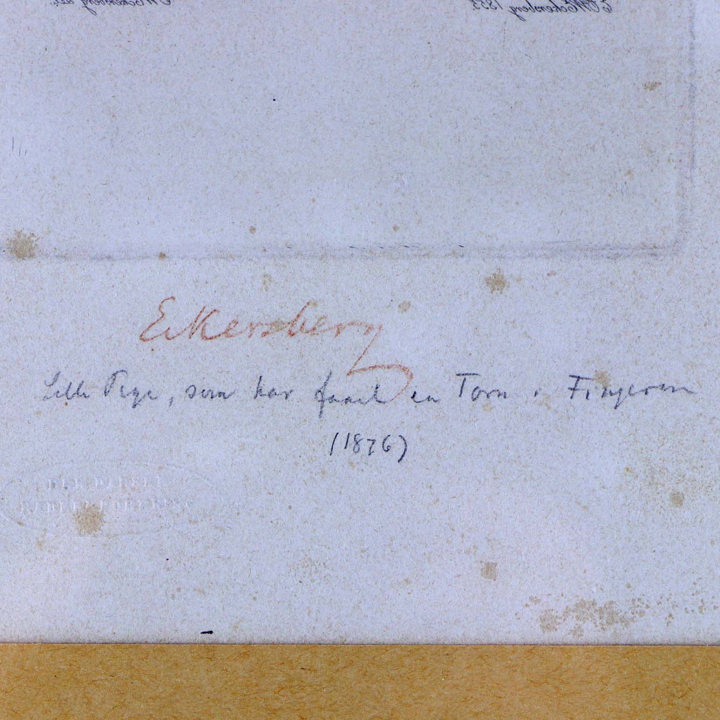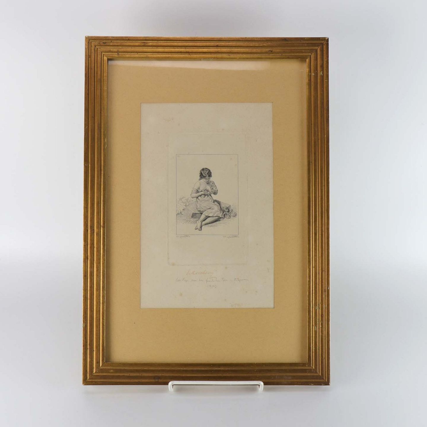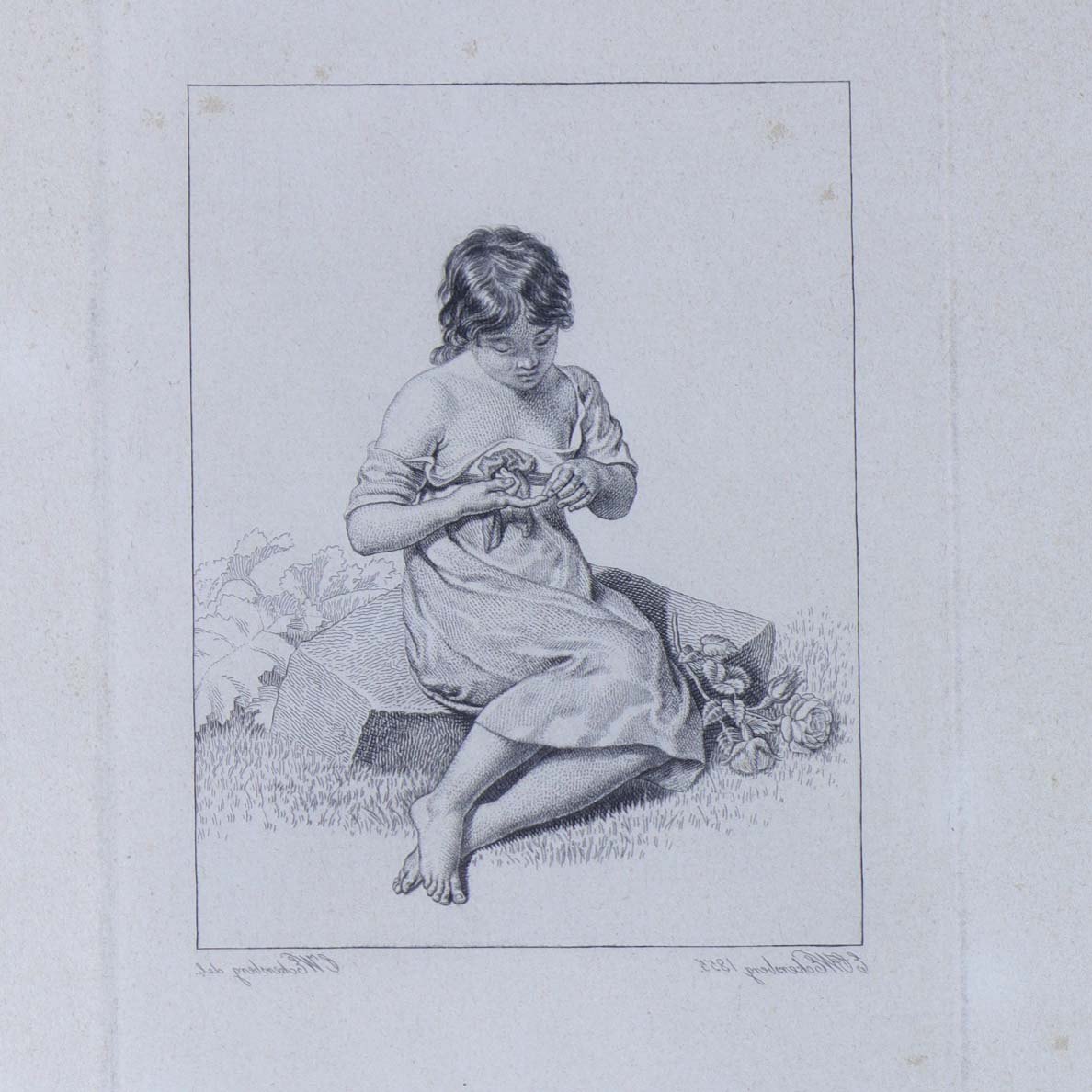 Indrammet ældre kobbertryk med passepartout i guldmalet træramme med motiv af siddende pige. Titlen Lille pige med torn i fingeren, år 1876. Trykket er fremstillet spejlvendt.