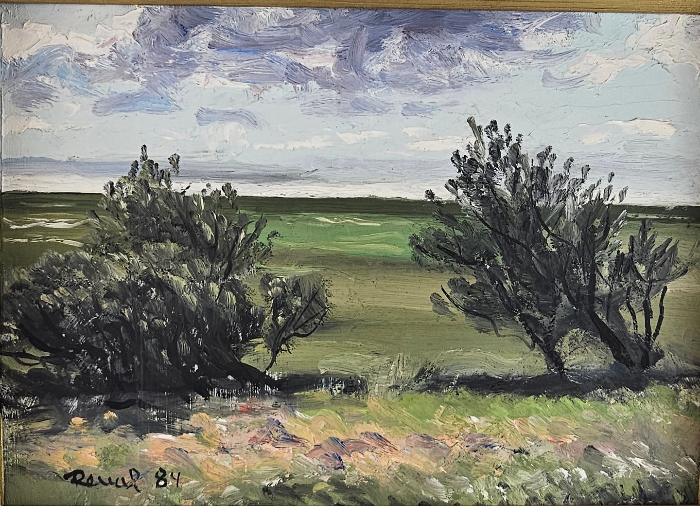 Oliemaleri i guldramme med motiv af et landskab med to lave træer.