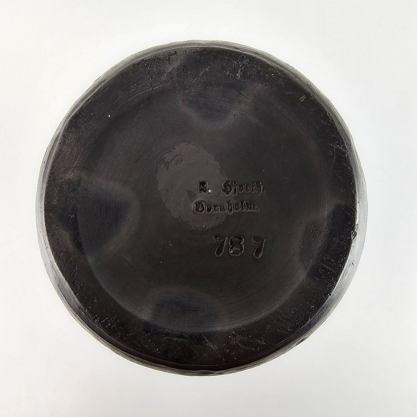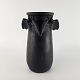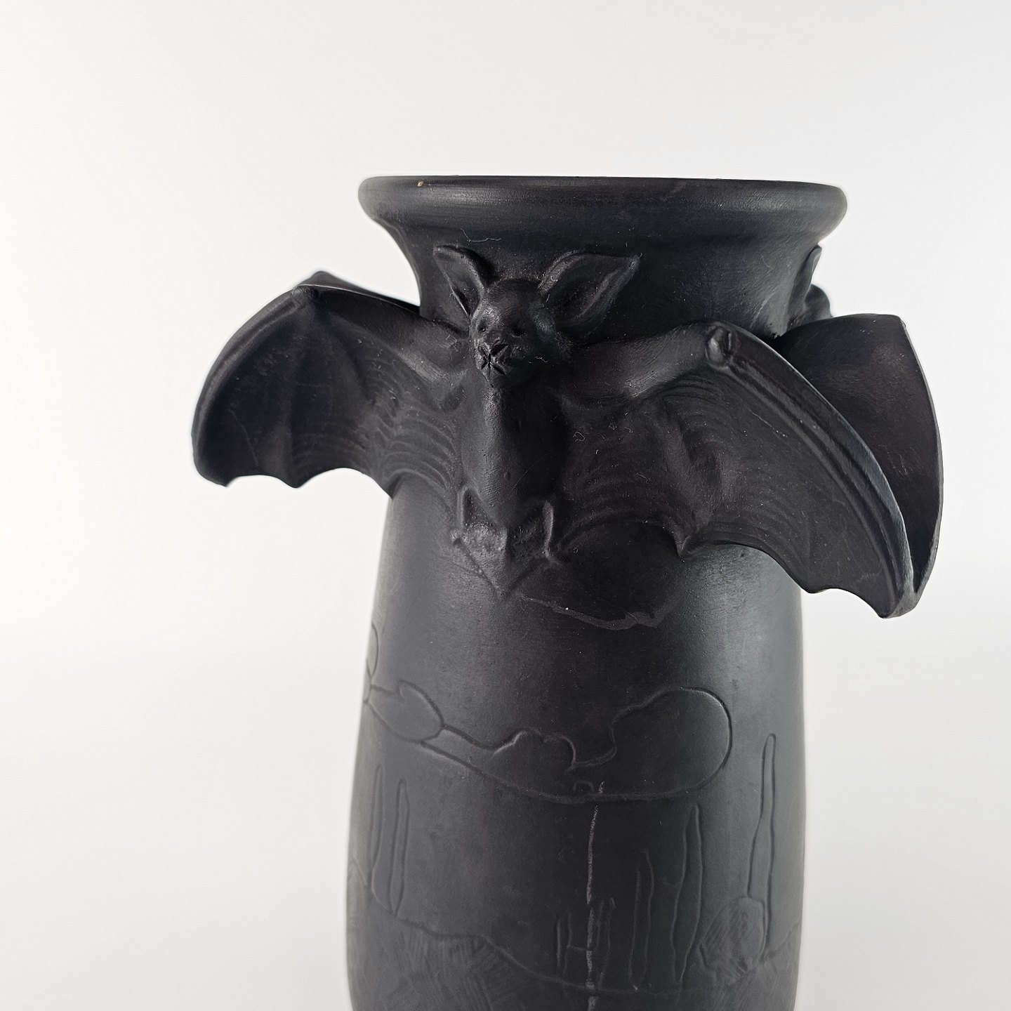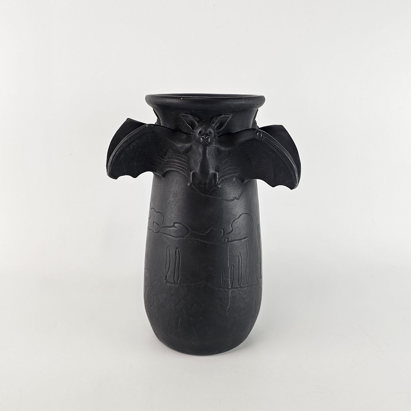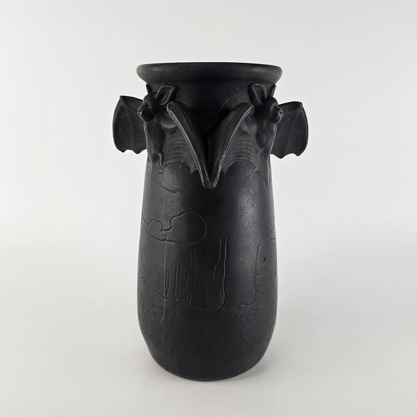 Høj sort vase, af terracotta, med dekoration af tre flagermus, vinge ved vinge. Nr 787
