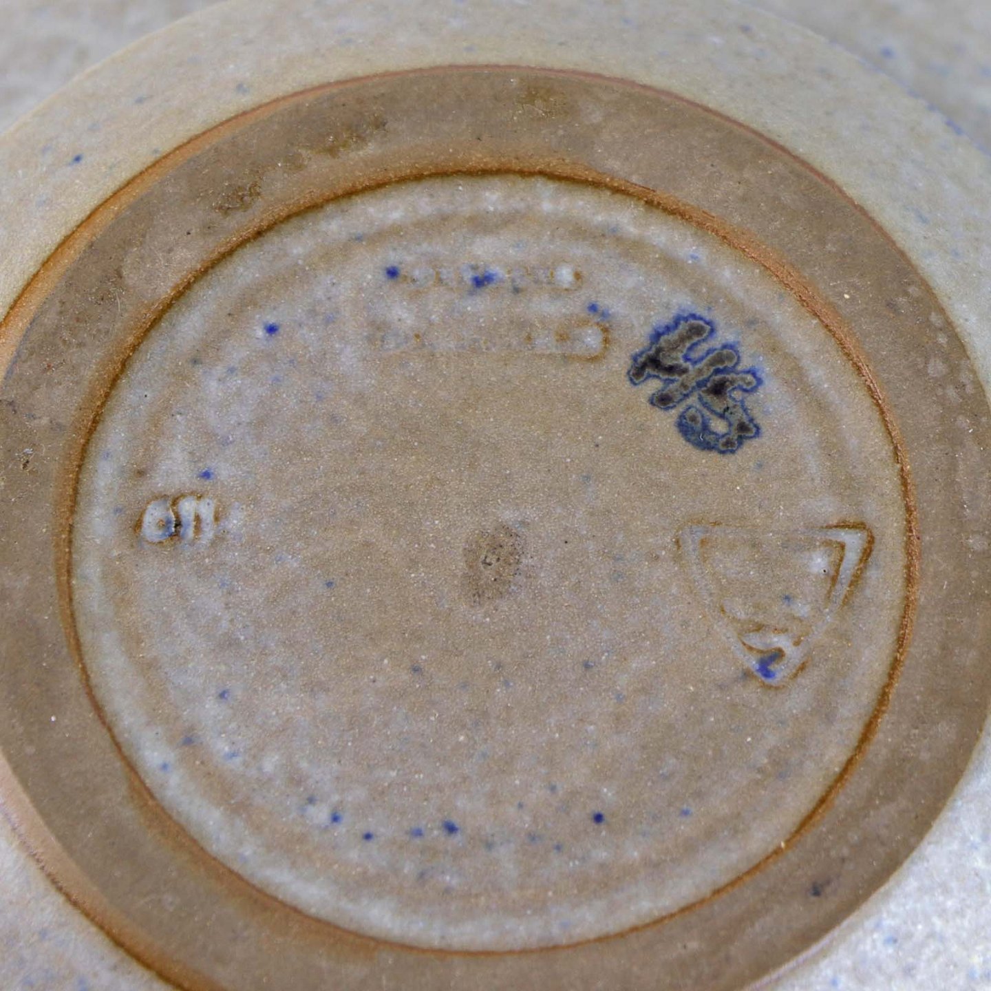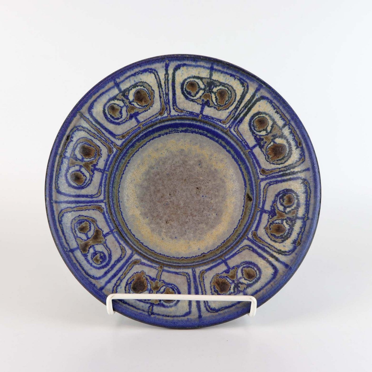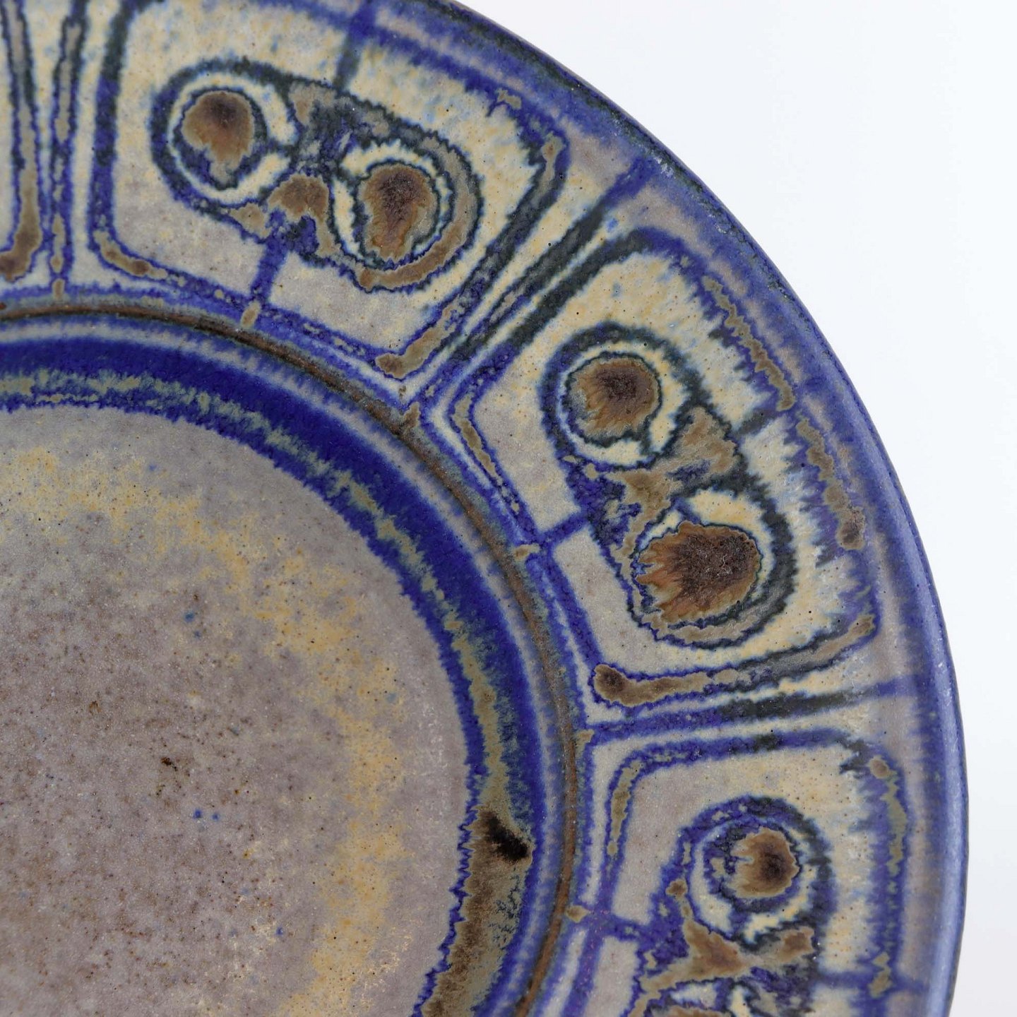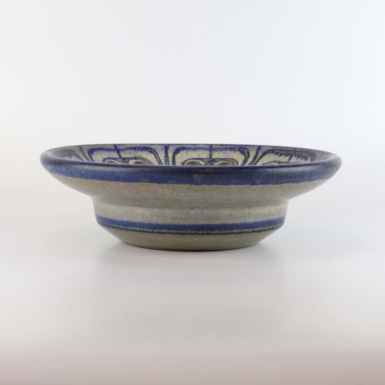 Dyb skål eller bordfad i glaseret stentøj med abstrakt motiv i blå nuancer. Nr. 611
