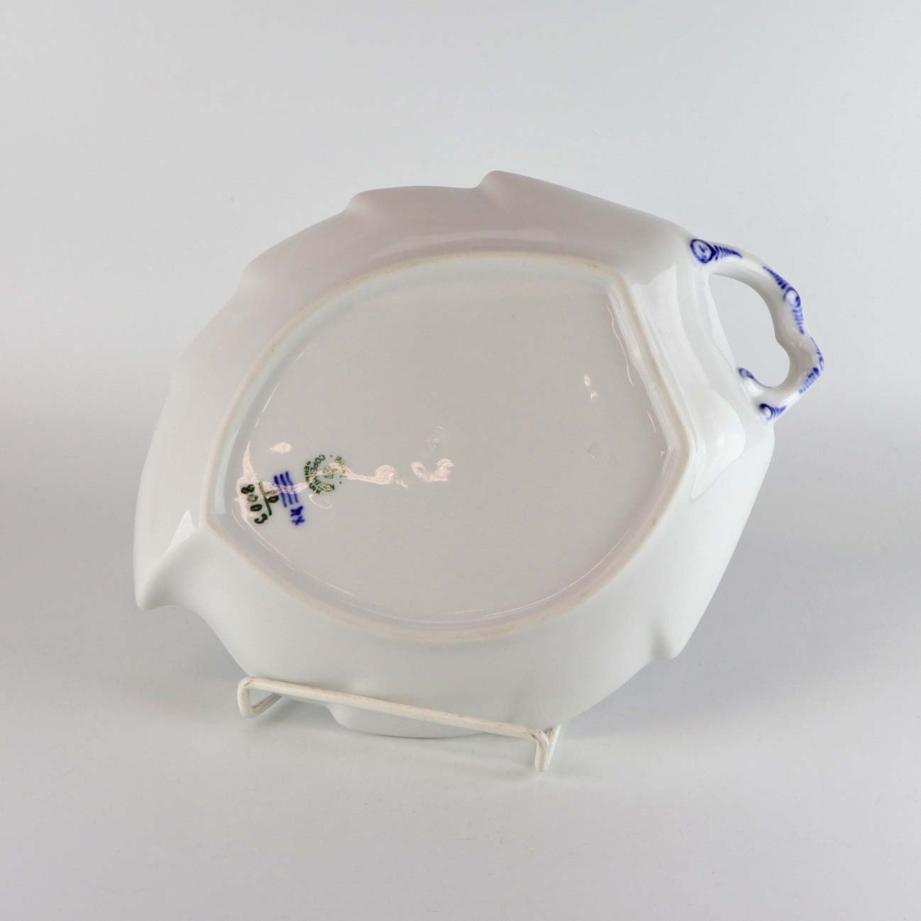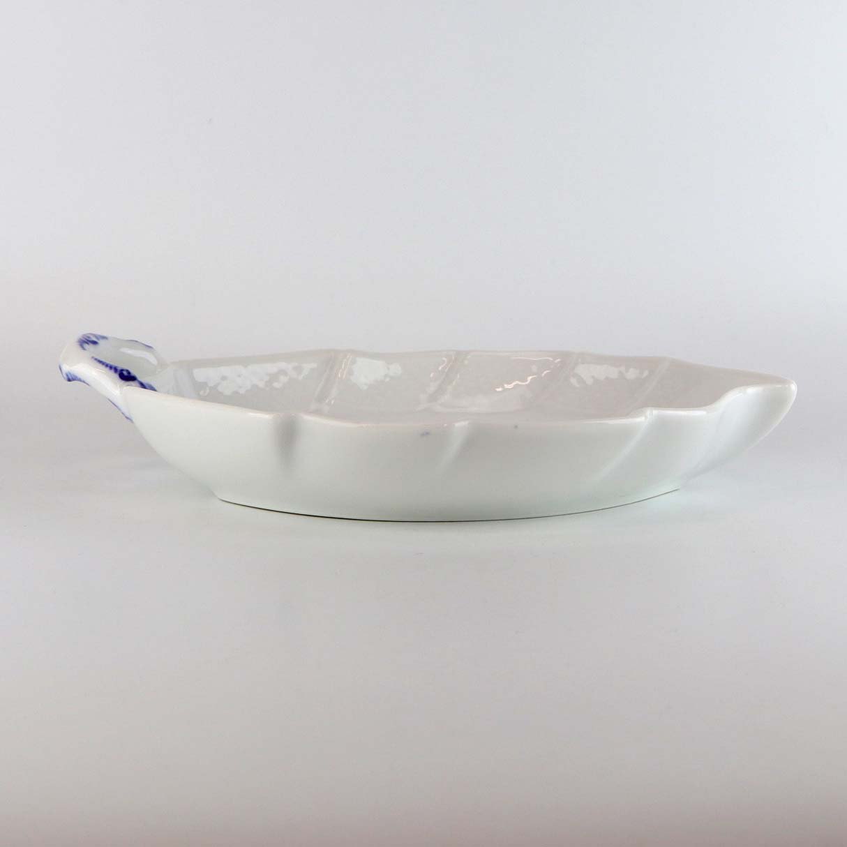 Kongelig bladformet kagefad i porcelæn med hank fra stellet Blå blomst flettet. Nr. 10/8003