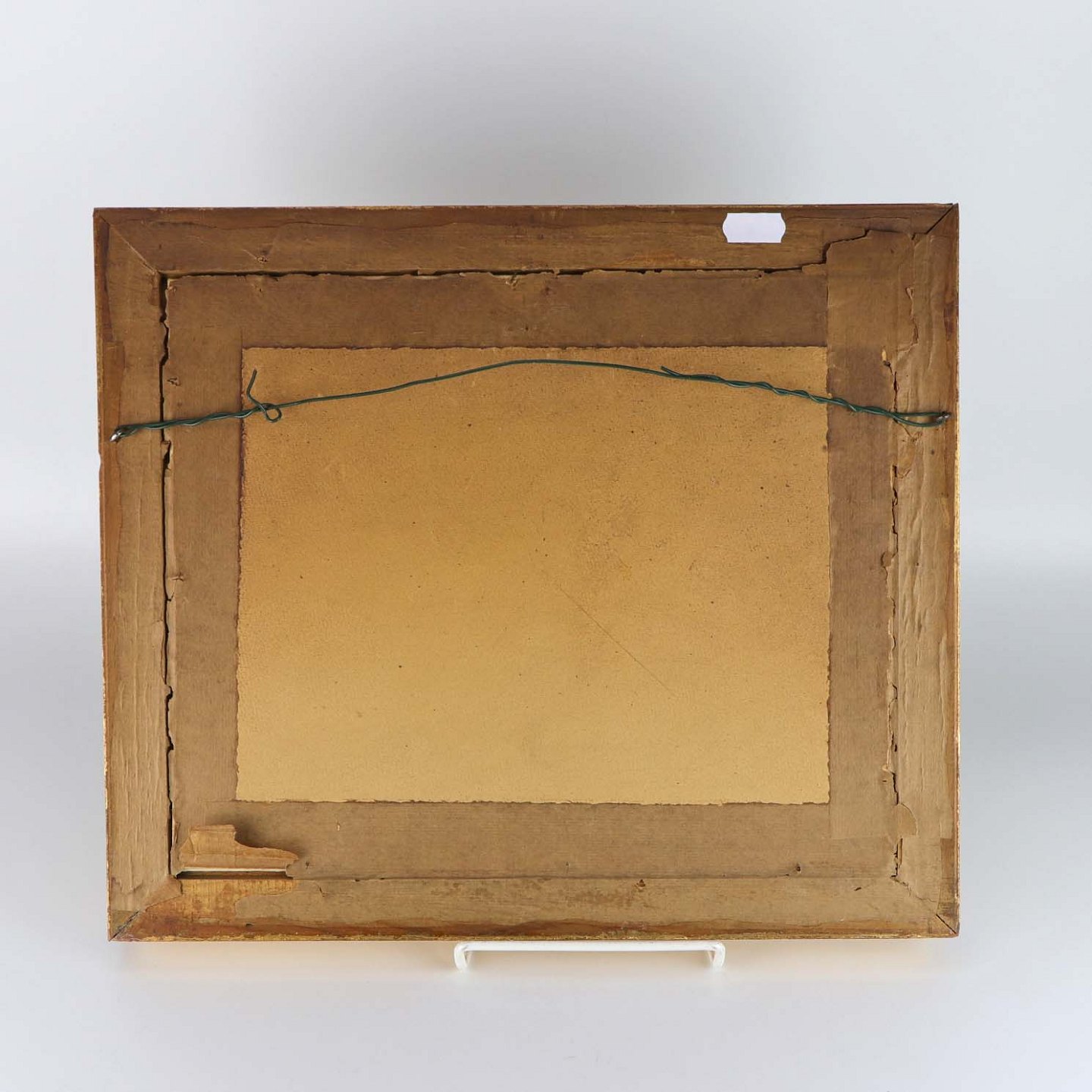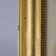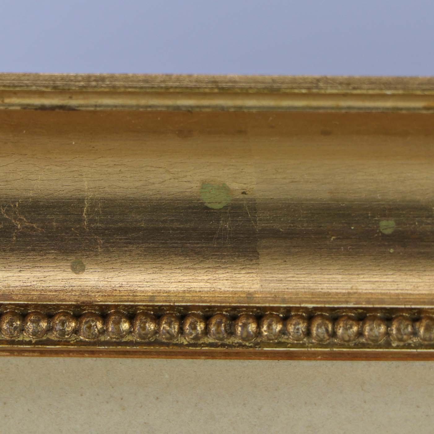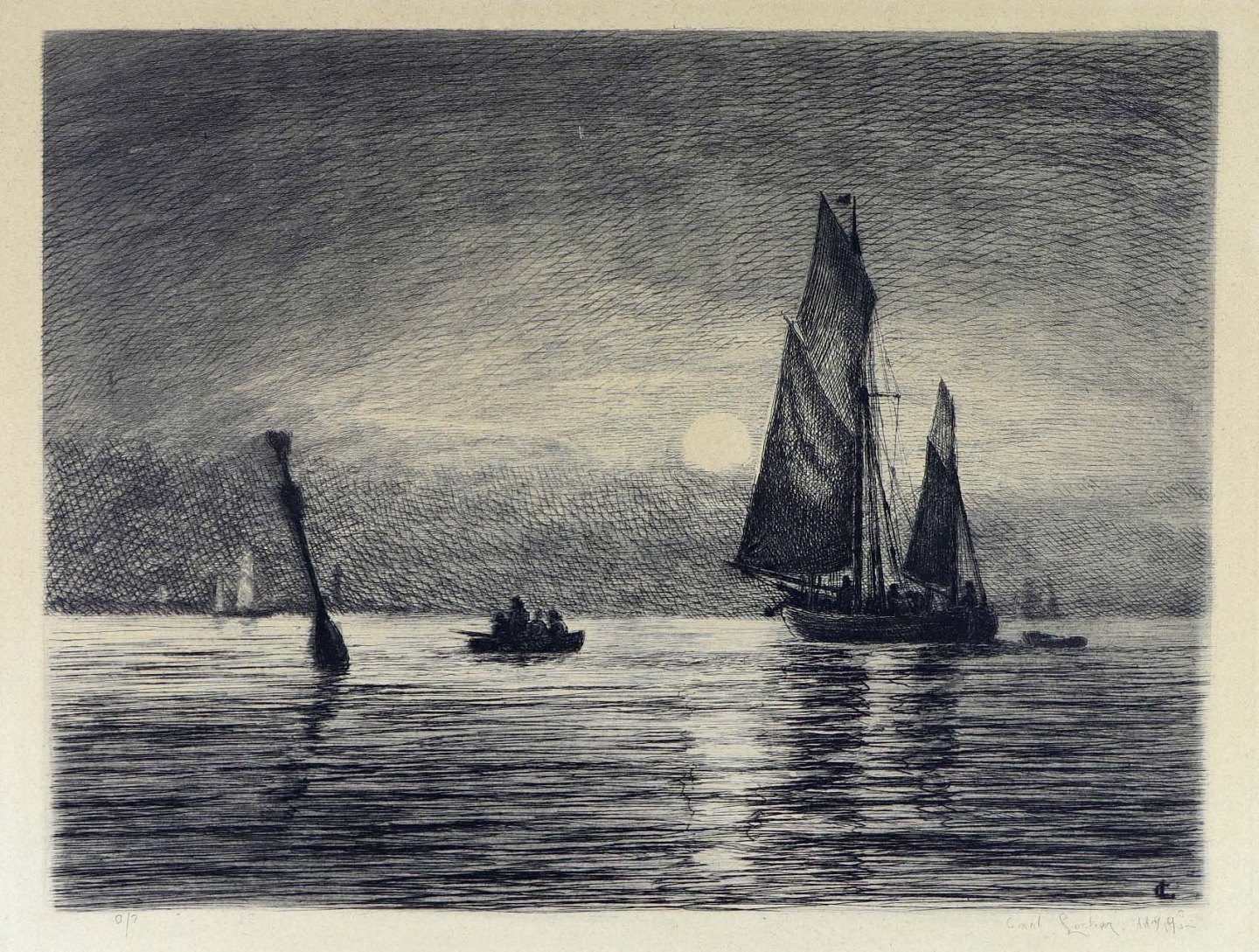 Indrammet radering i guldmalet træramme med landskabsmotiv af seljskib og båd på hav.
