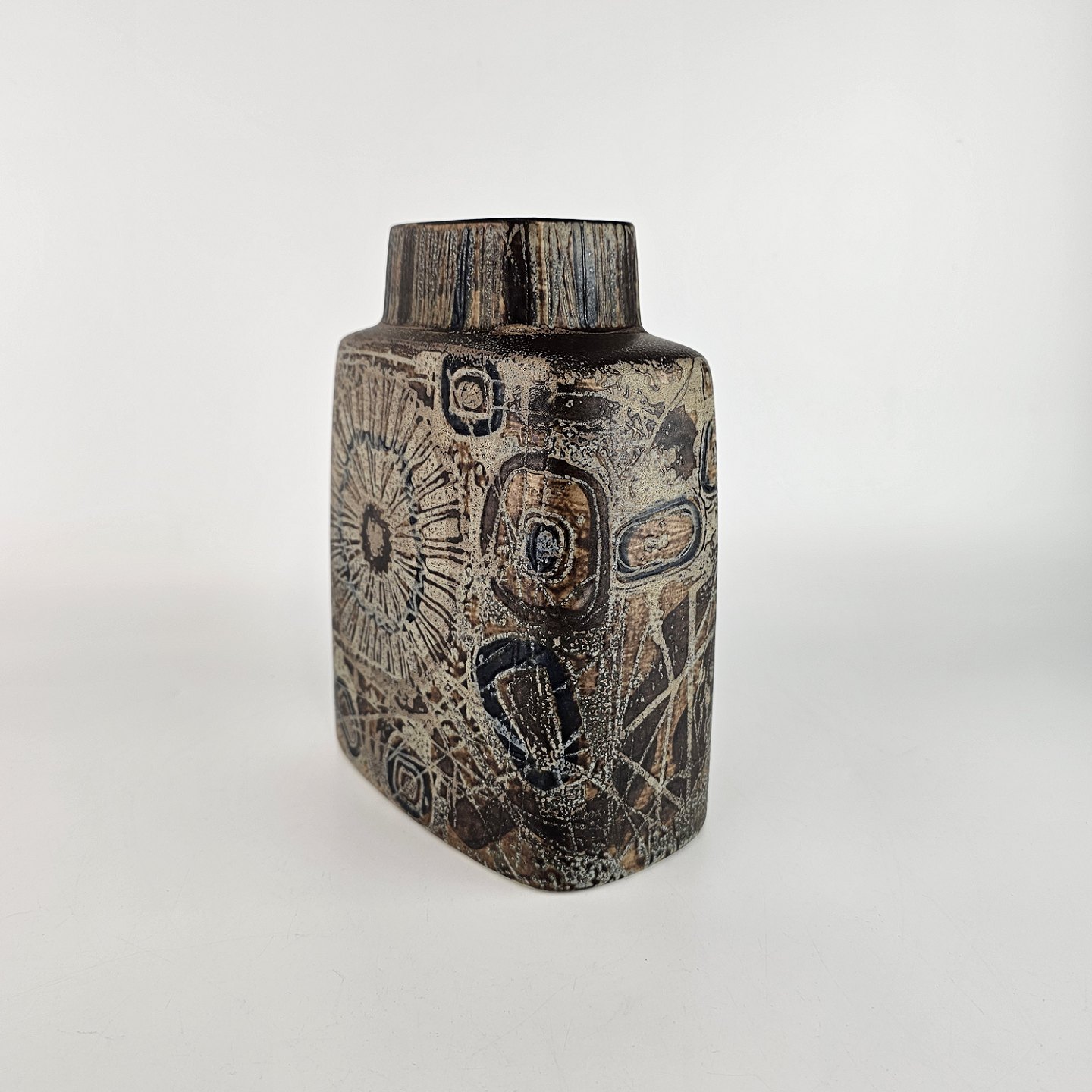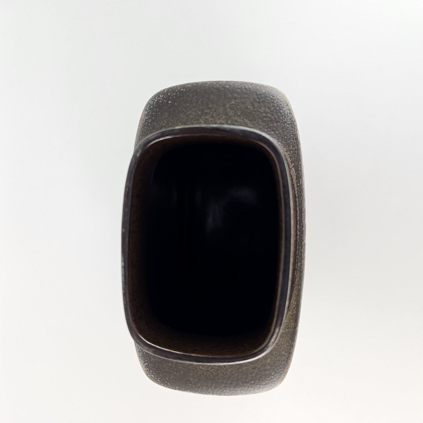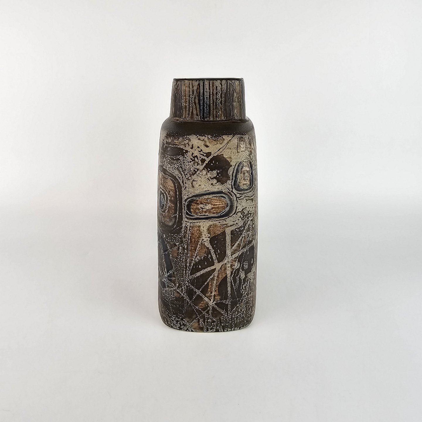 Kantet høj vase i fajance, med mønster i brune nuancer.