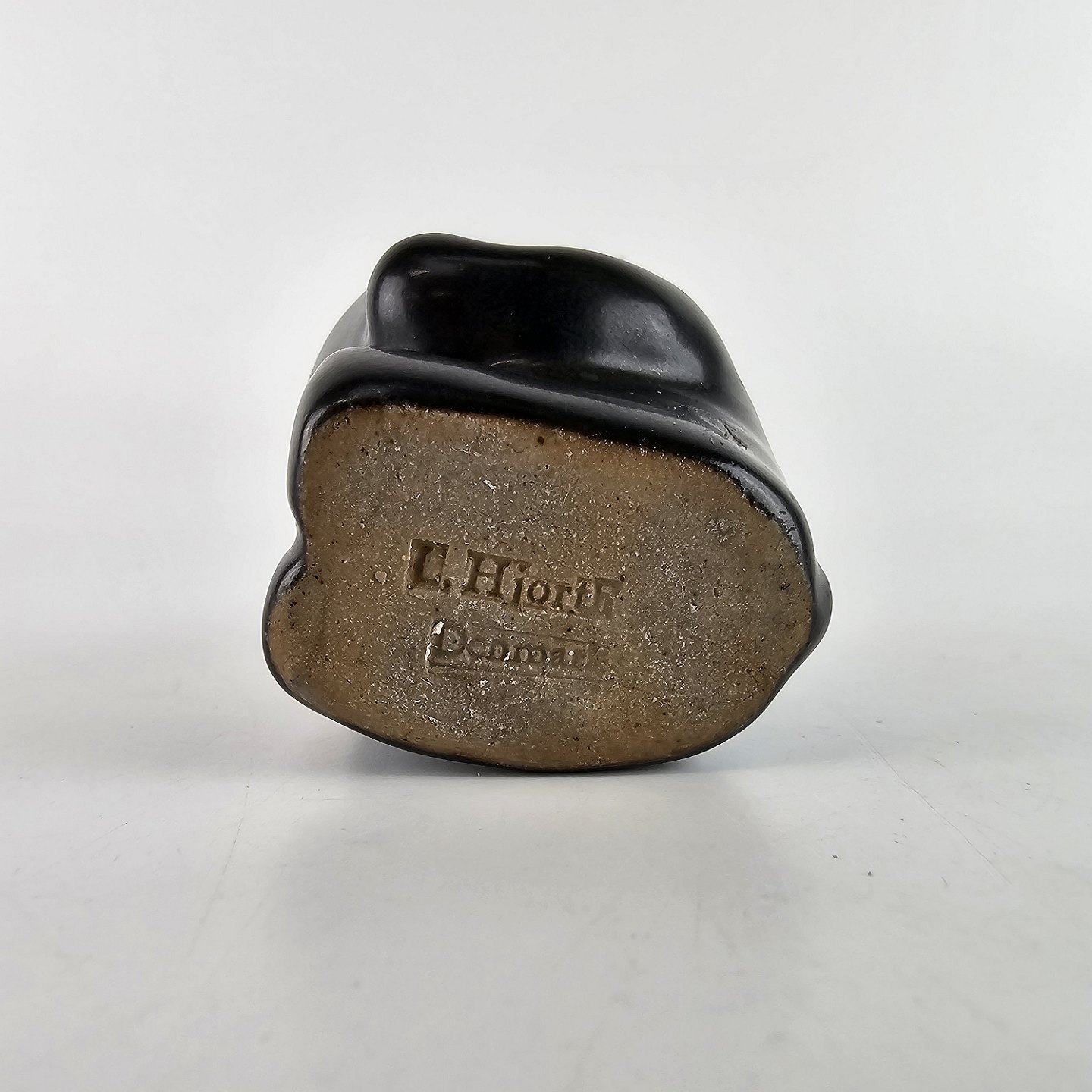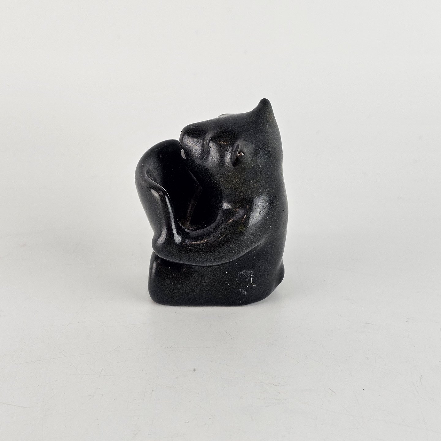 Sortglaseret keramikfigur med motiv af en bjørn som læser en bog.