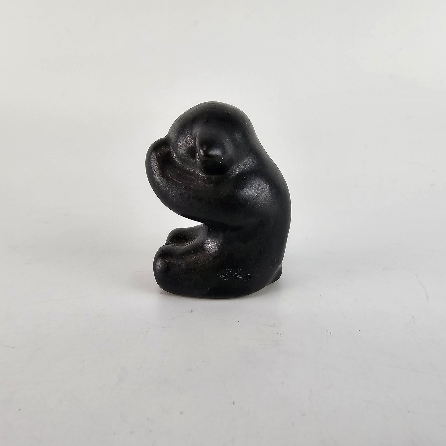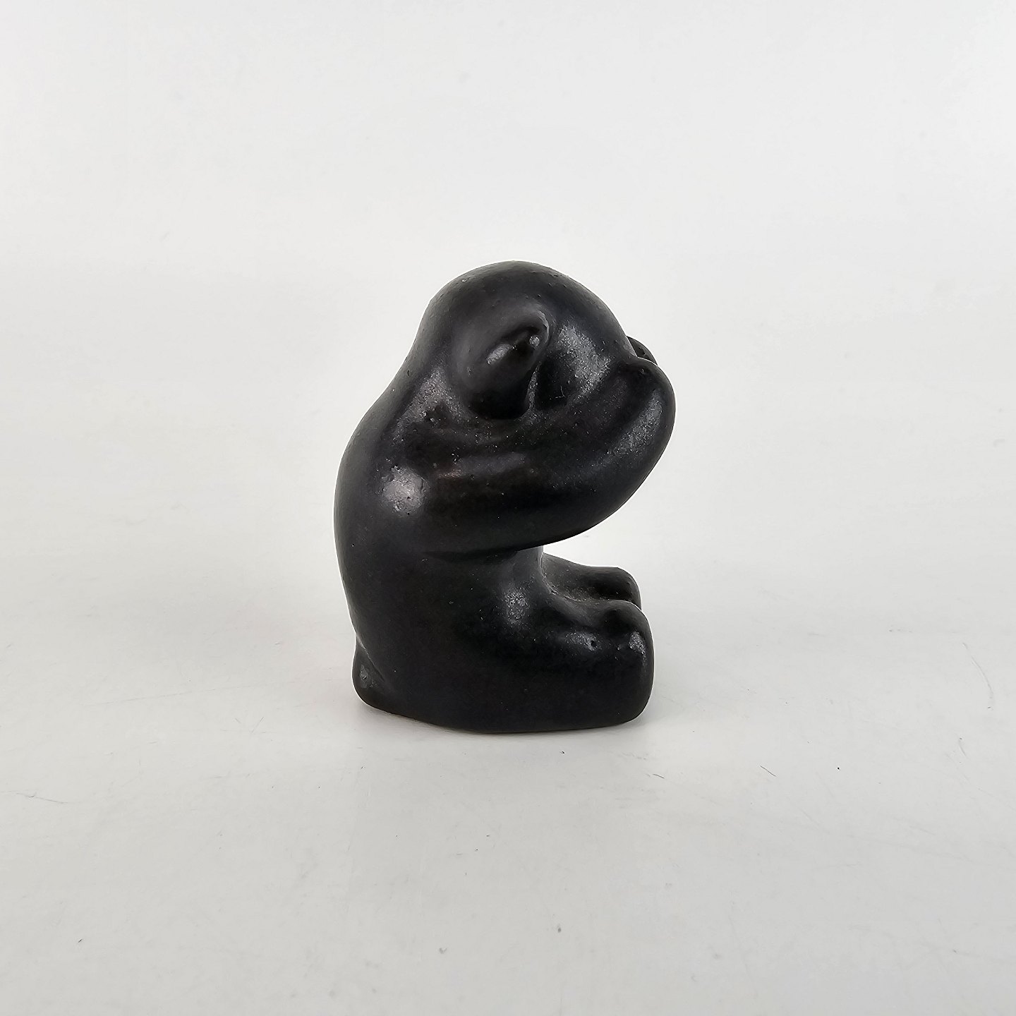 Sortglaseret keramikfigur med motiv af en bjørn som holder sig for øjnene.