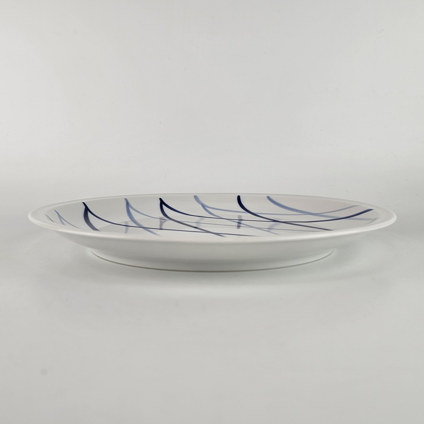 Blå Flamme er hvidt ildfast porcelæn, dekoreret med blå striber, der ligner flammer.