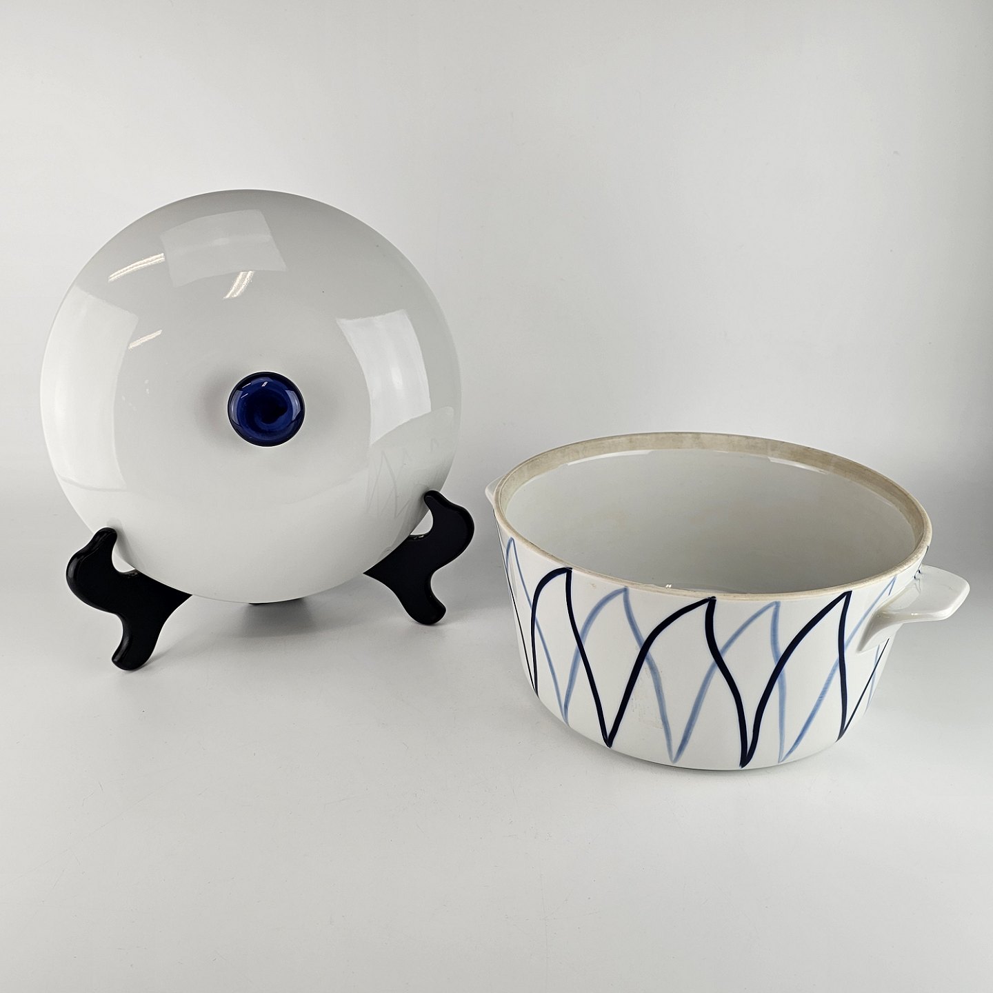 Blå Flamme er hvidt ildfast porcelæn, dekoreret med blå striber, der ligner flammer.