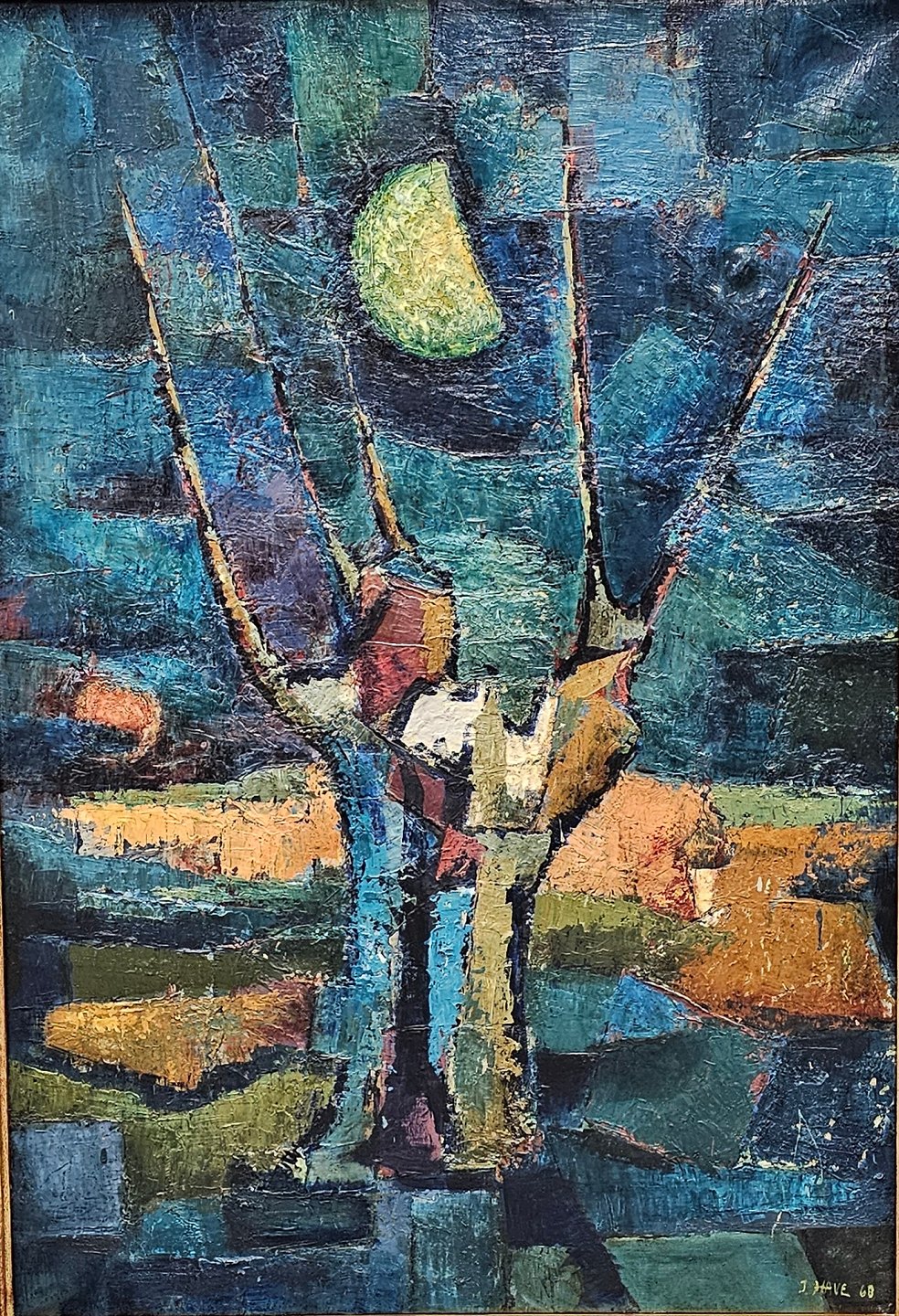 Oliemaleri på lærred, med abstrakt motiv af et træ i måneskær. Sat i brun træramme