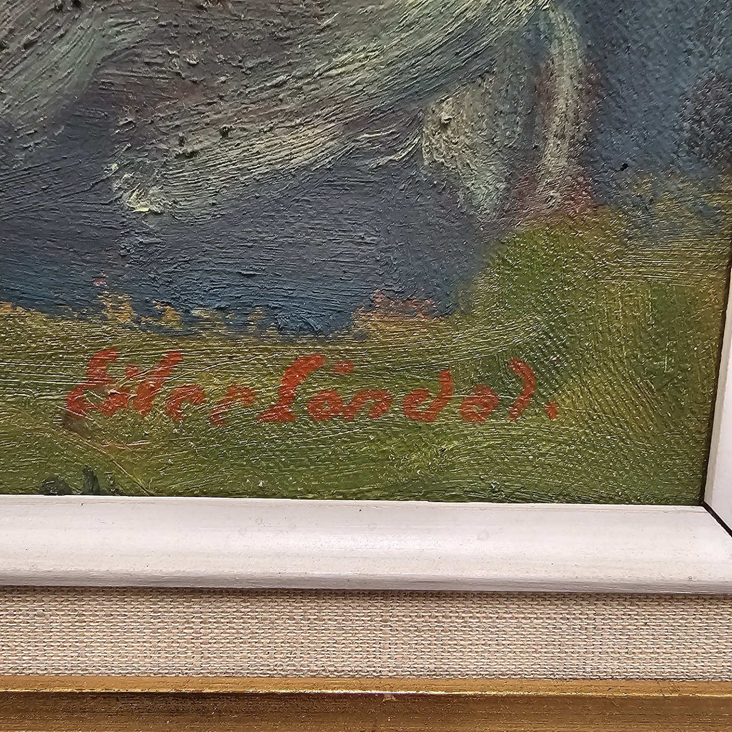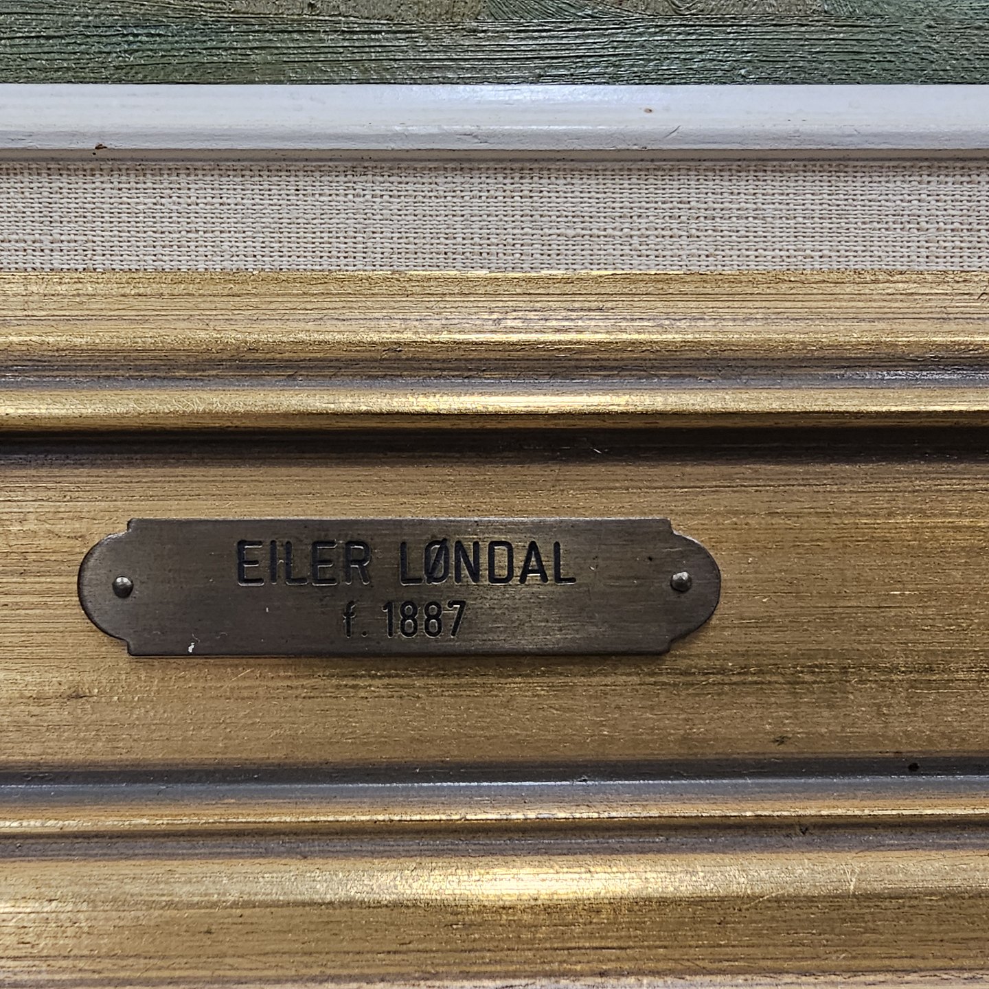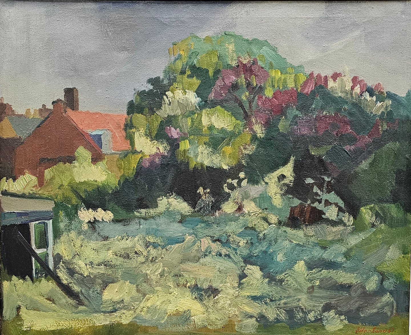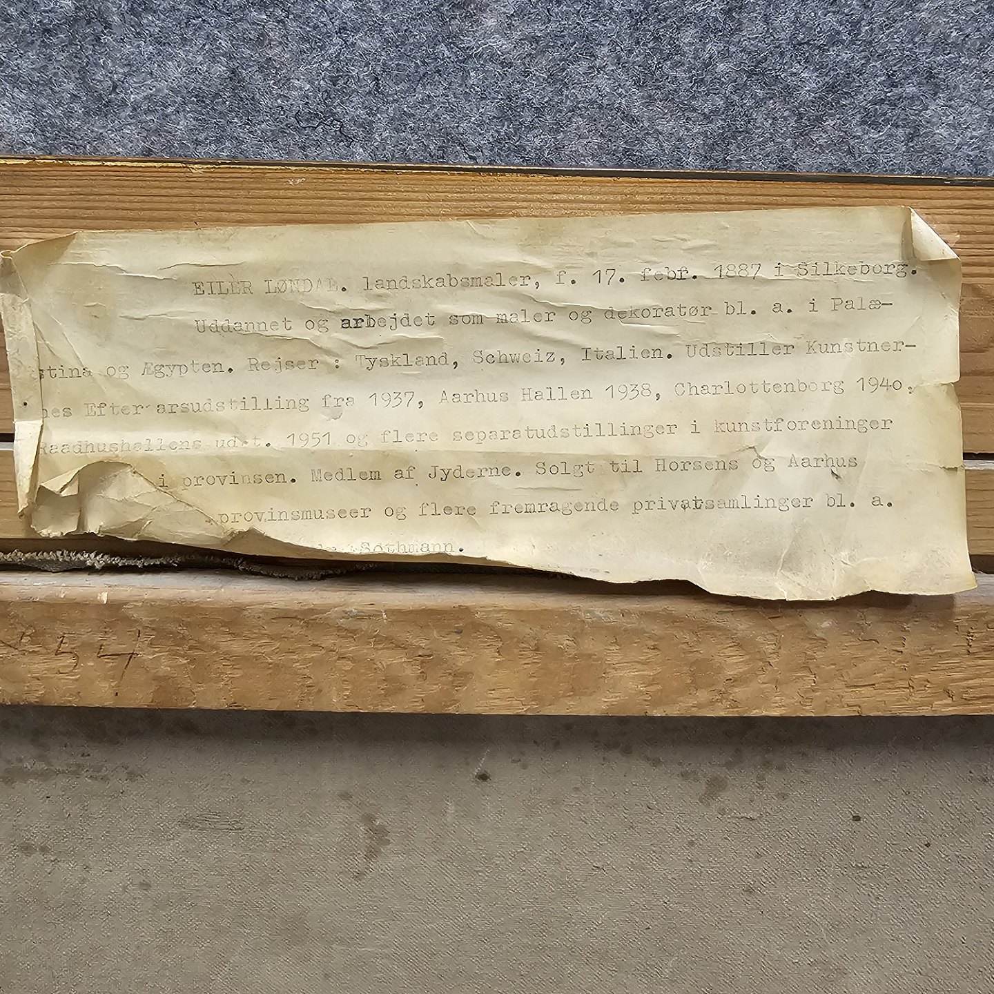 Oliemaleri på lærred, med motiv af buskads med huse. På rammen sidder en plakette med kunstnerens navn og fødselsår. Bagpå sidder en seddel med informationer om kunstneren