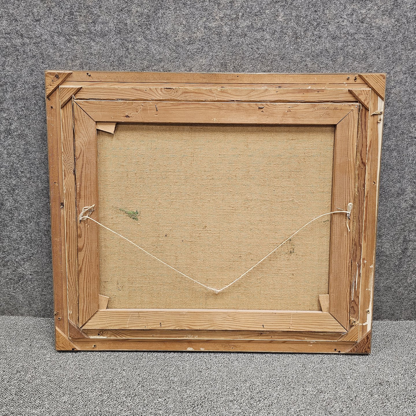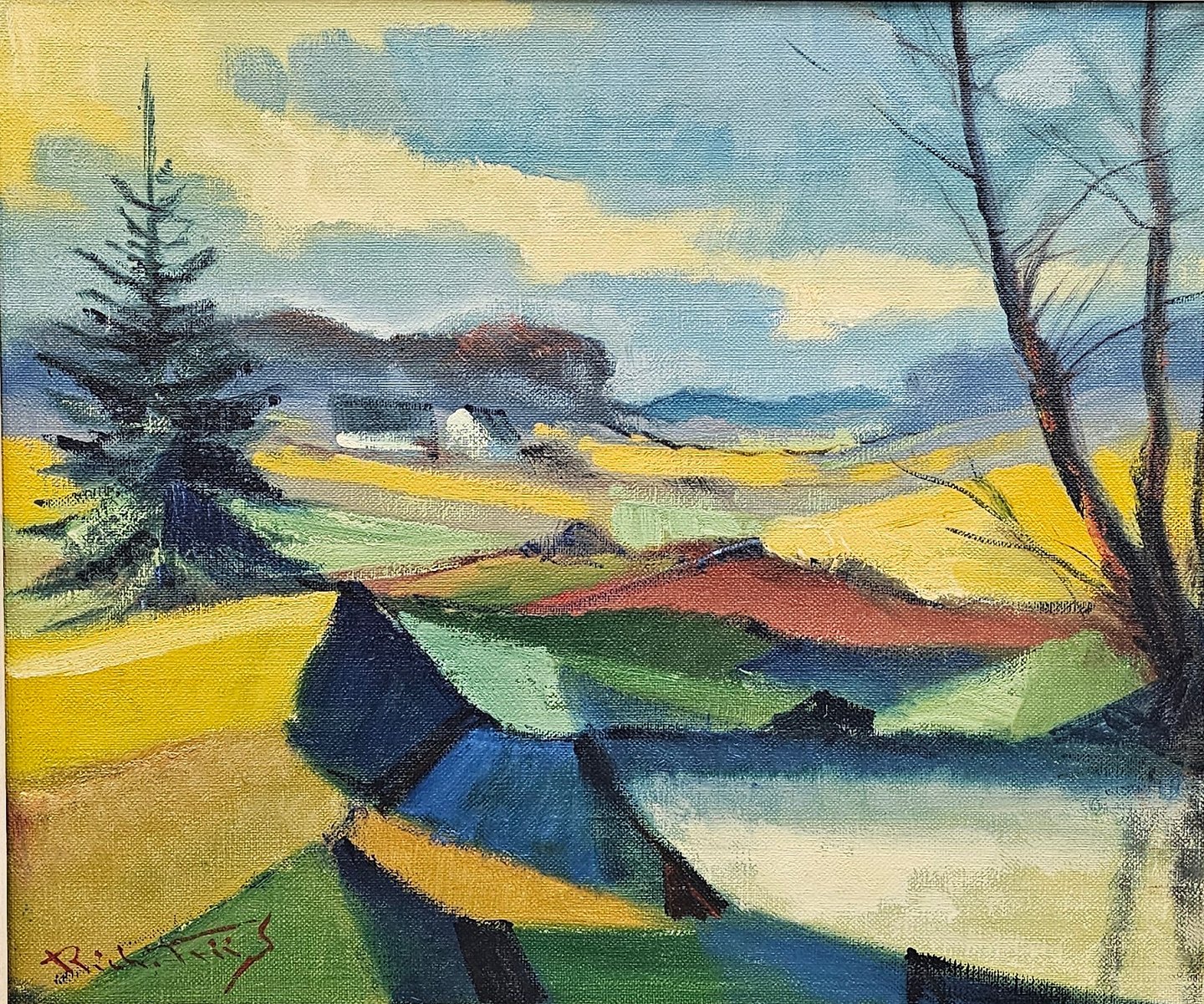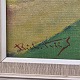 Oliemaleri på lærred med motiv af marker, træer og en gård. Maleriet sidder i en lys træramme