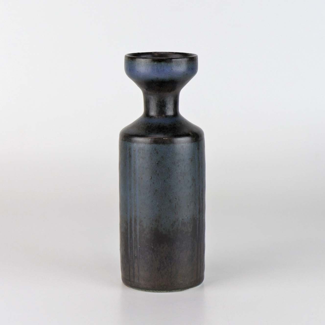 Vase i stentøj med hank med blåsort glasur samt abstrakt mønster af linjer og ovale cirkler.