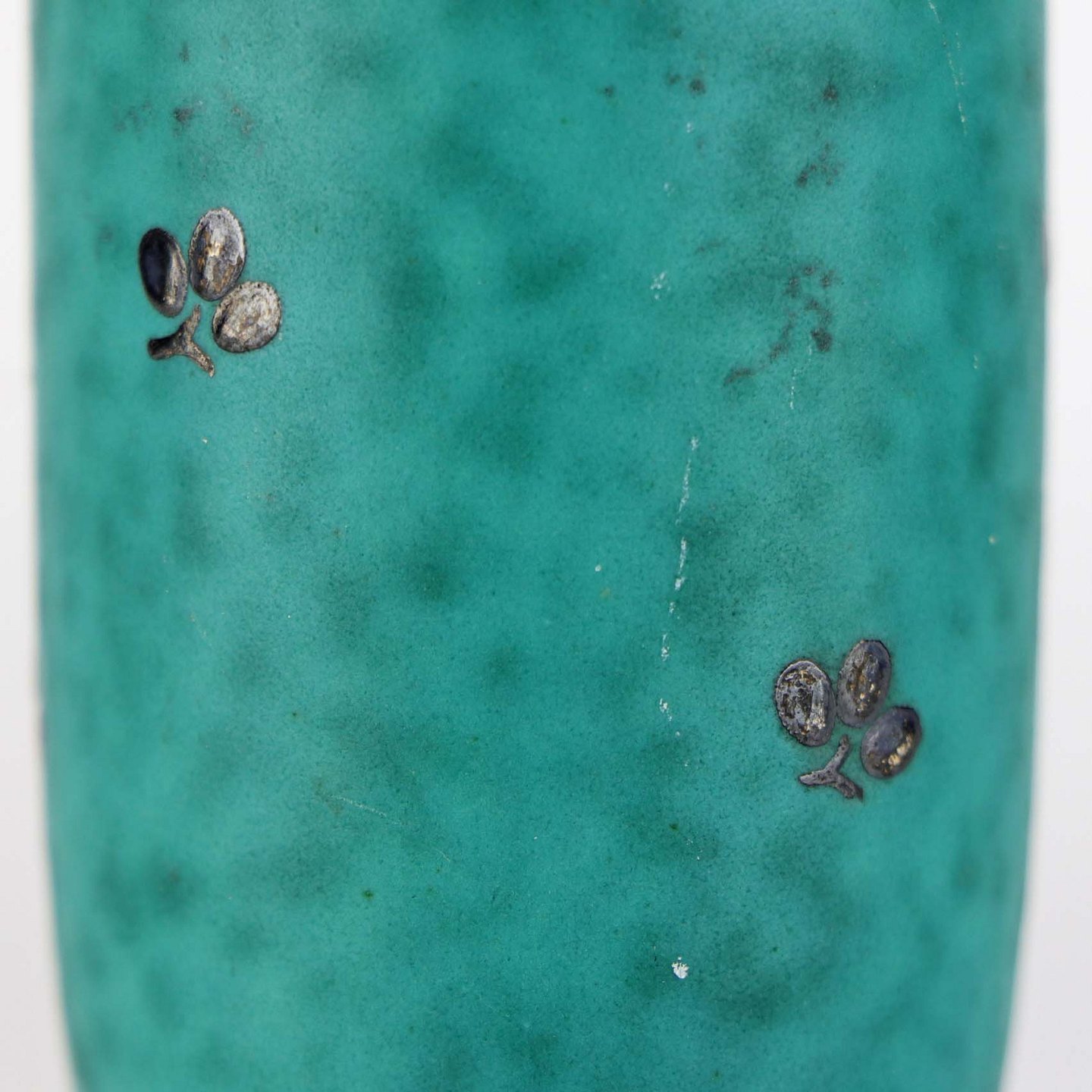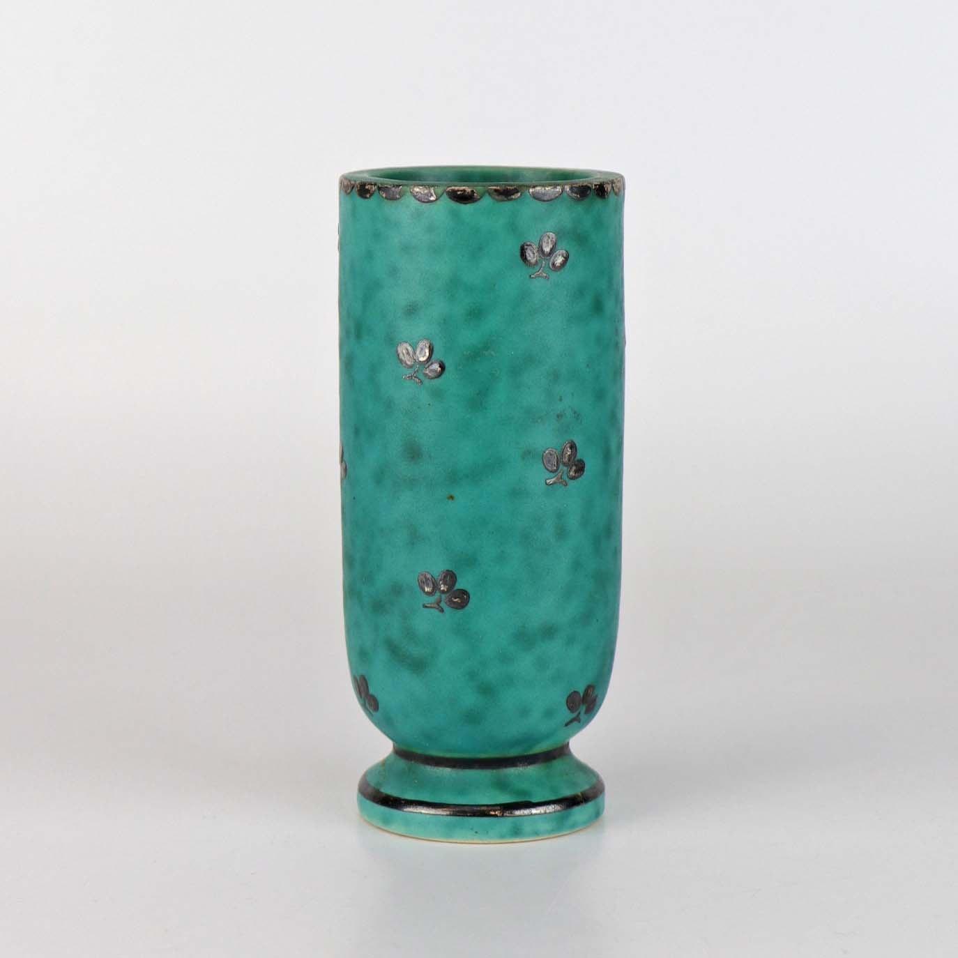 Lille art deco vase fra Argenta serien i søgrøn stentøj med motiv af sorte trekløvere. Nr. 1029