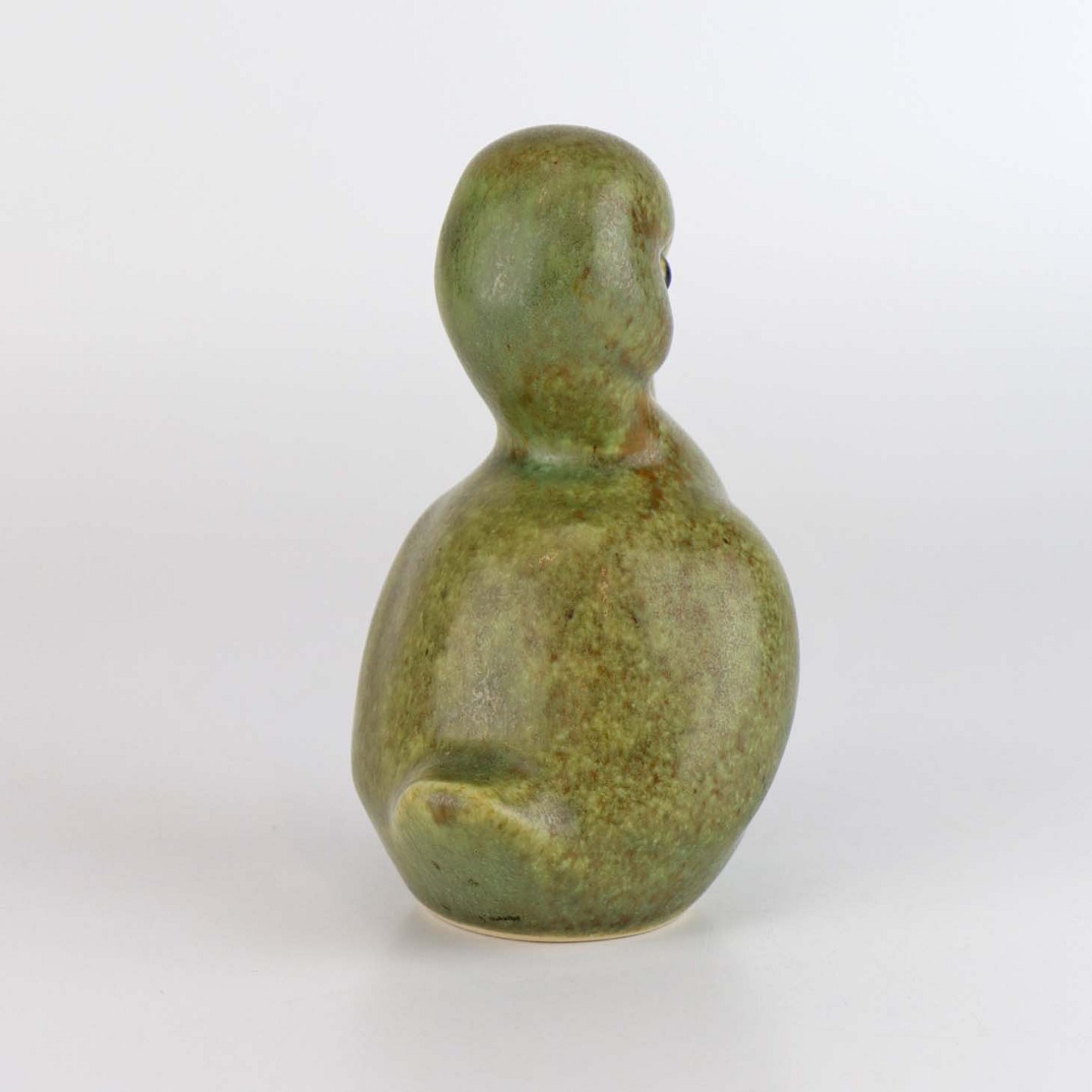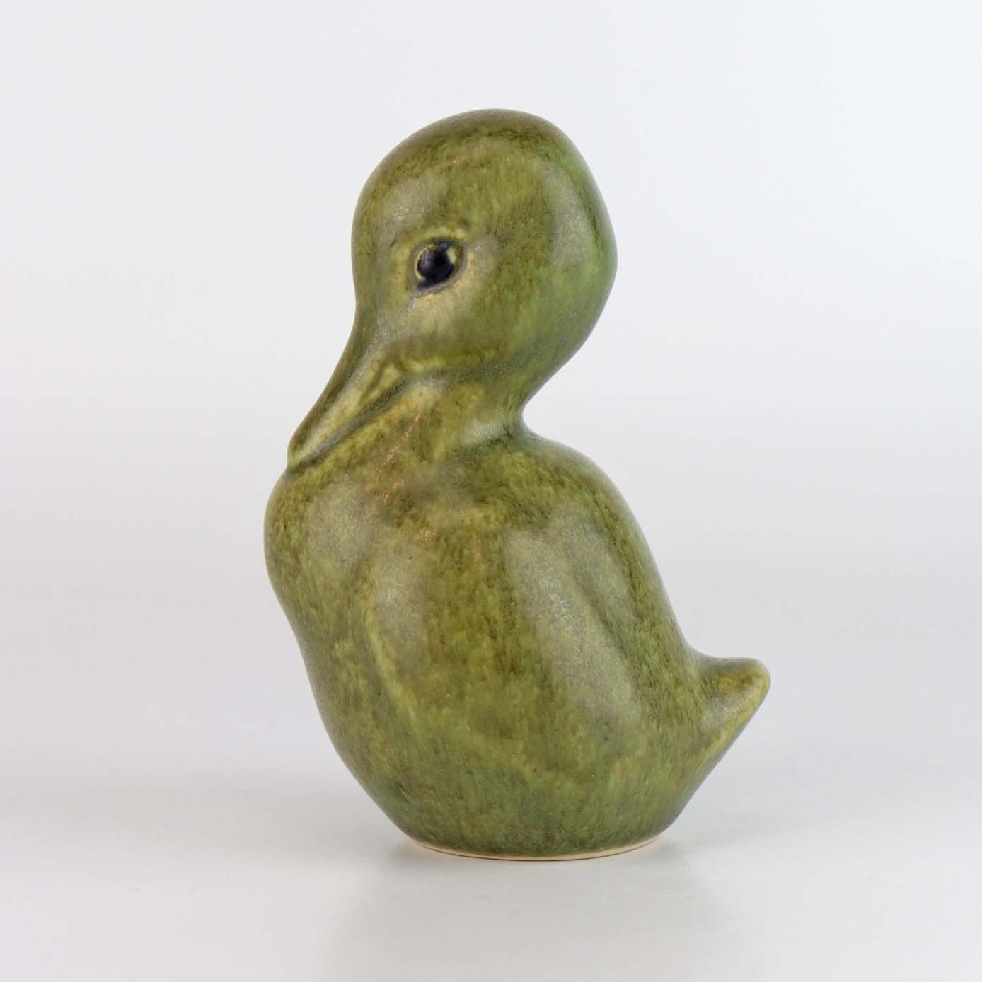 Figur i stentøj med grøn glasir og motiv af en ælling.