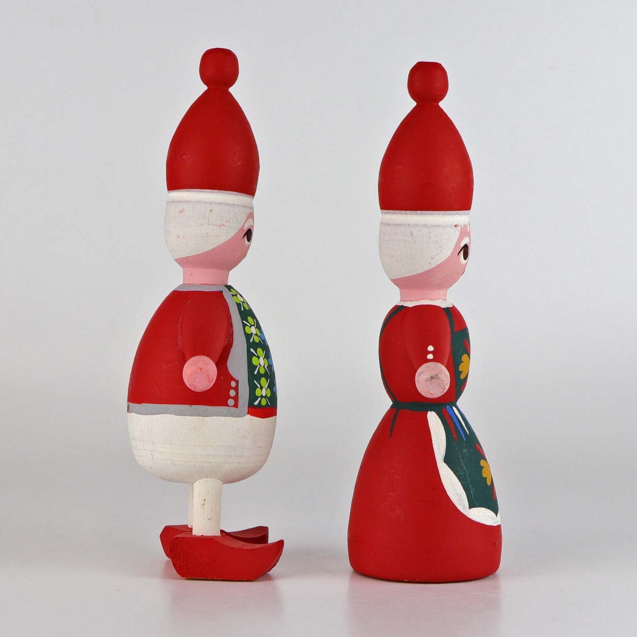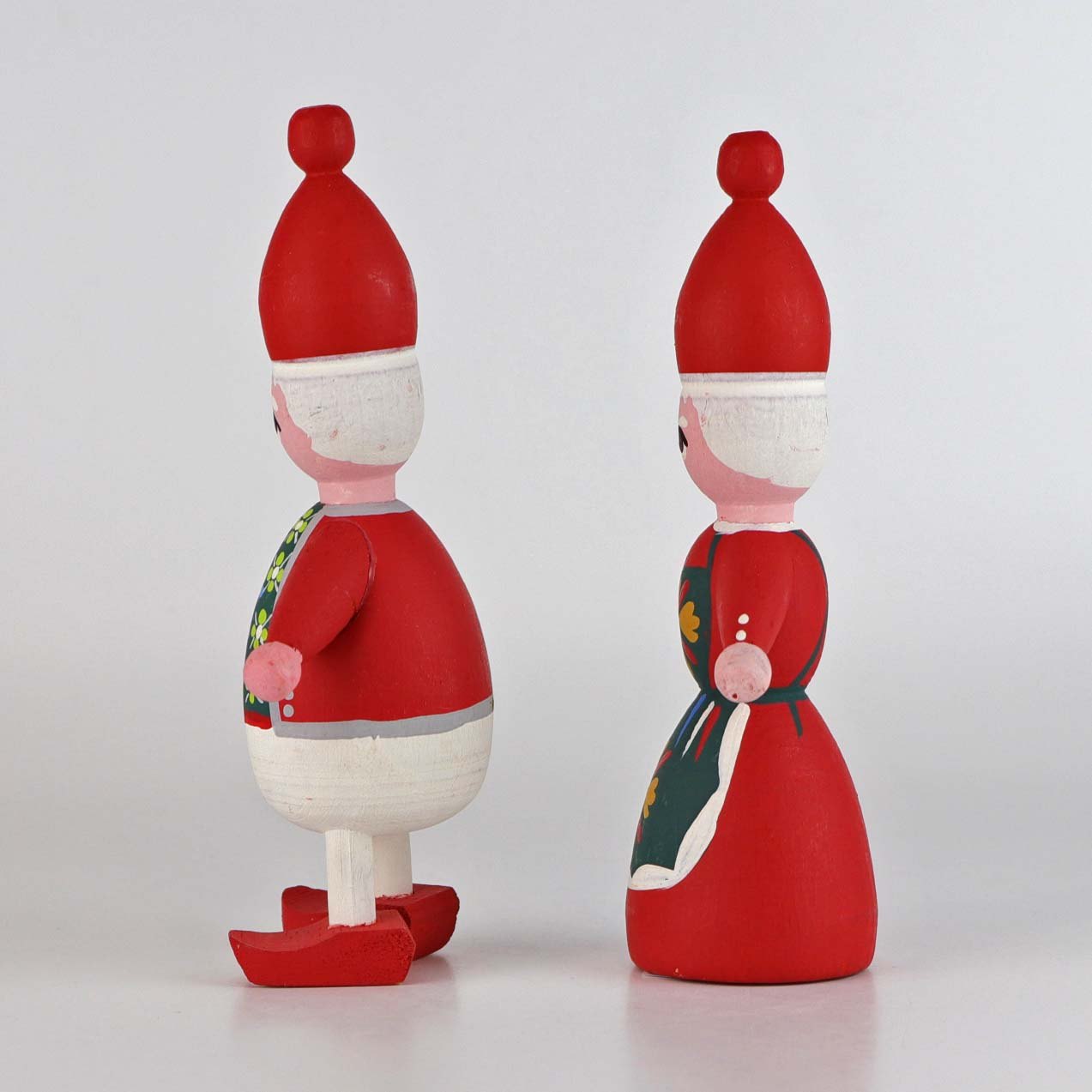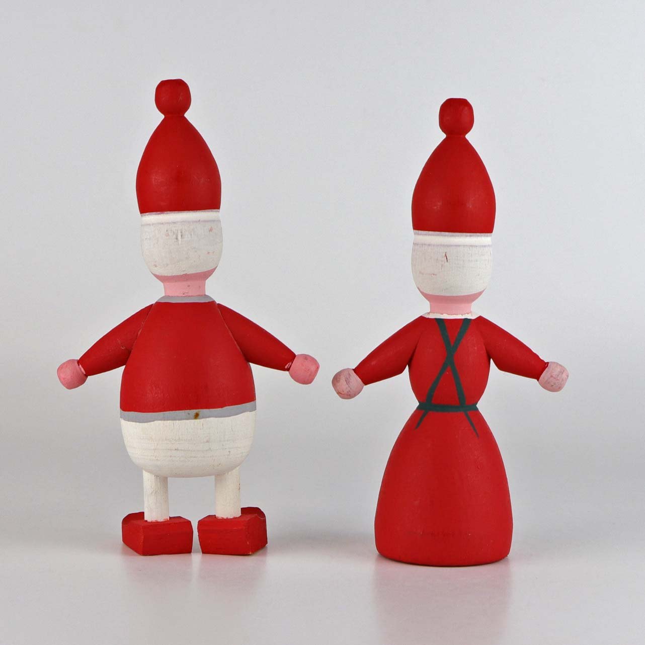 Et sæt håndmalede figurer i træ med motiv af nissefar og nissemor